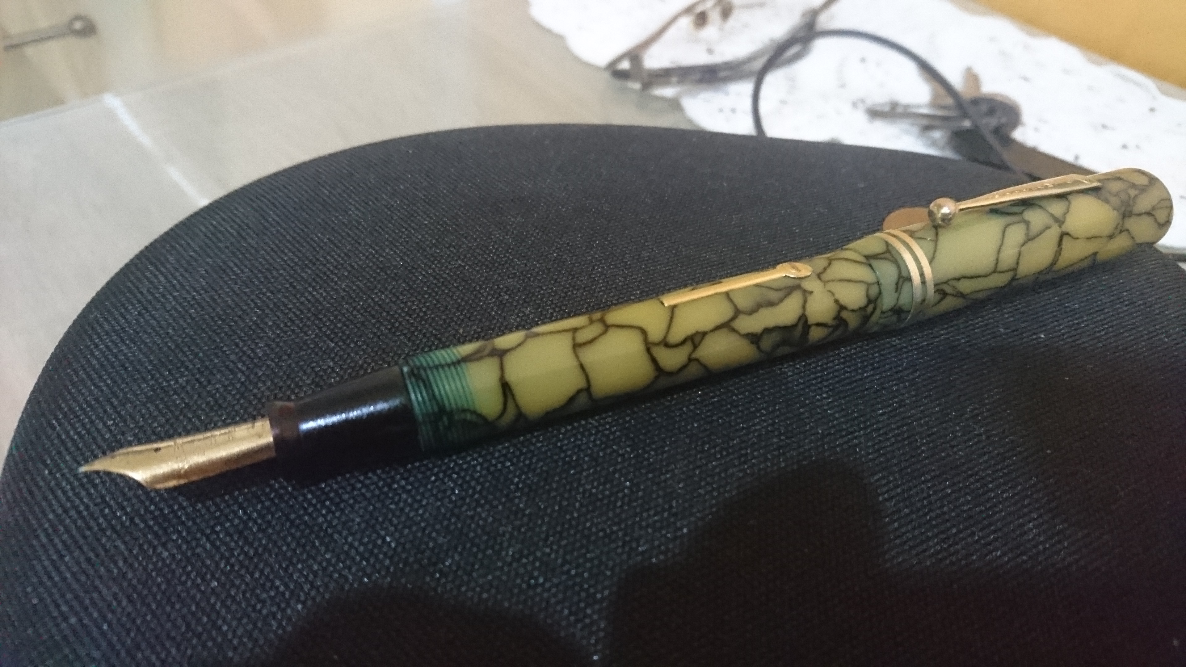 Il problema non è pennino ed alimentatore ma la celluloide chiara che in corrispondenza della filettatura si è colorata. La penna è stata in ammollo per qualche ora in una soluzione di acqua e candeggina, è stata poi strofinata con uno spazzolino, ma il colore sembra irrimediabilmente virato.