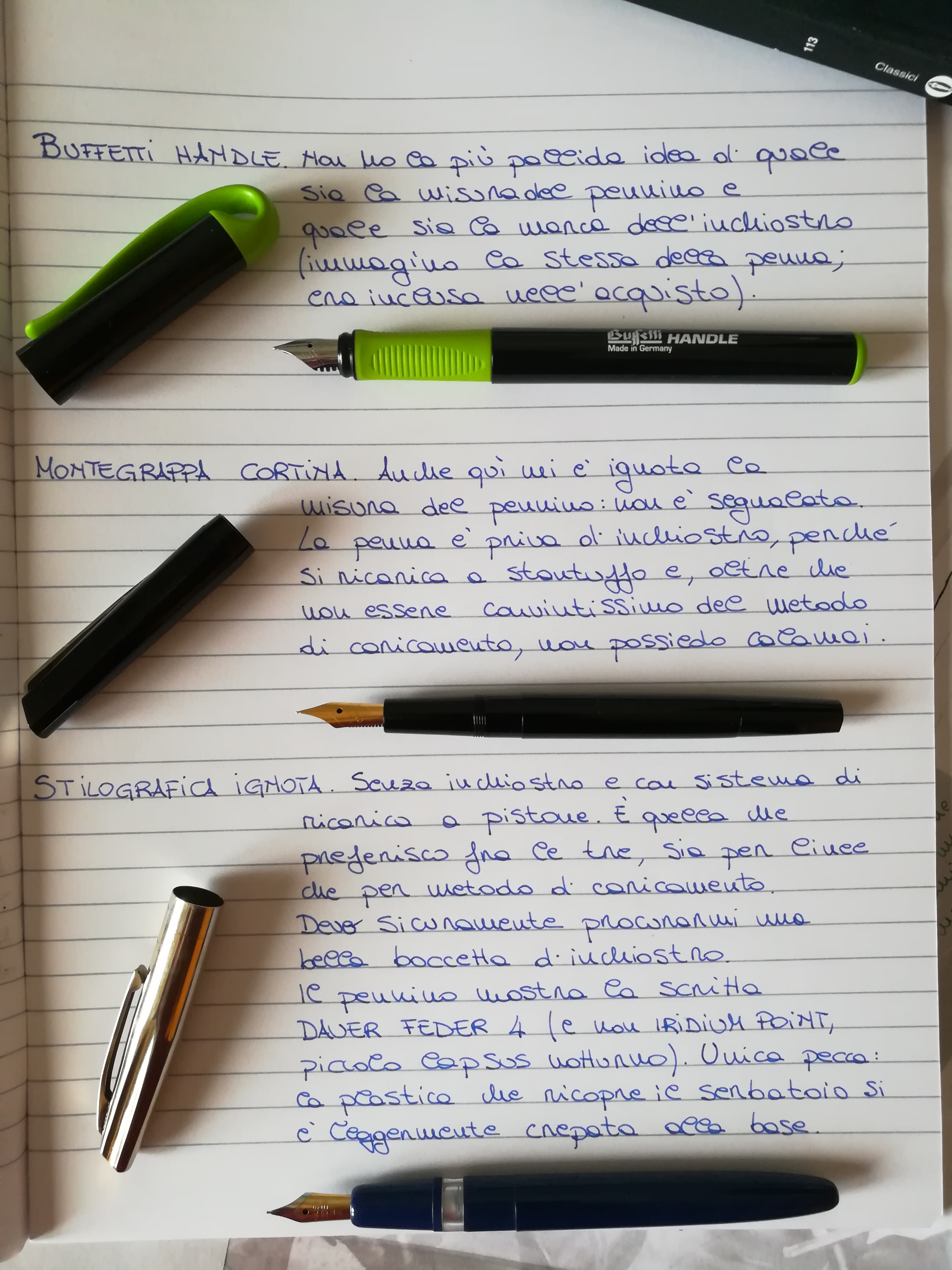 1.- La Buffetti Handle è di produzione Schneider, e condivide alimentatore, pennino (robustissimo, di misura M) e impugnatura con la Schneider Smart e con le varie Inx-Sportive (delle Smart più colorate). Grossomodo condivide anche il prezzo (circa 6 euro) per me spesi incredibilmente bene. L'inchiostro, anche, è di produzione Schneider, molto delicato su moltissime carte comuni (non trapassa il foglio), piuttosto profondo, cancellabile, e la boccia da 100 cartucce si trova a 4 euro.