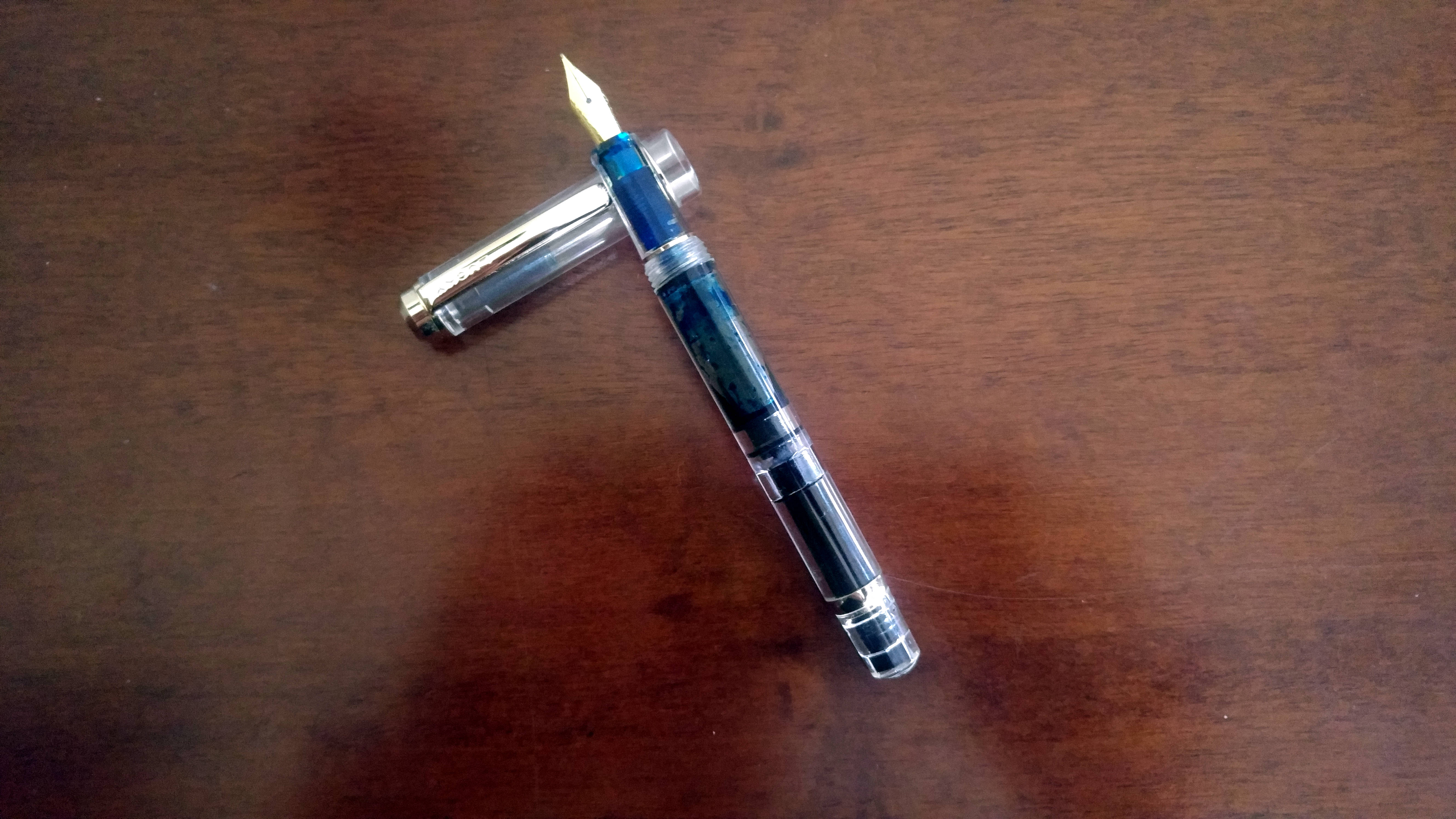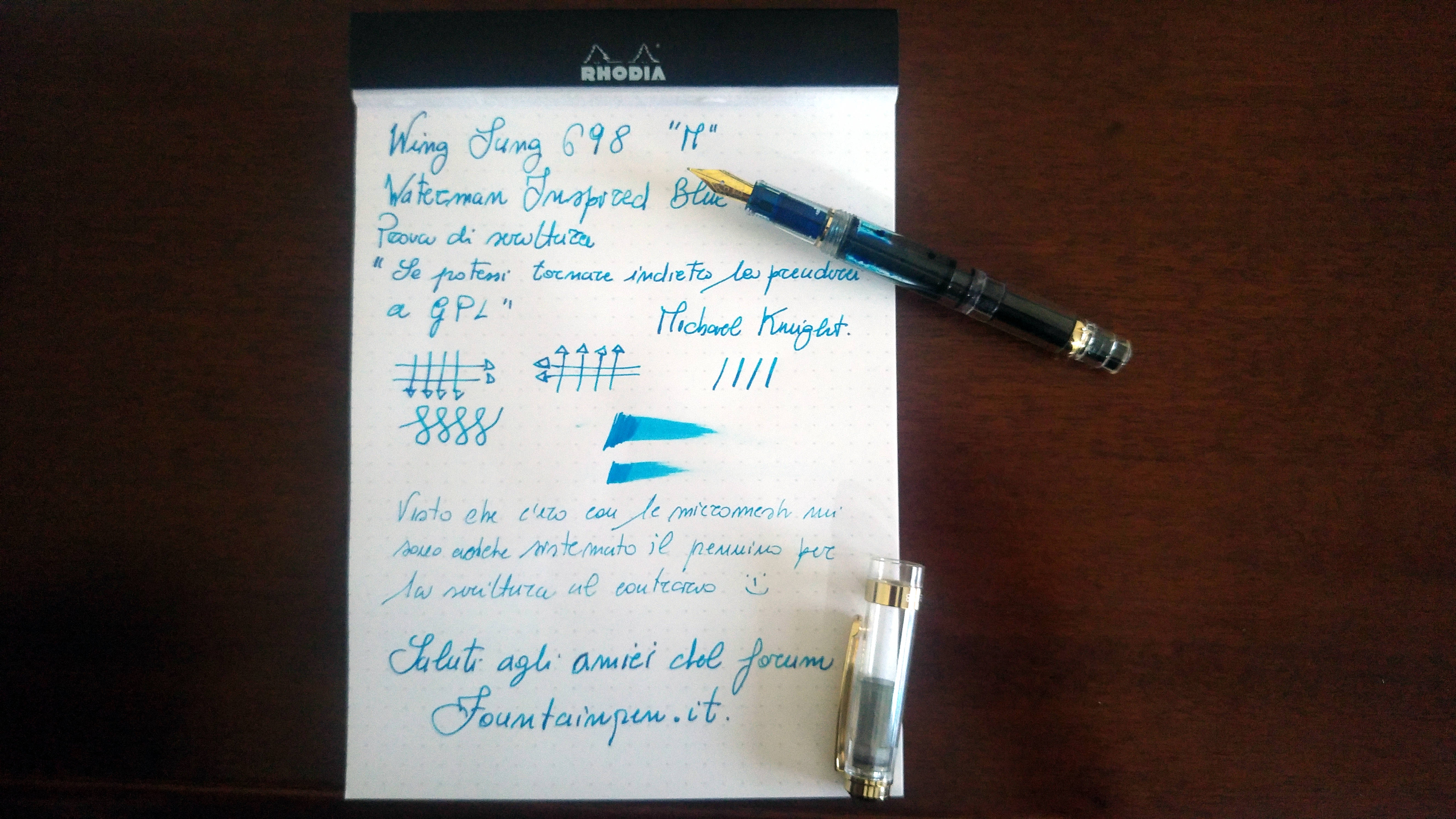 Decisamente una demonstrator con caricamento a pistone a questo prezzo è decisamente allettante, oltretutto è completamente e facilmente disassemblabile per pulire e manutenere la penna, ed il meccanismo di caricamento funziona bene. Siamo comunque di fronte ad una penna in umile plastica, a differenze di alcune nuove demonstrator Cinesi in resina, non è tuttavia una penna piccola e da un ottimo senso di solidità: la 698 è lunga 142 mm chiusa e 131mm aperta e pesa 25 gr carica, il cappuccio a vite è meglio non inserirlo sul fusto quando si scrive, cade via facilmente, almeno nel mio esemplare. La riserva di inchiostro è notevole e con il pennino da 0.5mm in dotazione potrebbe scrivere per svariate settimane. Dicevo potrebbe non a caso, perché la mia acquistata a dicembre del 2017, non ha mai scritto granché. Credo che il problema delle cinesi, specialmente queste in fascia mid-entry level, è l’inconsistenza del prodotto finale, insomma comprarle è un po' una lotteria: a volte scrivono molte volte no!
