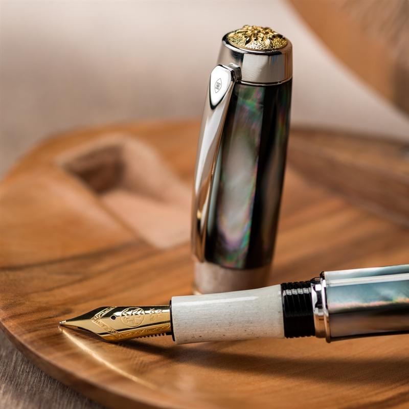 La penna è composta da 14 tessere di Madreperla Nera di Tahiti di primissima scelta, lavorate completamente a mano; la sua unicità sta però nella scolpitura del materiale, che la sagoma perfettamente.