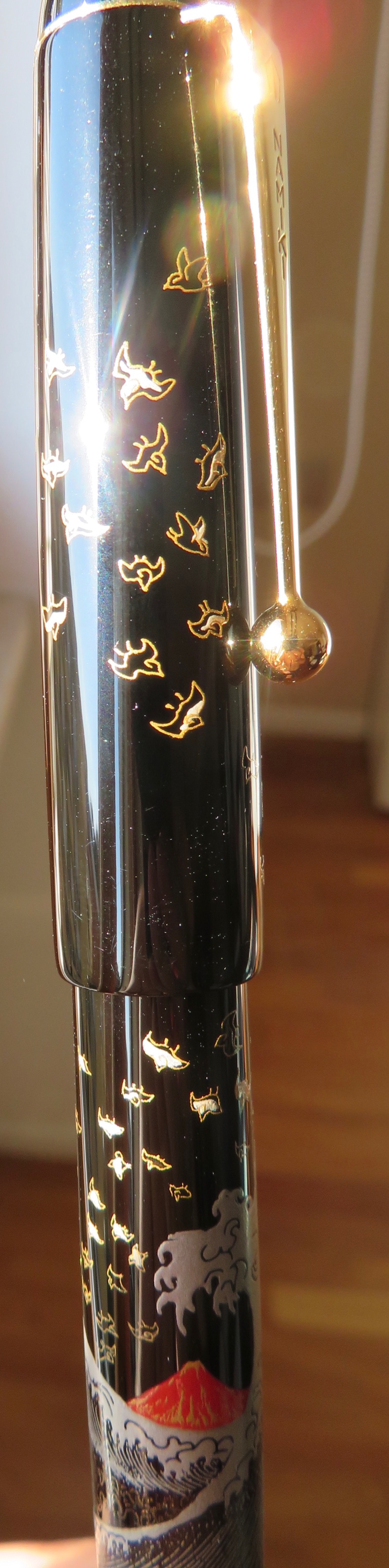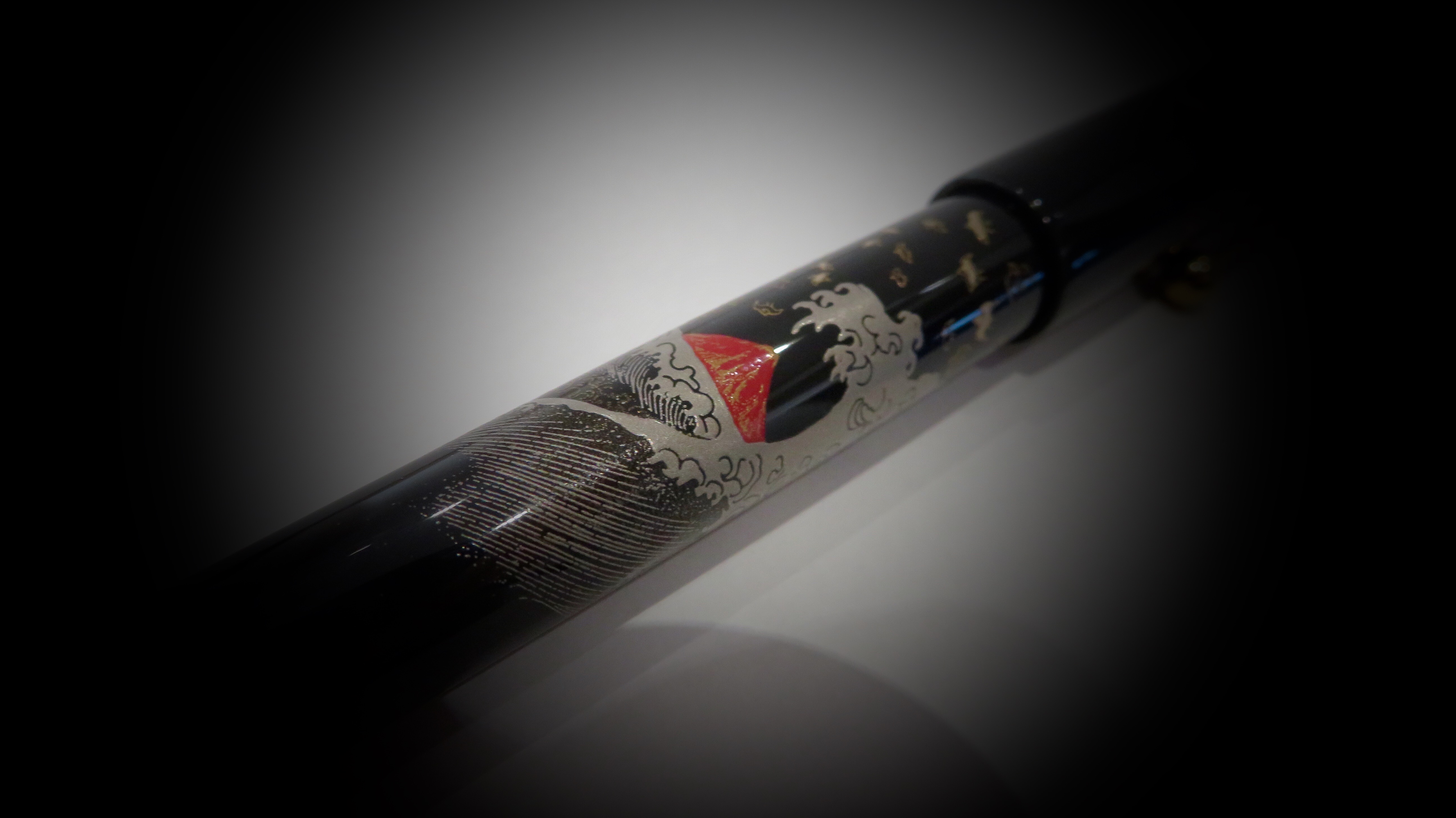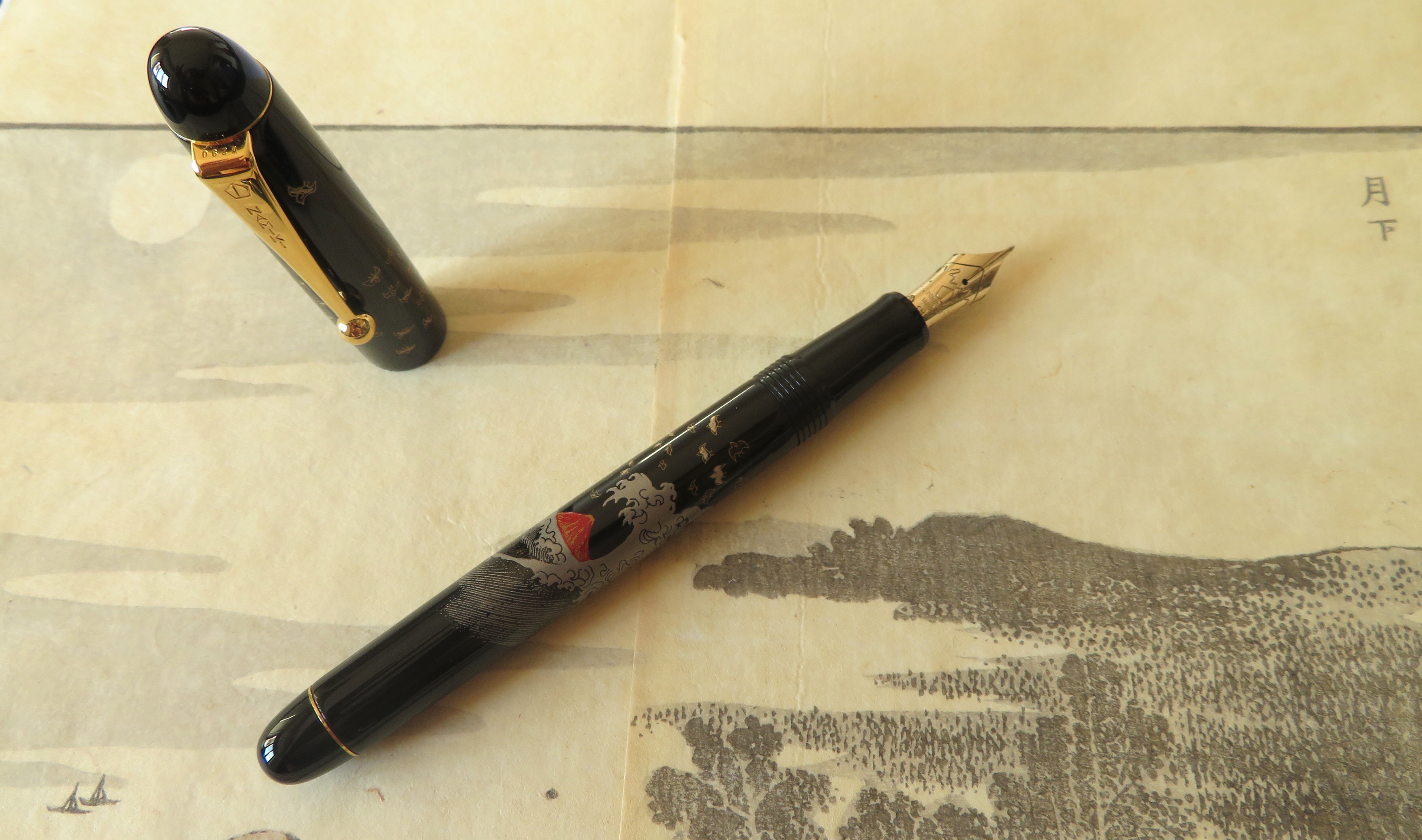Giunge il momento di presentarvi il regalo di compleanno stilografico di mia moglie, che quest’anno mi pare abbia saputo cogliere particolarmente bene il punto in cui il mio interesse per la stilografica e quello per la cultura giapponese, ed in particolare per le stampe di Katsushika Hokusai s’incontrano: una Maki - e di Namiki, con sopra il Fuji rosso e la grande onda! Un delirio da far girare la testa! Il nero brillante del fusto in lacca Urushi (incredibilmente compatto e leggero, come non avrei mai creduto prima di impugnarlo) si anima degli uccelli che sciamano, ognuno con propria traiettoria, sulla scena del monte Fuji visto dal largo del mare in tempesta, che simboleggiava, all’epoca del maestro Hokusai, il misto di curiosità, apertura e paura con cui i giapponesi del periodo Edo vedevano il mondo fuori, bello e vietato dalla politica degli Shogun Tokugawa, pieno di attrattive per le nuove cose che lì accadevano, e pericoli per la rapacità occidentale, rischi e occasioni, come lo è il mare per i naviganti, o per gli isolani. Cose che so in quanto Musashi (io, modestamente, nel periodo Edo ci vivevo, ho anche partecipato alla battaglia di Sekigahara
