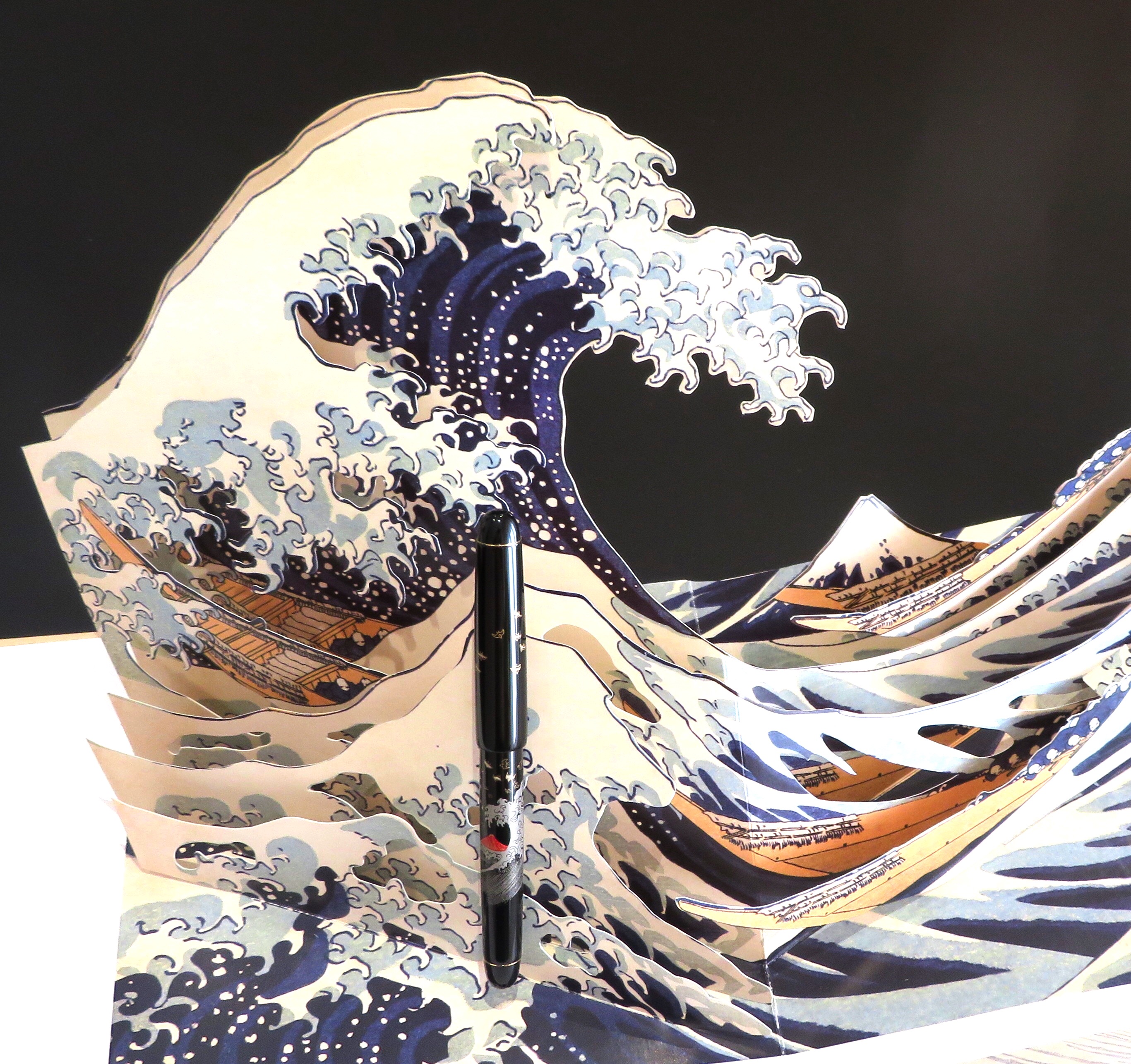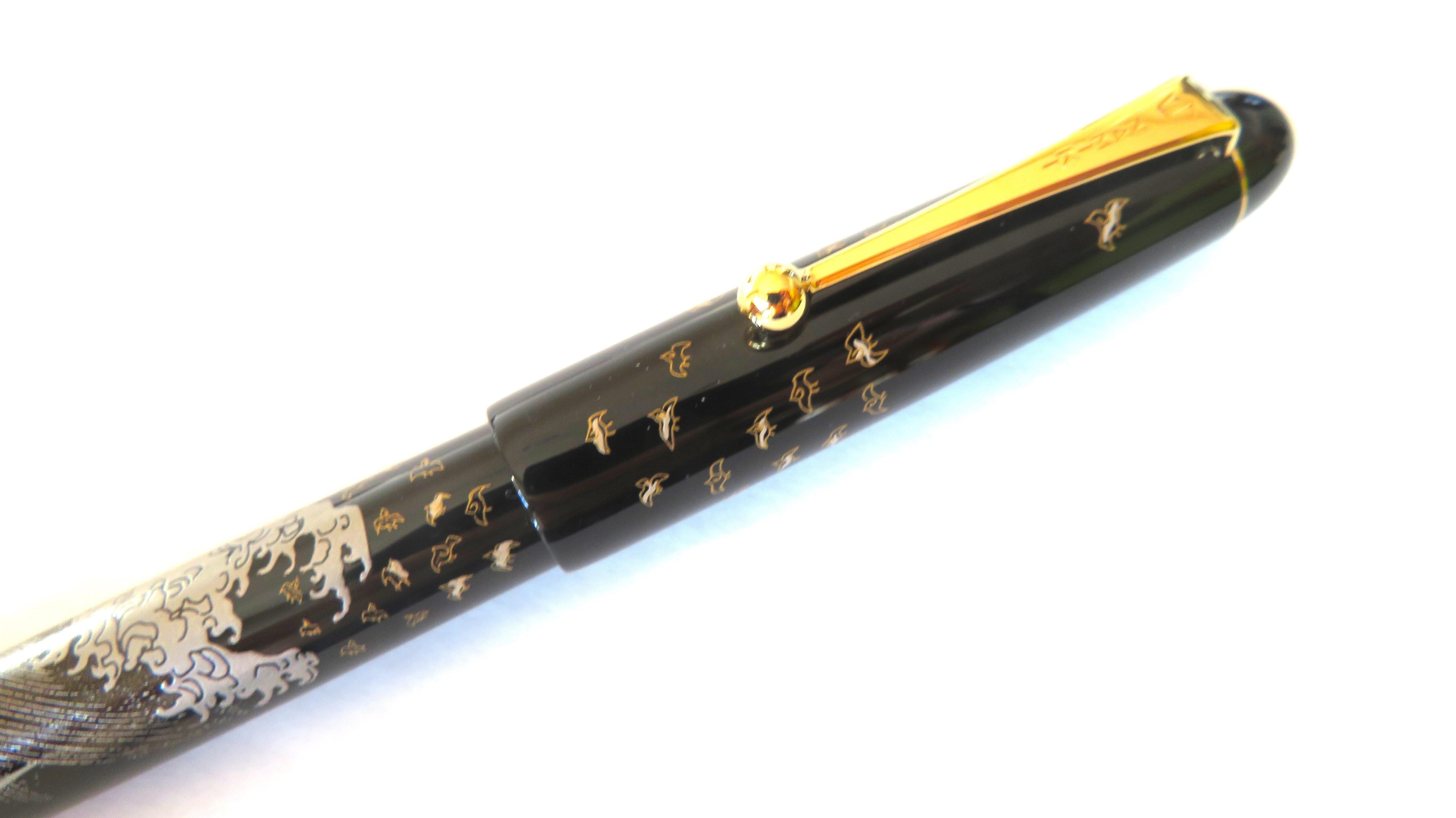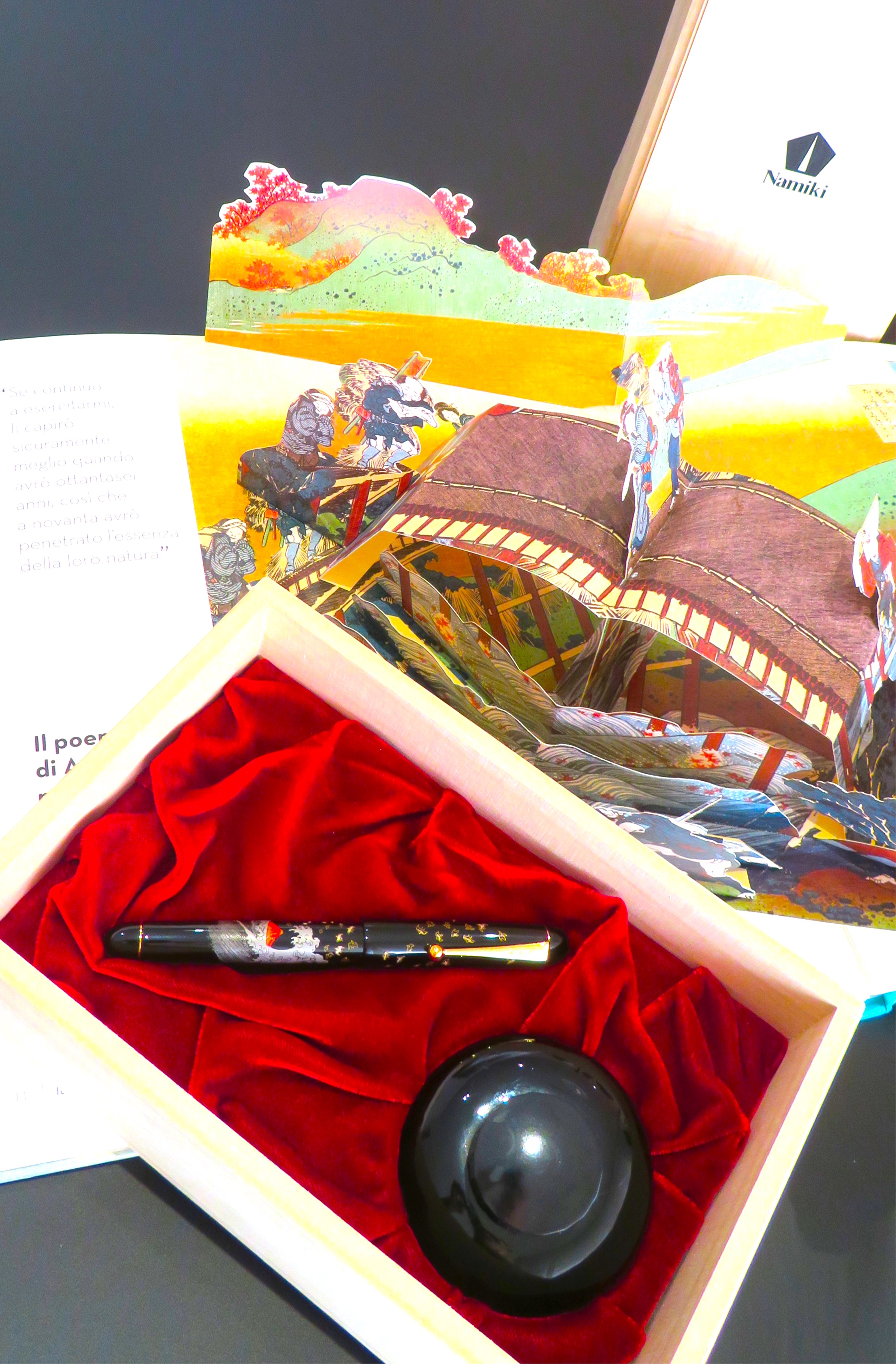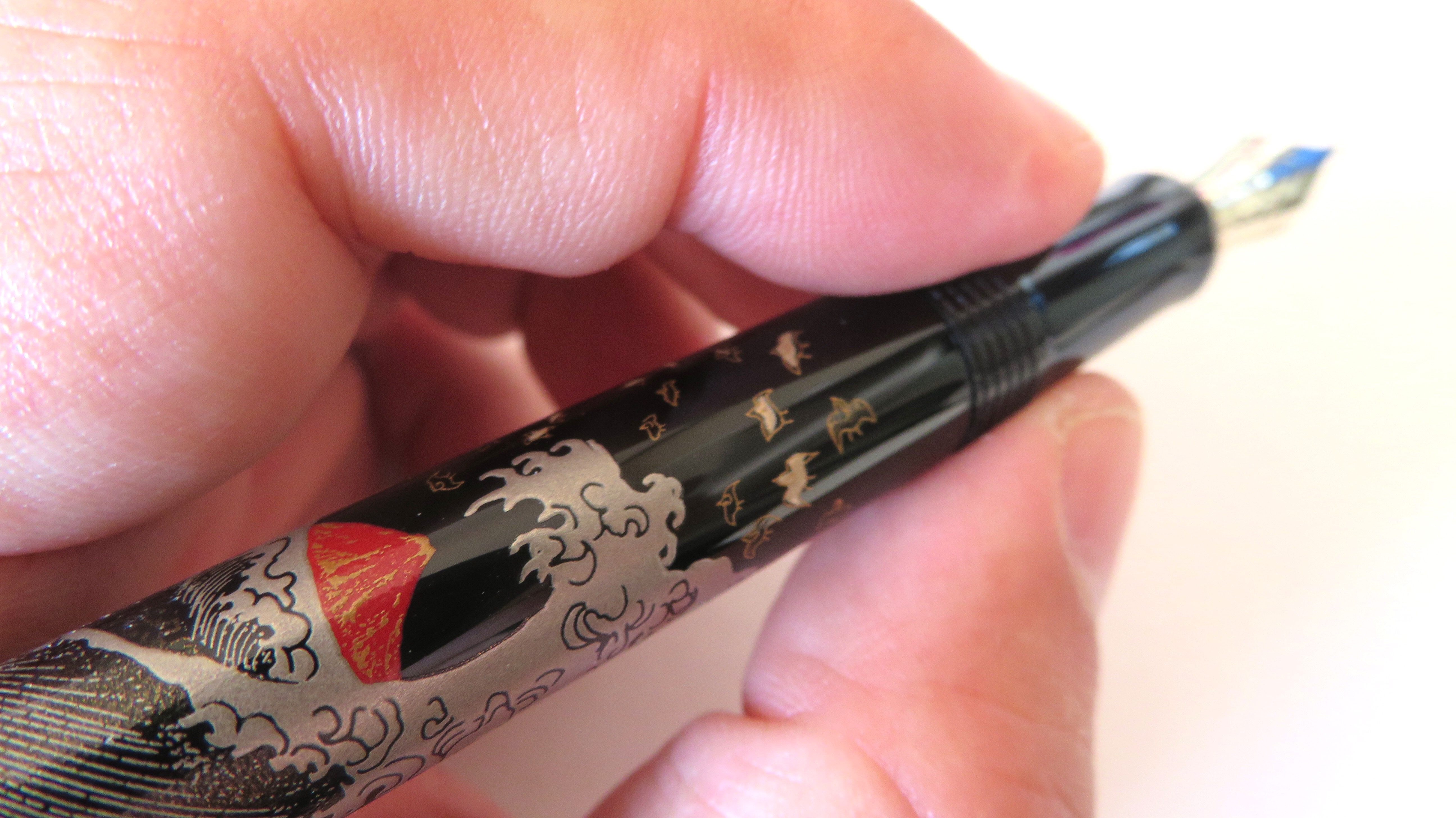 Giunge il momento di presentarvi il regalo di compleanno stilografico di mia moglie, che quest’anno mi pare abbia saputo cogliere particolarmente bene il punto in cui il mio interesse per la stilografica e quello per la cultura giapponese, ed in particolare per le stampe di Katsushika Hokusai s’incontrano: una Maki - e di Namiki, con sopra il Fuji rosso e la grande onda! Un delirio da far girare la testa! Il nero brillante del fusto in lacca Urushi (incredibilmente compatto e leggero, come non avrei mai creduto prima di impugnarlo) si anima degli uccelli che sciamano, ognuno con propria traiettoria, sulla scena del monte Fuji visto dal largo del mare in tempesta, che simboleggiava, all’epoca del maestro Hokusai, il misto di curiosità, apertura e paura con cui i giapponesi del periodo Edo vedevano il mondo fuori, bello e vietato dalla politica degli Shogun Tokugawa, pieno di attrattive per le nuove cose che lì accadevano, e pericoli per la rapacità occidentale, rischi e occasioni, come lo è il mare per i naviganti, o per gli isolani. Cose che so in quanto Musashi (io, modestamente, nel periodo Edo ci vivevo, ho anche partecipato alla battaglia di Sekigahara