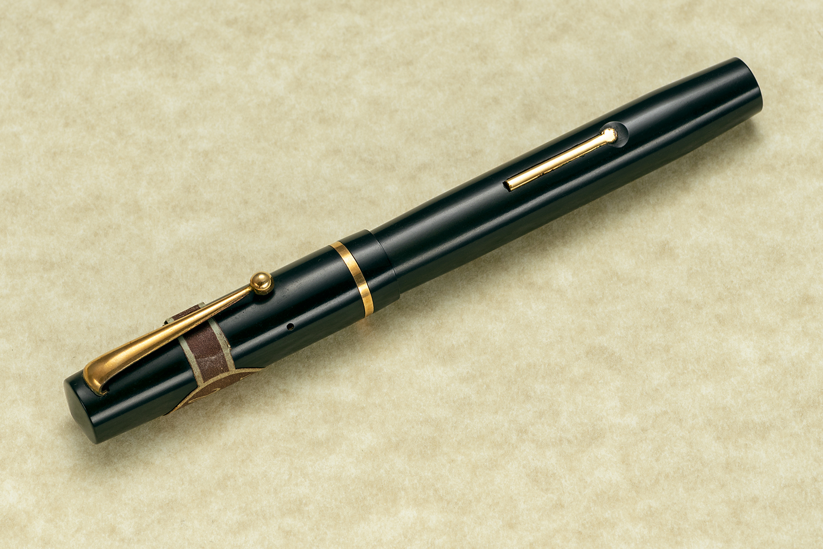 La penna in questione è il modello n°44, un modello prodotto intorno agli anni 40, il corpo della penna è realizzato in plastica nera con finiture dorate, la confezione di cartoncino rivestita con carta, credo sia la testimonianza di una penna che nasce come oggetto di fascia media / economica; all'interno della confezione di cartoncino c'è un foglietto relativo alle istruzioni.