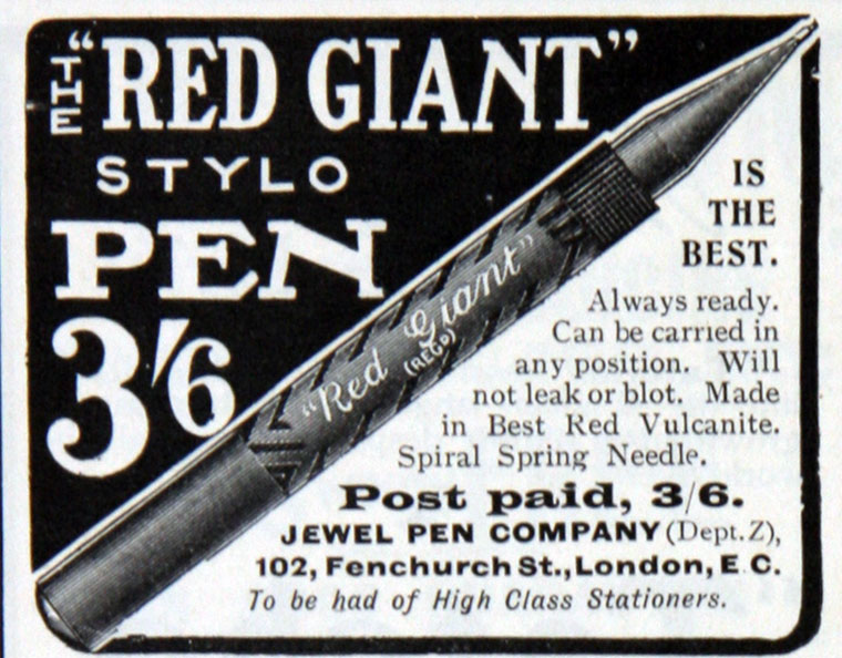 1922 Listed Exhibitor. Manufacturers of Fountain Pens, Stylographic and Gold Pens, and Sealing Wax. Sole makers and patentees of "Jewel," "Recorder," "Red Giant" Pens. (Stand No. K.84)