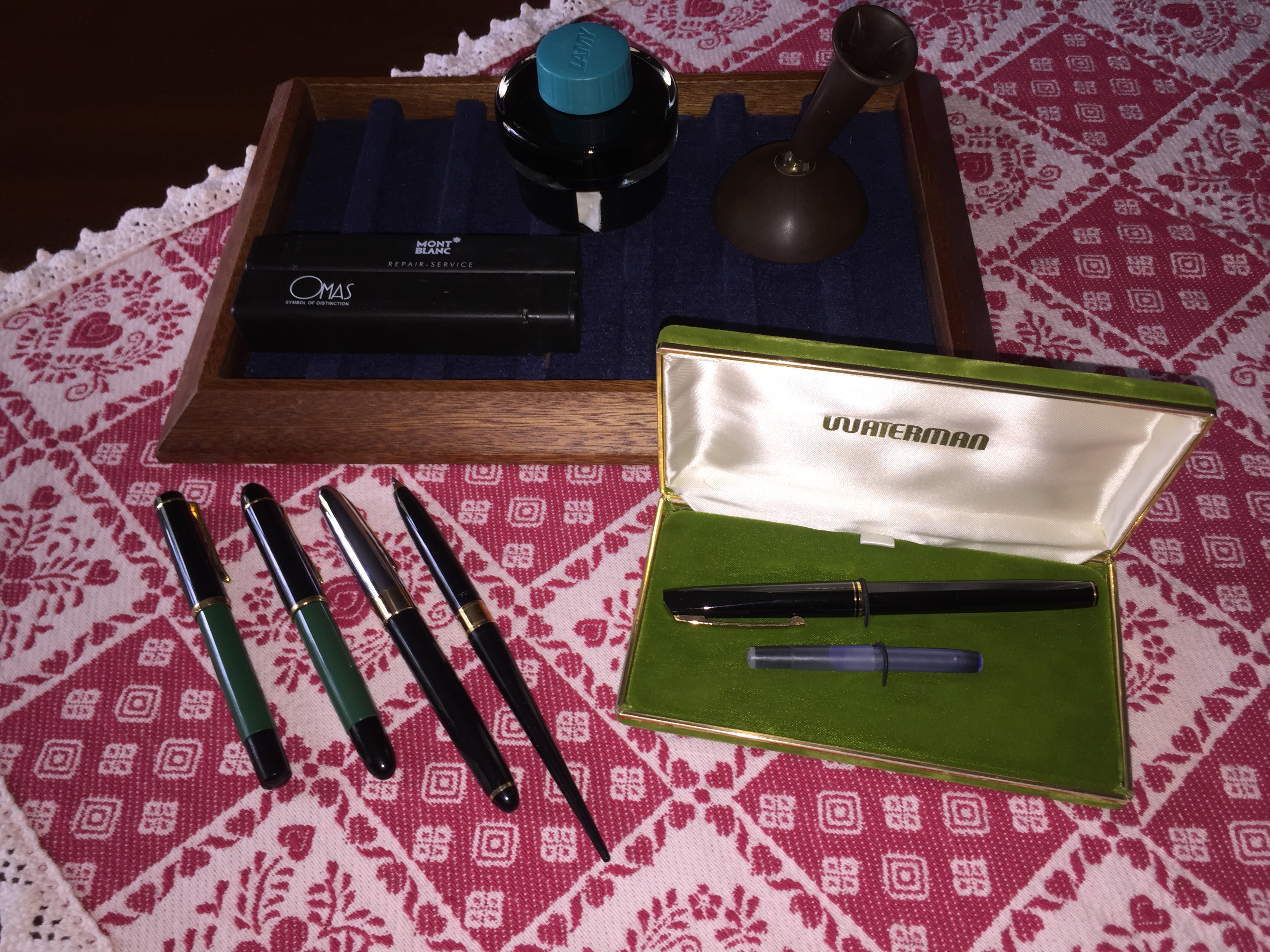 porta penne per 12 posti; flacone inchiostro Lamy turchese; due scatoline in plastica per pezzi di ricambio per penne, marchiati Omas e MontBlanc; base per stiloforo (porta penne singolo), marchiato Soennecken, in pura arte Bahaus, suppongo anni 20/30; Waterman Concord, nuova nella sua confezione originale; Pelikan 120 e 150 in buone condizioni; Penco 53, caricamento funzionante; penna biro per stiloforo Sheaffer; Aurora Ypsilon praticamente mai inchiostrata; una Aurora 88 Slim in ottimo stato, cappuccio in argento, caricamento cartuccia/converter; ed infine una MontBlanc 144 Solitaire in argento, usata, in buono stato con la dicitura Made in W. Germany. Successivamente una nuova ricerca ha fruttato: tre stilofori Omas Extra con pennino in oro 585 marchiato Omas in ottime condizioni; Pelikan M400 con scatola ed inchiostro mai usata, databile anni 80; Pelikan 120 e M150 in discrete condizioni. Ecco le foto di rito.