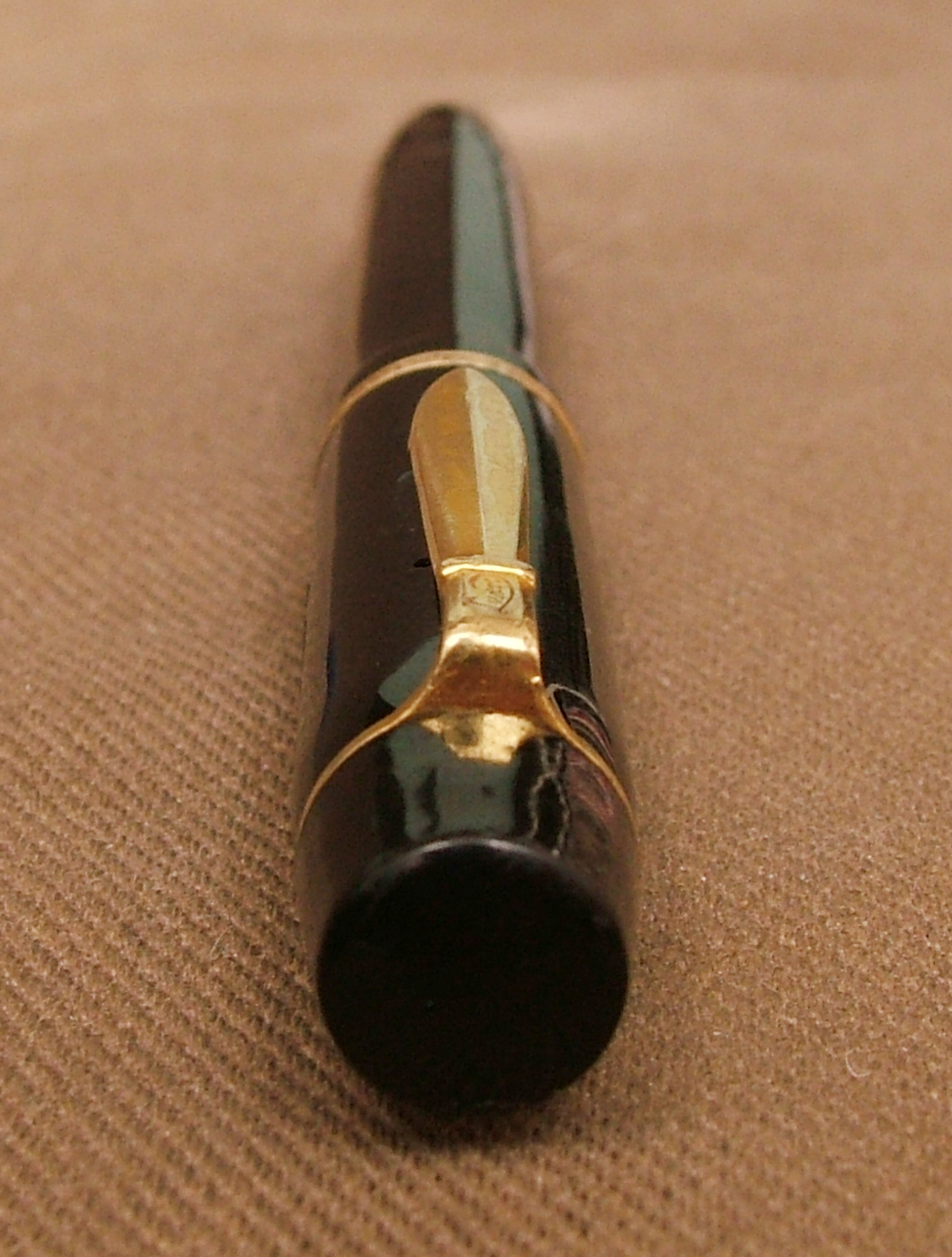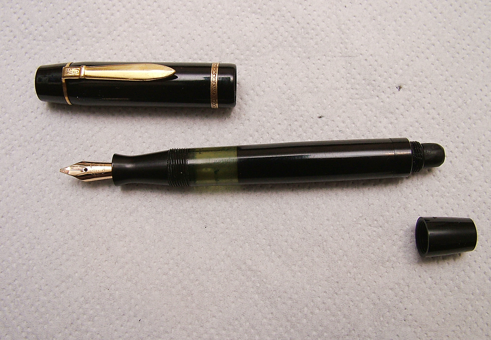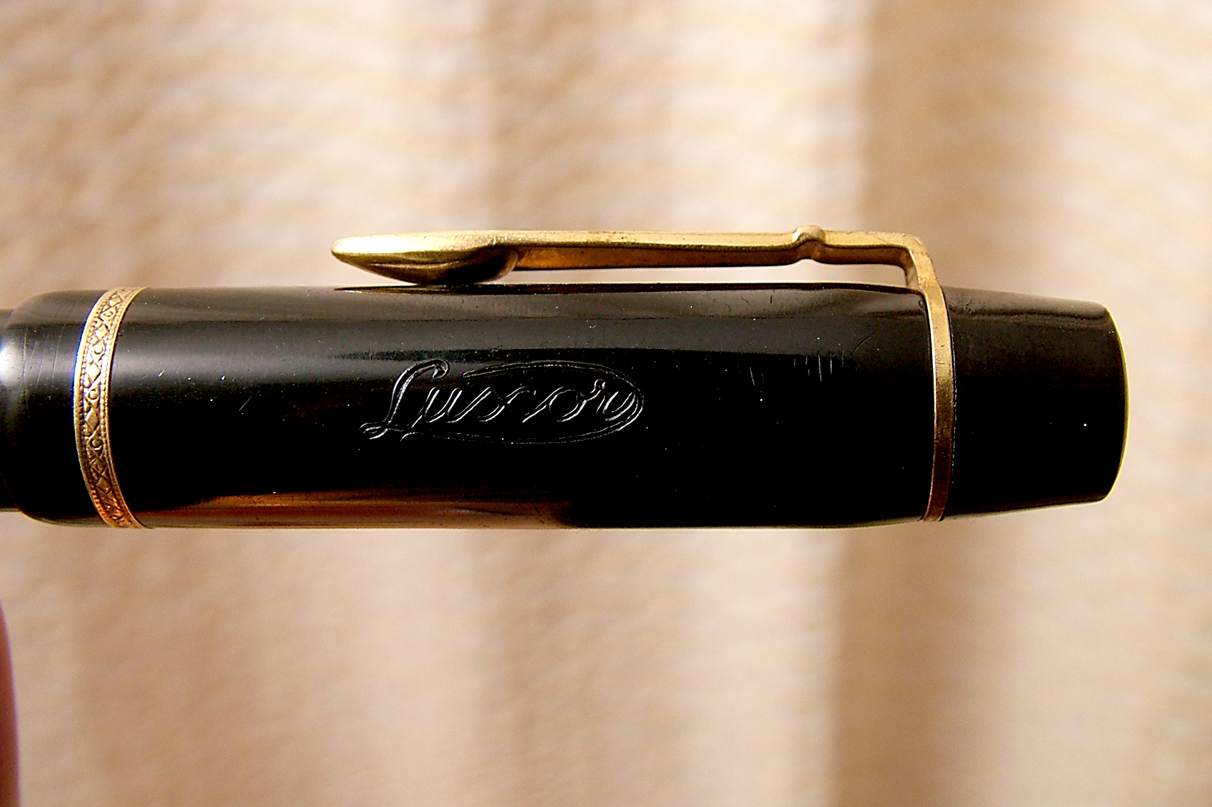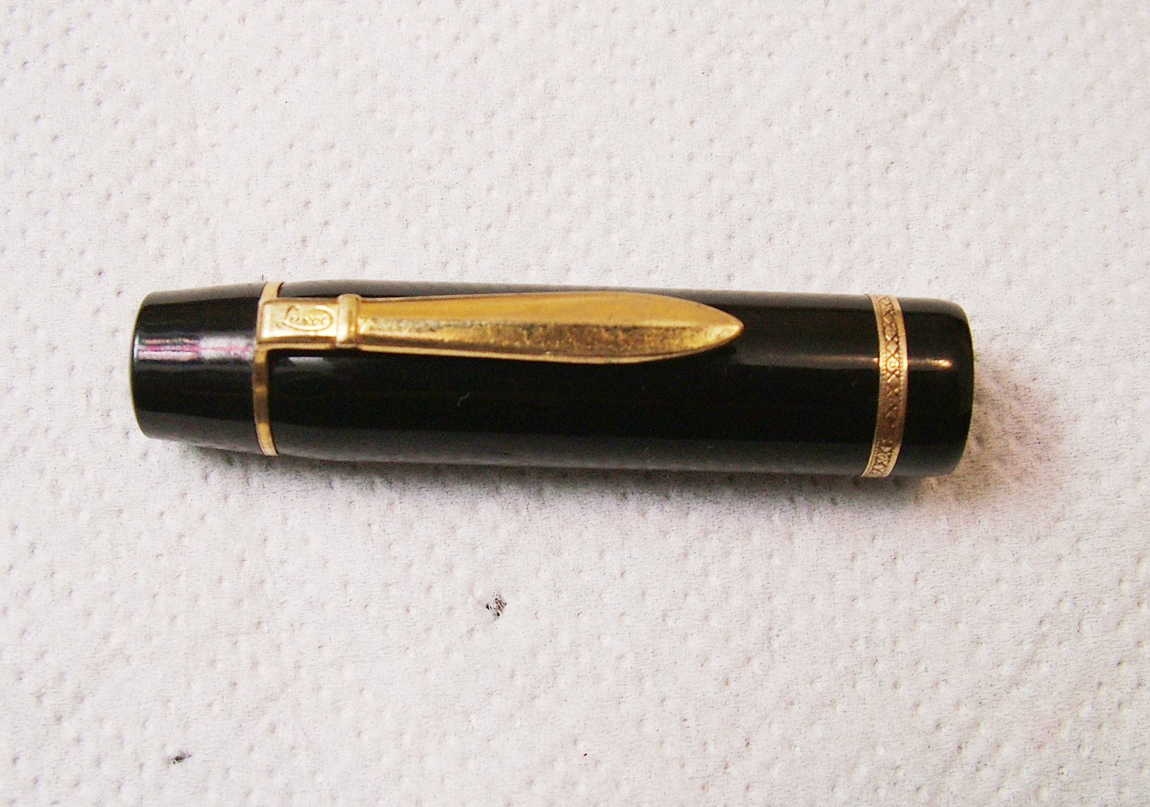 Vi presento una penna di chiaro stile teutonico molt sobria e robusta ma purtroppo sfortunata, con pistone bloccato nel suo alloggiamento , credo don sia il suo oppure la sede si è ristretta impedendone ogni movimento (nella sezione tecnica mostrerò la sua riparazione).Particolare la clip a spada con inciso sull' elsa Luxor e la vera sul cappuccio finemente lavorata.