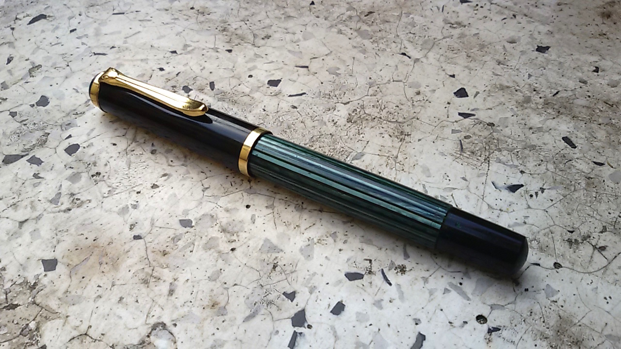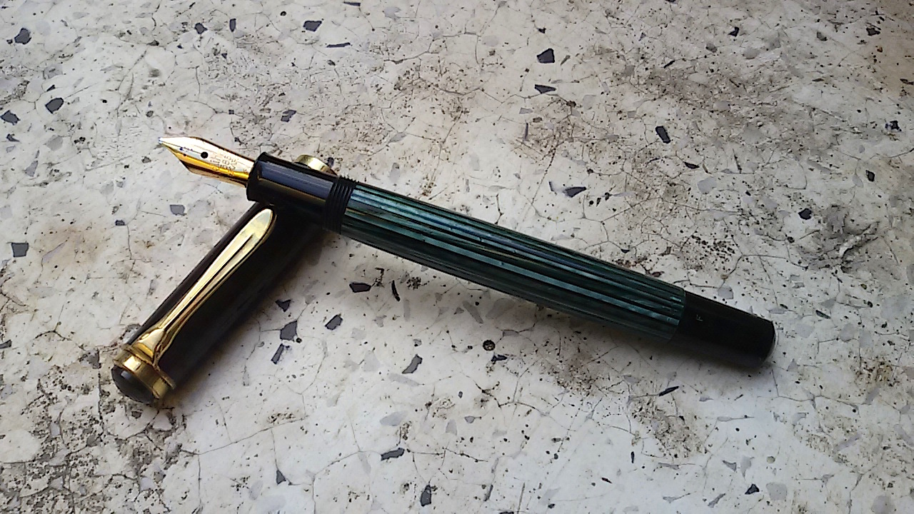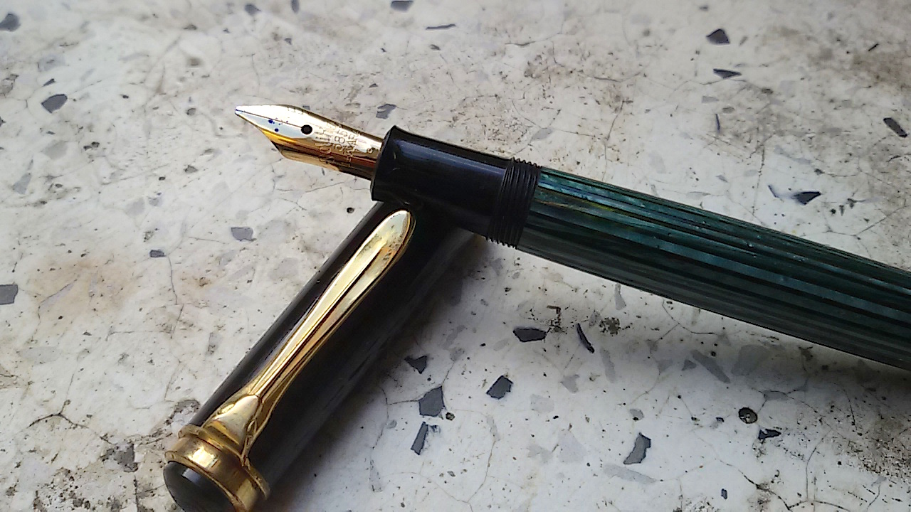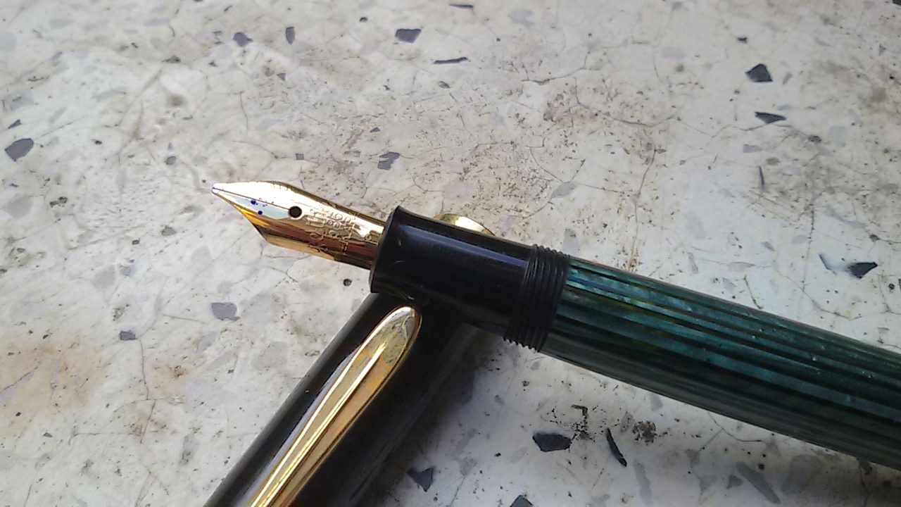 Adoro queste Pelikan, le trovo penne sempre affidabili, veri carro armati della scrittura. Questa Pelikan 400 dovrebbe risalire ai primissimi anni cinquanta, monta la prima versione del pennino della serie 400 che non reca ancora la misura del tratto.(si vede solo un piccolo circolo). Fortunatamente la mia è equipaggiata con un meraviglioso broad-doppio broad con il quale è favoloso scrivere; è bastato smontare il pistone, dare una bella lavata a tutte le componenti e passare un velo di grasso al silicone sulla guarnizione, carica una buona quantità di inchiostro e permette di scrivere per un bel po'.