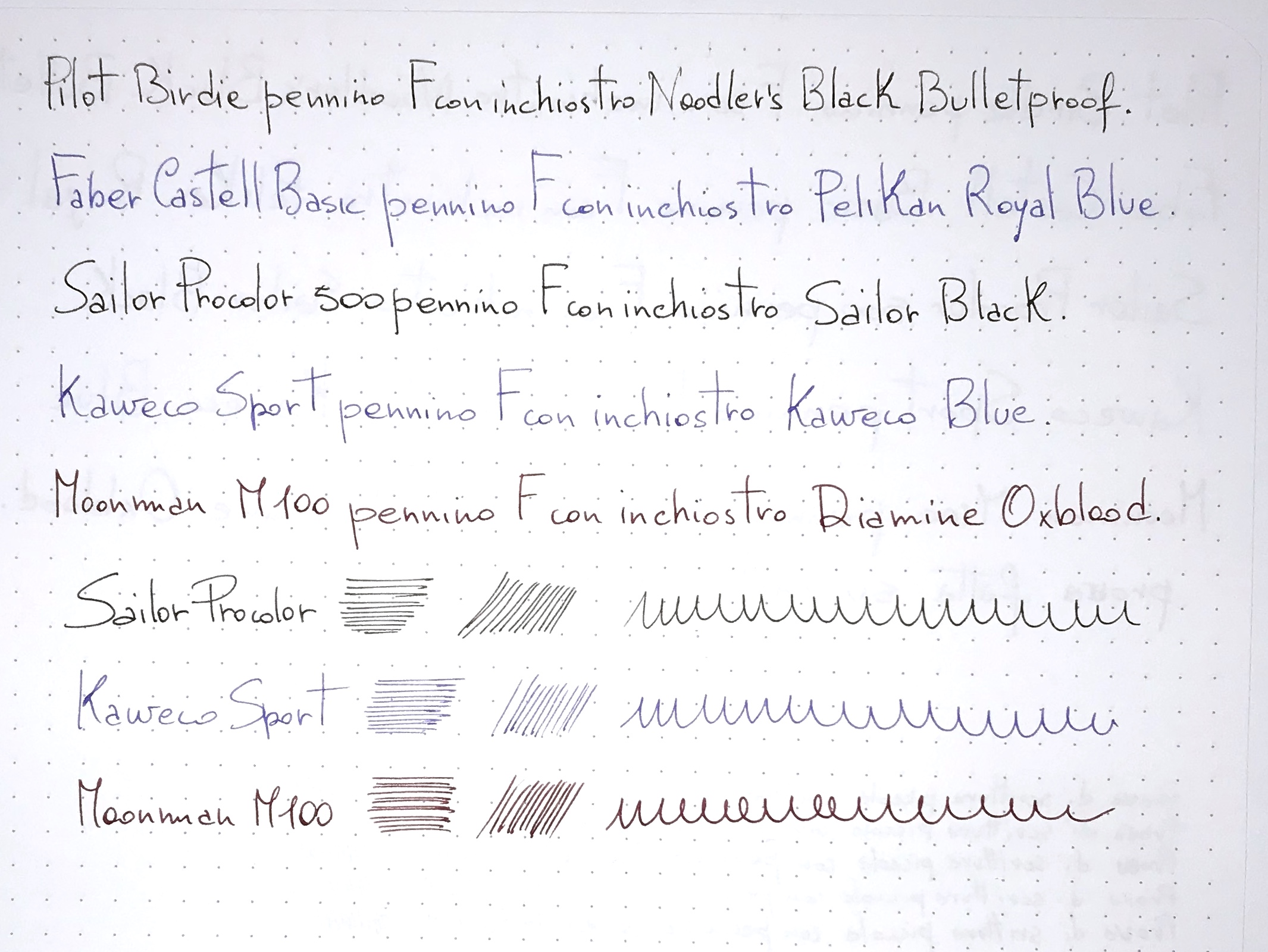Come promesso ecco il confronto tra i tratti della Moonman della Sailor e della Kaweco Sport. Ho scritto con tutte come faccio di solito con pochissima pressione. La Moonman è alla prima carica e il converter poteva contenere qualche gocciolina d’acqua. Gli inchiostri della Sailor e della Kaweco sono quelli in dotazione alla penna al momento dell’acquisto e di cui non conosco il nome preciso.