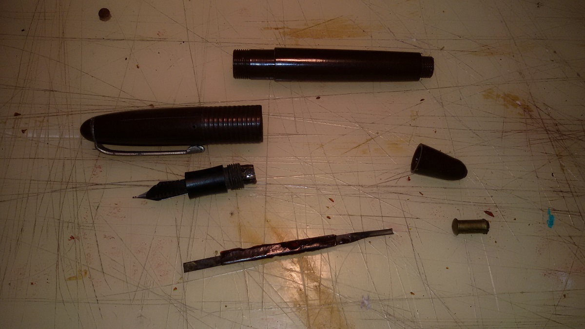 Per cominciare mostro le immagini di una stilografica di cui sono in possesso: Credo si tratti di un modello scolastico economico, è in plastica,leggera, con quello che dalla sezione "tecnica" del sito sembra un caricamento con tappo di fondo. Il pennino è in metallo bianco con la scritta: "Liberty 4" smontandola: il tappo di fondo è in metallo giallo. e dentro c'era la barretta metallica di pressione che è venuta fuori sbattendo leggermente il fusto della penna. nel fusto, alla base del gruppo pennino e attaccata alla barretta metallica c'erano e ci sono delle incrostazioni scarlatte, sembra lacca.