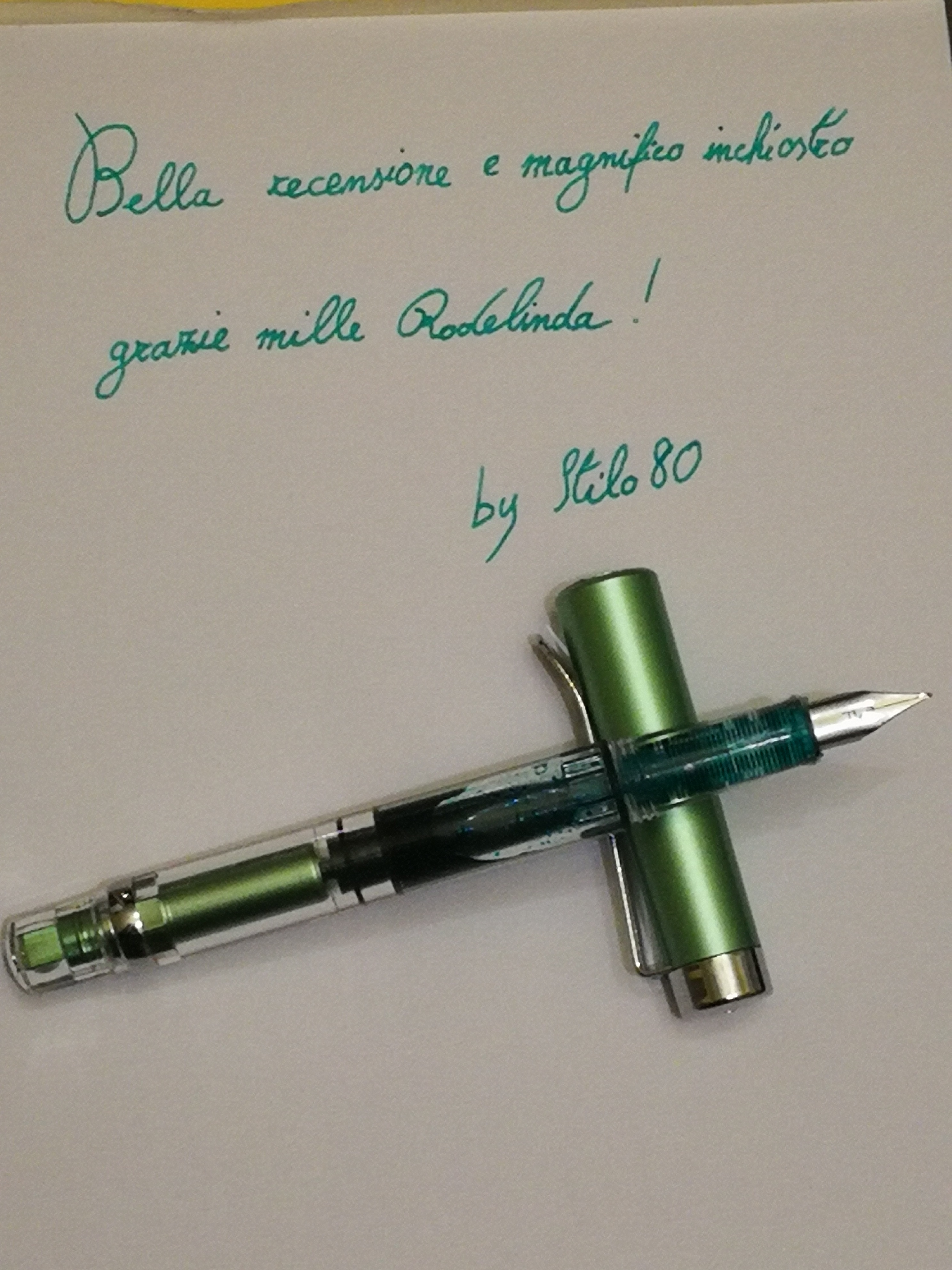 Si tratta di un inchiostro dal colore particolarissimo, esattamente al confine tra il turchese e il verde acqua, che ho cercato in lungo e in largo per monti e per valli per caricarlo sulla mia stilografica Tiffany Tesoro. Ciò solo dopo averlo lungamente confrontato con altri prodotti offerti dal mercato, al fine di accertarmi della piena corrispondenza della tinta.