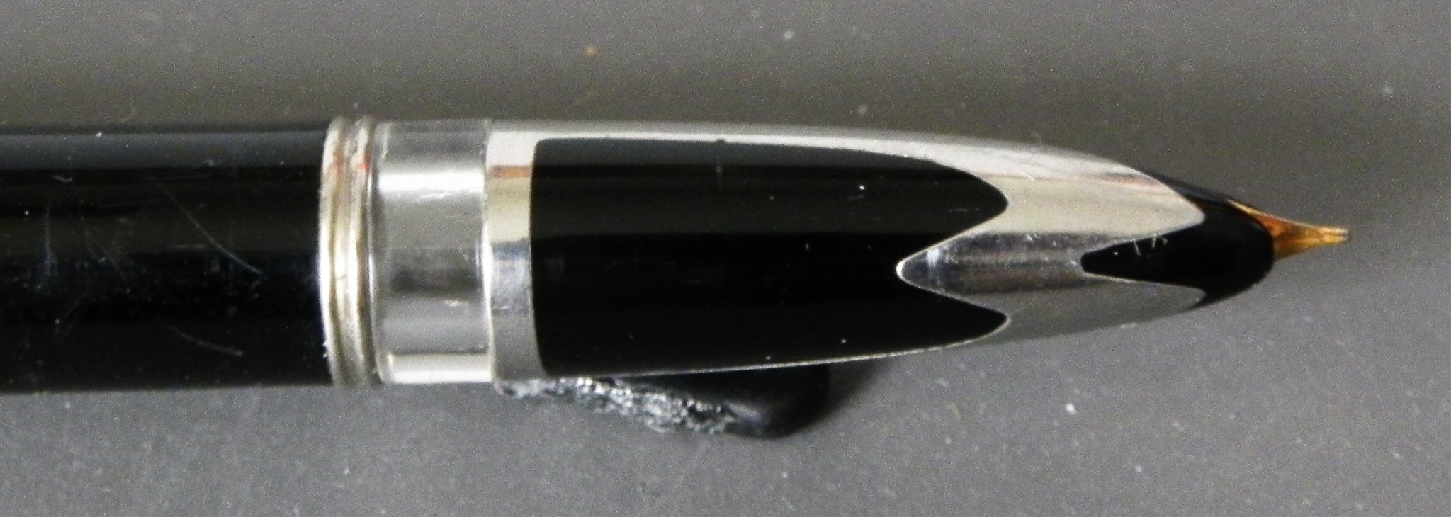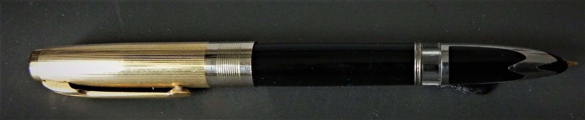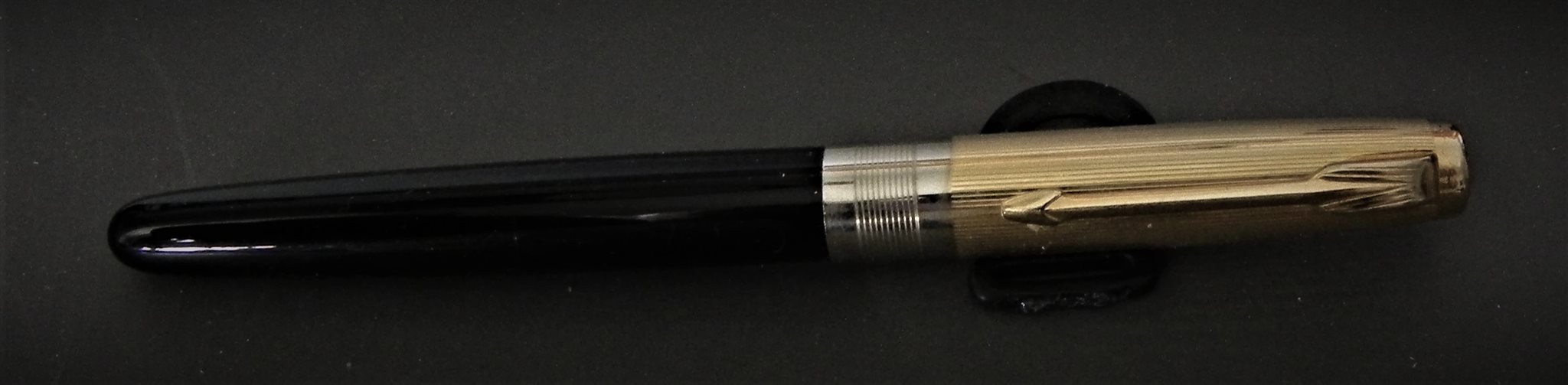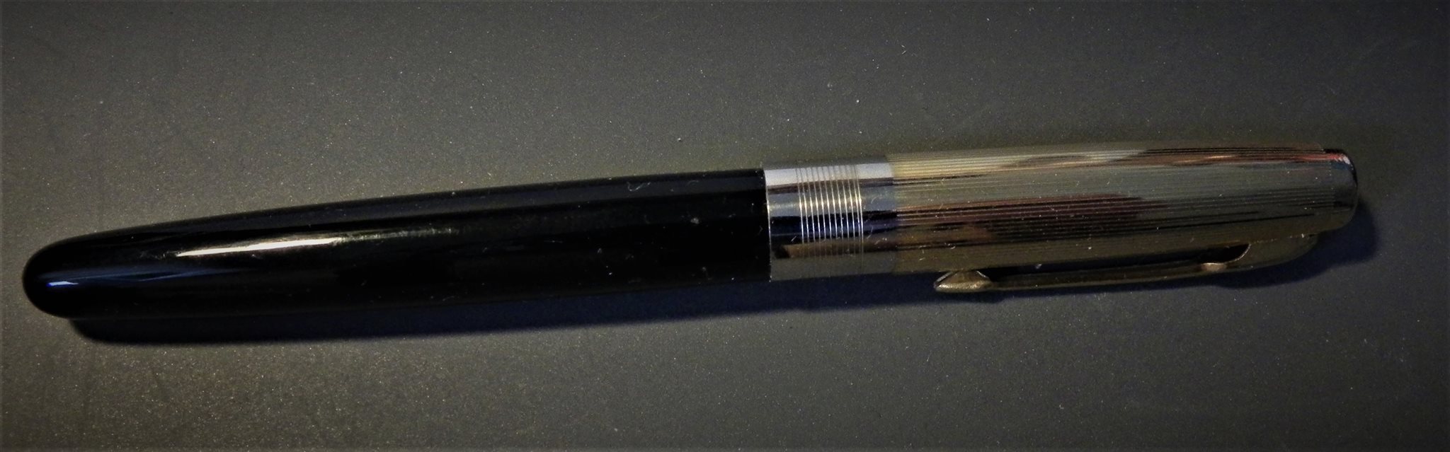 Direi scolastica prima metà degli anni '60, come hai scritto giustamente: clone Parker 51, caricamento a pompetta, finestrella trasparente, pennino di acciaio con punta ritorta senza iridio, tutto quadra. Ce n'era una infinità, prodotte da ditte minori per il mercato studentesco con nomi di fantasia. Io ne ho qualcuna, e ti dirò che fanno anche bene il loro lavoro di scrivere. La tua, poi, con quel motivo, è veramente particolare.