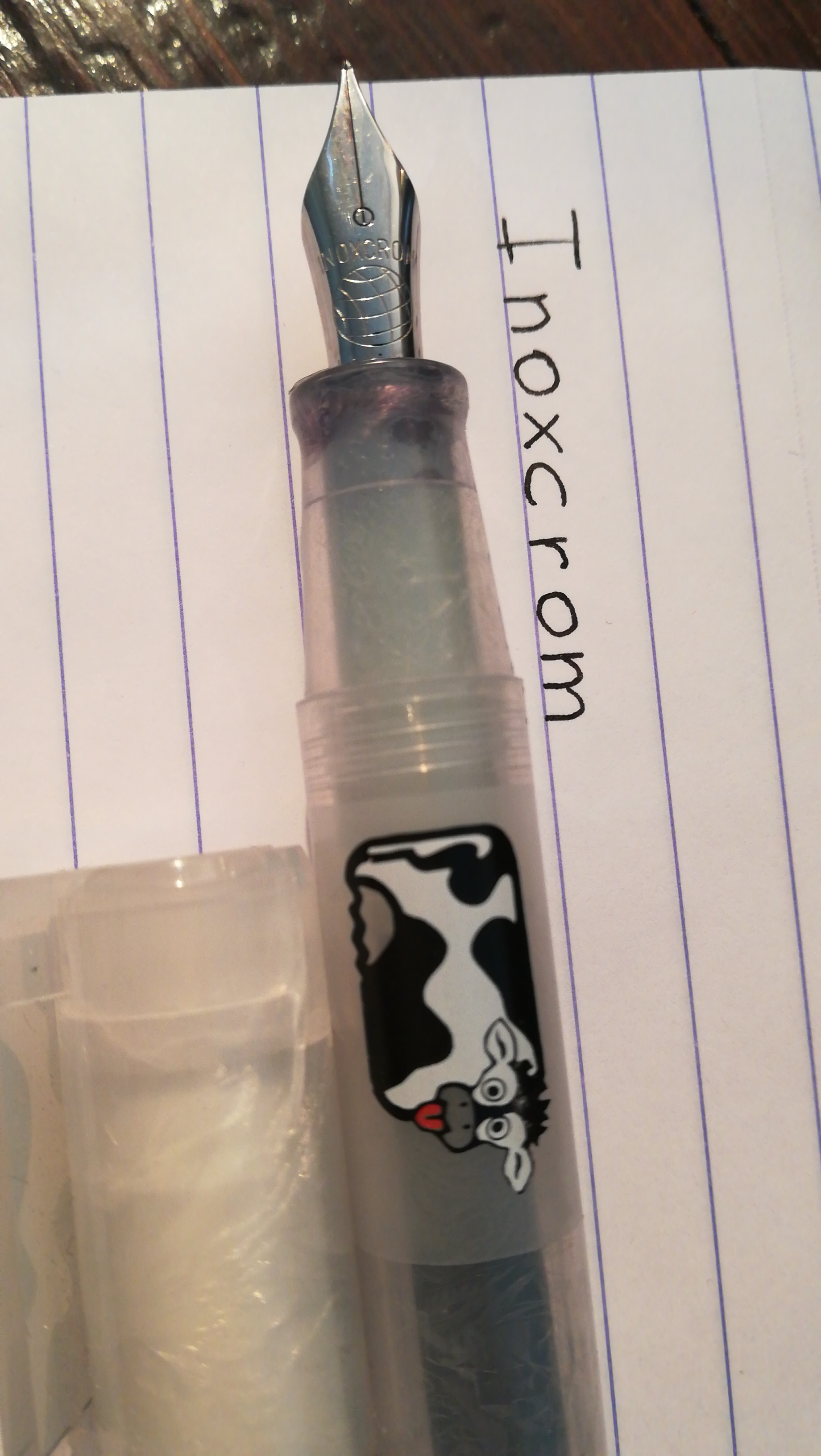 Anni fa al supermercato acquistai questa penna perché mi sono sempre state simpatiche le mucche. Per anni fa intendo più di 20 e da allora era rimasta dispersa tra i residuati degli accumuli dovuti ai vari attacchi di RAD con una cartuccia rinsecchita innestata. Dopo una pulizia nemmeno troppo difficile scrive che è un amore. Sul pennino reca l'iscrizione Inoxcrom, ma il simbolo non mi sembra possa ricondurre all'omonima casa spagnola. Voi che ne dite? Avete mai fatto buoni acquisti al super?