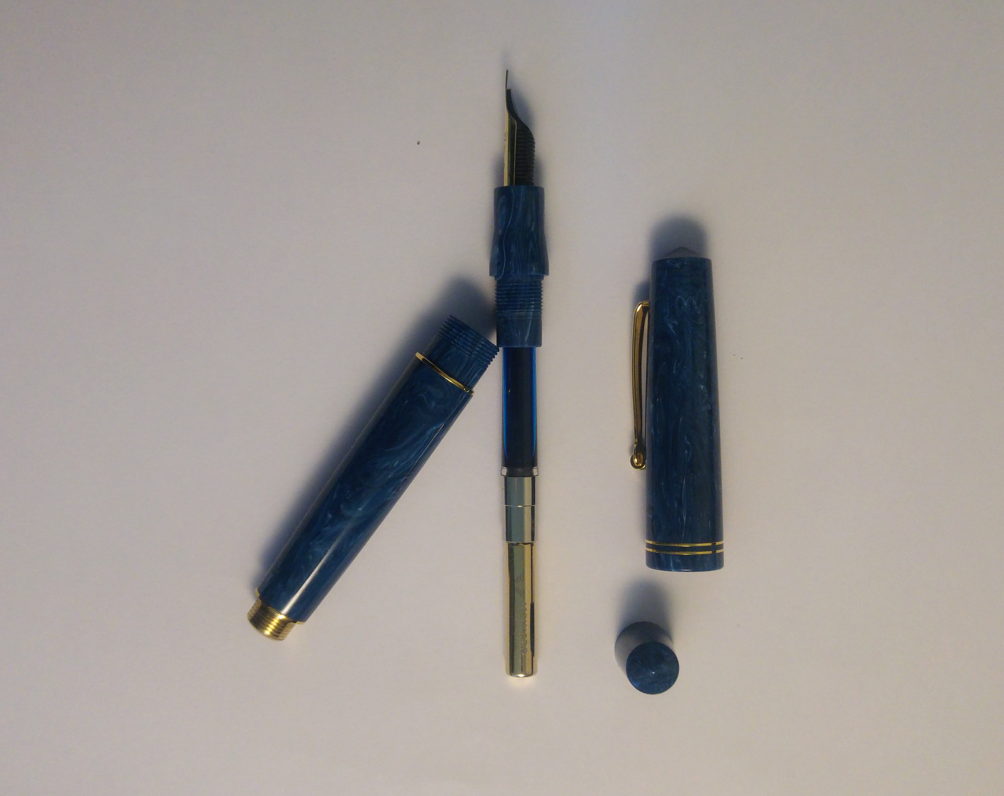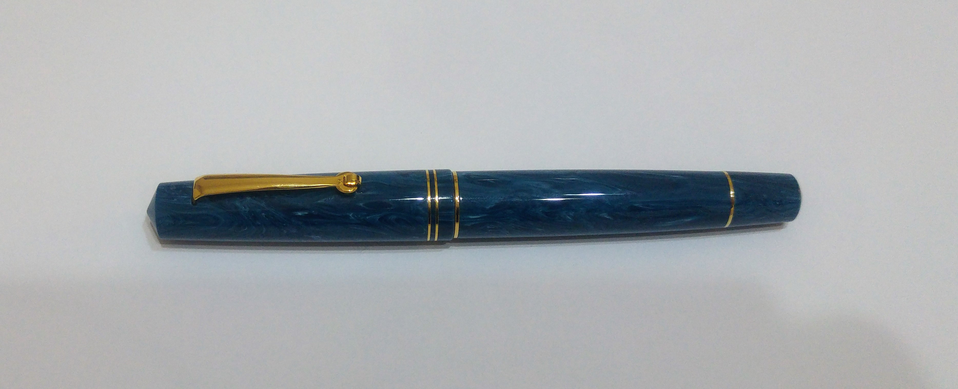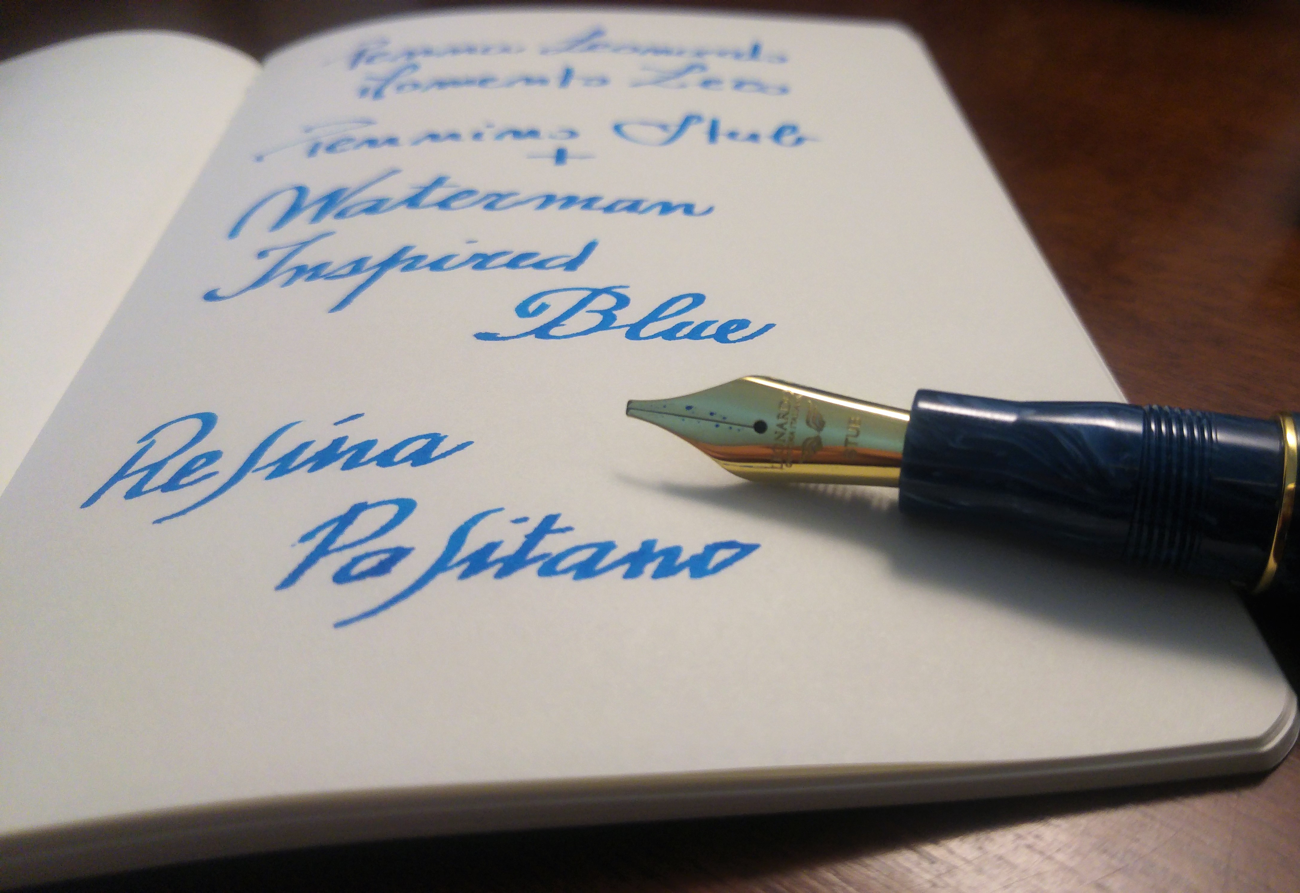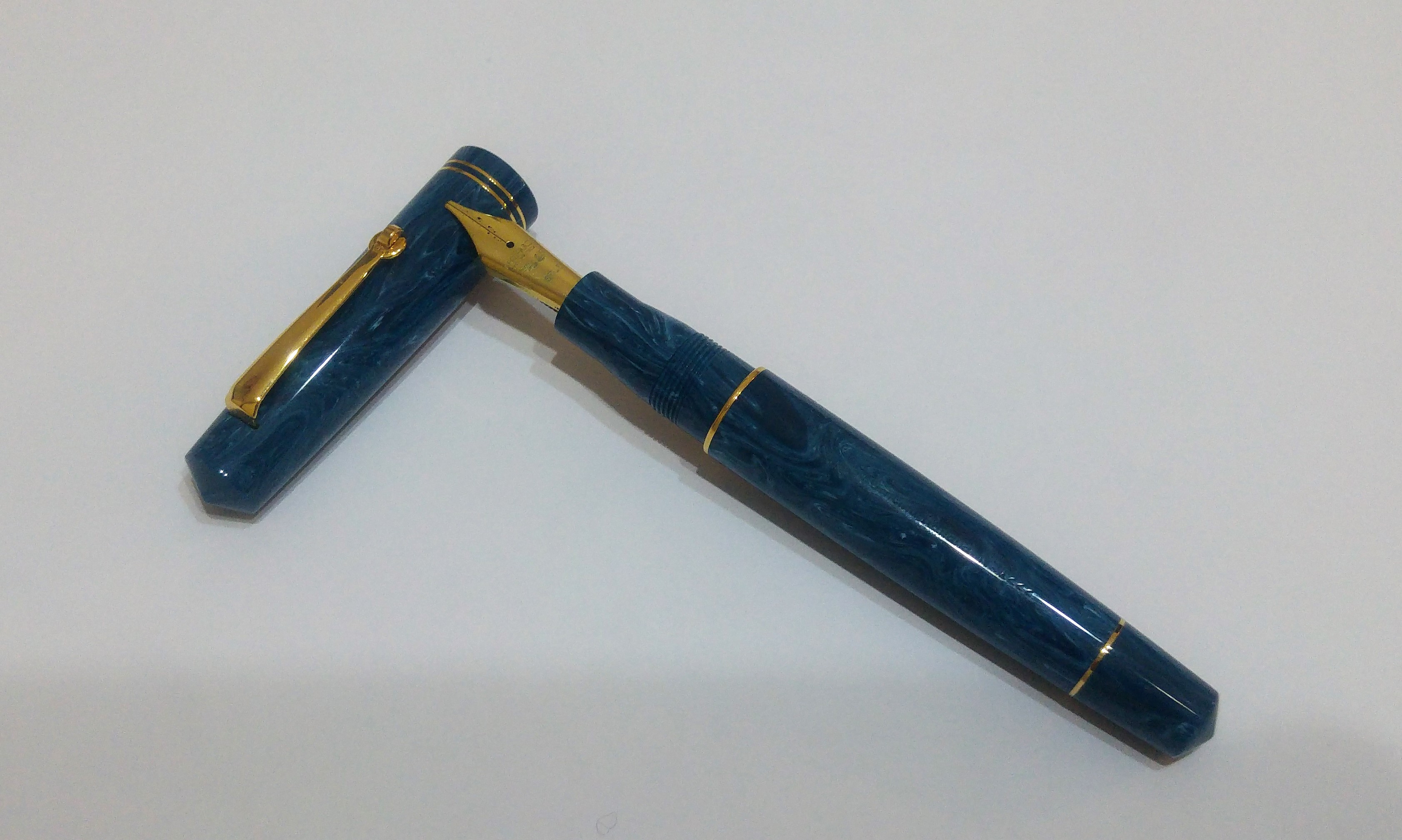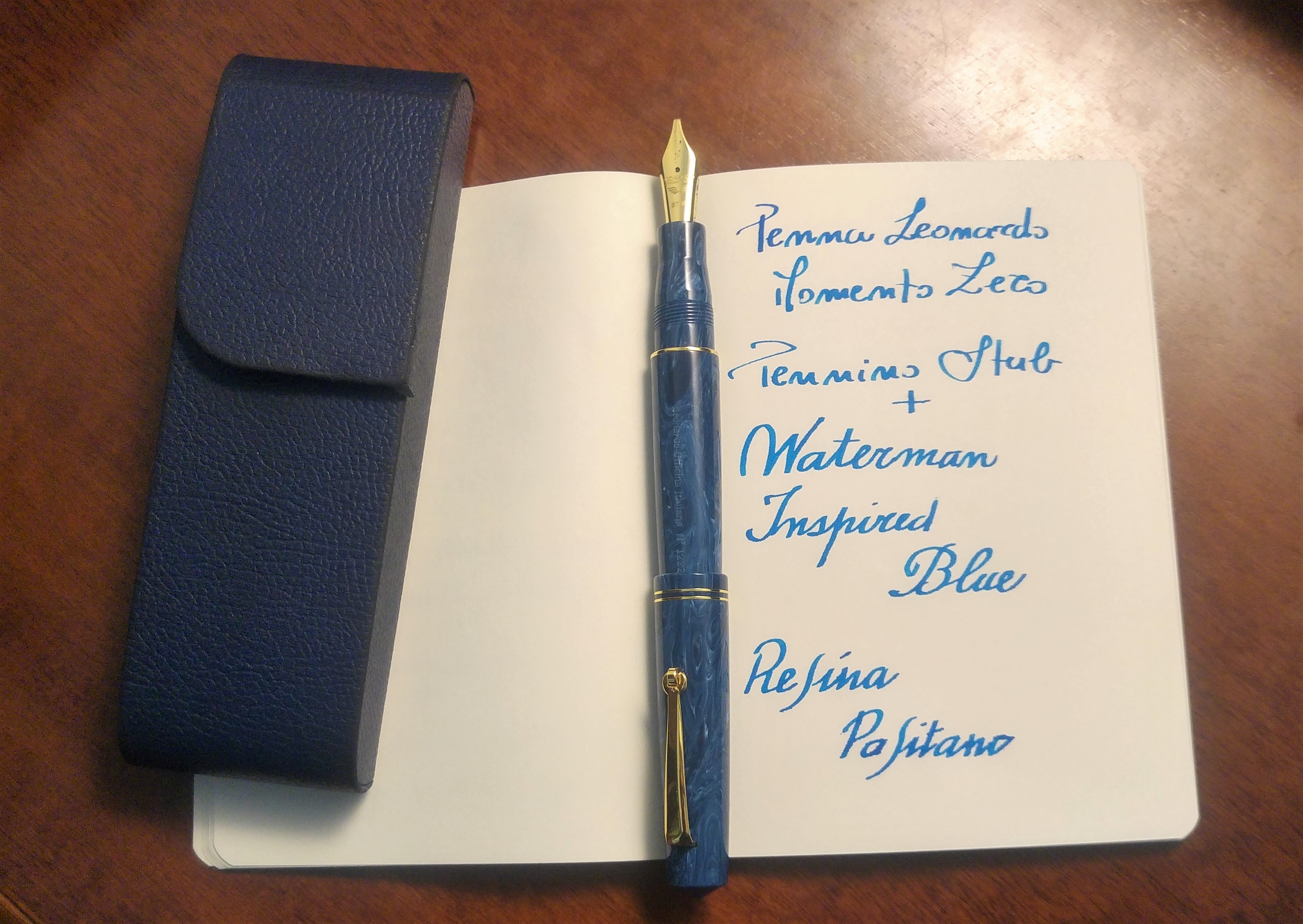 La settimana scorsa mi trovavo all’Aia per lavoro, la sera dello Shopping mi sono fiondato sotto il De Passage a fare visita al mitico P.W. Akkerman e gli ho fatte tirare tutte fuori le Momento Zero: sono tutte davvero belle. Dopo aver provato diversi pennini alla fine mi sono innamorato del pennino Stub e della resina Positano, quindi senza porre la minima resistenza me la sono fatta caricare con un bellissimo inchiostro P.W. Akkerman Passage Blauw (molto simile al Waterman Inspired Blue) e sono uscito con la Momento Zero Positano con pennino stub e, perché no, con un calamaio di inchiostro P.W. Akkerman Sbre Brown. Ecco la penna: La penna è lunga 141 mm chiusa, 127 mm aperta, 163 mm aperta con cappuccio e pesa 27gr. Il diametro della penna è di 19,5 mm nel punto maggiore del fusto mentre la sezione, realizzata dello stesso materiale del fusto, è di circa 11 mm nel punto centrale, rendendo l’impugnatura molto confortevole. Il cappuccio si svita con un giro completo e può essere inserito sul fusto in scrittura senza creare sbilanciamenti della penna. Il converter è davvero bello, con il pomellino in metallo marchiato Leonardo, di misura standard e attacco a vite, può essere operato, come diverse Delta (The Journal, Oblò, etc.), smontando il fondello del fusto senza smontare il tutto il fusto. Ovviamente può essere operato e smontato, per pulirlo e controllare il livello di inchiostro, rimuovendo normalmente il fusto. Il pennino è un #6, credo di provenienza Bock e, nel mio esemplare, è uno stub molto generoso. Provata al negozio per intinzione scriveva molto bene, in serata in albergo l’ho provata ma la penna non andava benissimo: dopo qualche pagina il flusso si smagriva fino ad arrestarsi. Il giorno dopo, appena tornato a casa, l’ho smontata e lavata accuratamente con il solito sgrassatore Chante Clair, rimontata e ricaricata con Waterman Inspired Blue ha iniziato a scrivere in maniera impeccabile, con un flusso generoso e senza la benchè minima decisione. Scorrevole e con un flusso generoso, decisamente non è una penna da poter usare su carte “normali”, ma provata su un quadernetto favini è piacere allo stato puro. Ovviamente dovevo verificare dal vivo la rassomiglianza con la The Journal ed eccole fianco a fianco, le similitudini sono molte, mentre le differenze più evidenti nel disegno sono le diverse proporzioni tra cappuccio e fusto e la clip, io le definirei “gemelli diversi” [foto comparative]