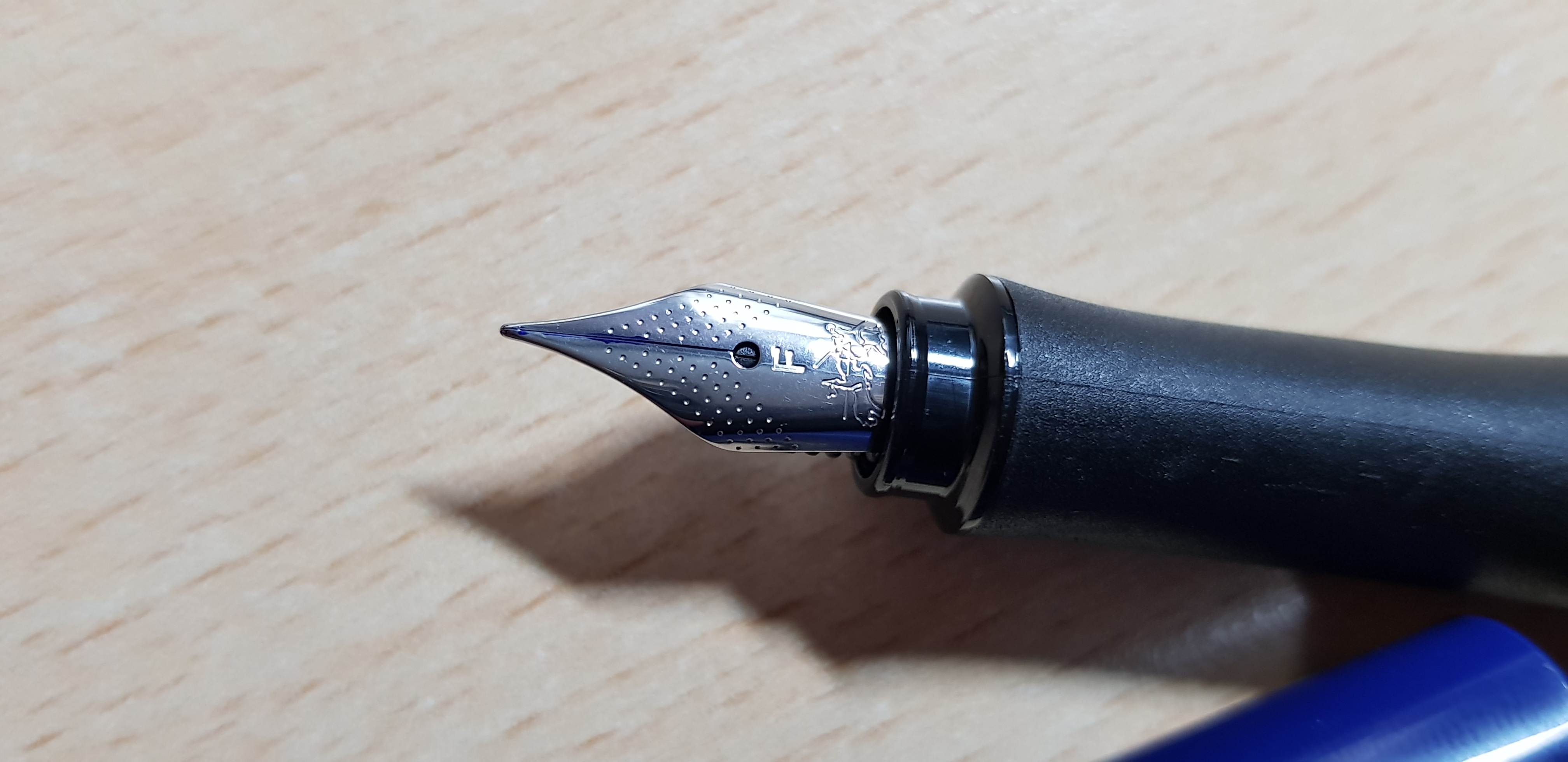 Ho scelto il pennino fine e non mi dispiace affatto, anzi. Il pennino in acciaio è molto rigido, ma con un po' di pressione permette una variazione, anche se non insisterei molto. Anche sul pennino si trovano i classici puntini della serie grip.