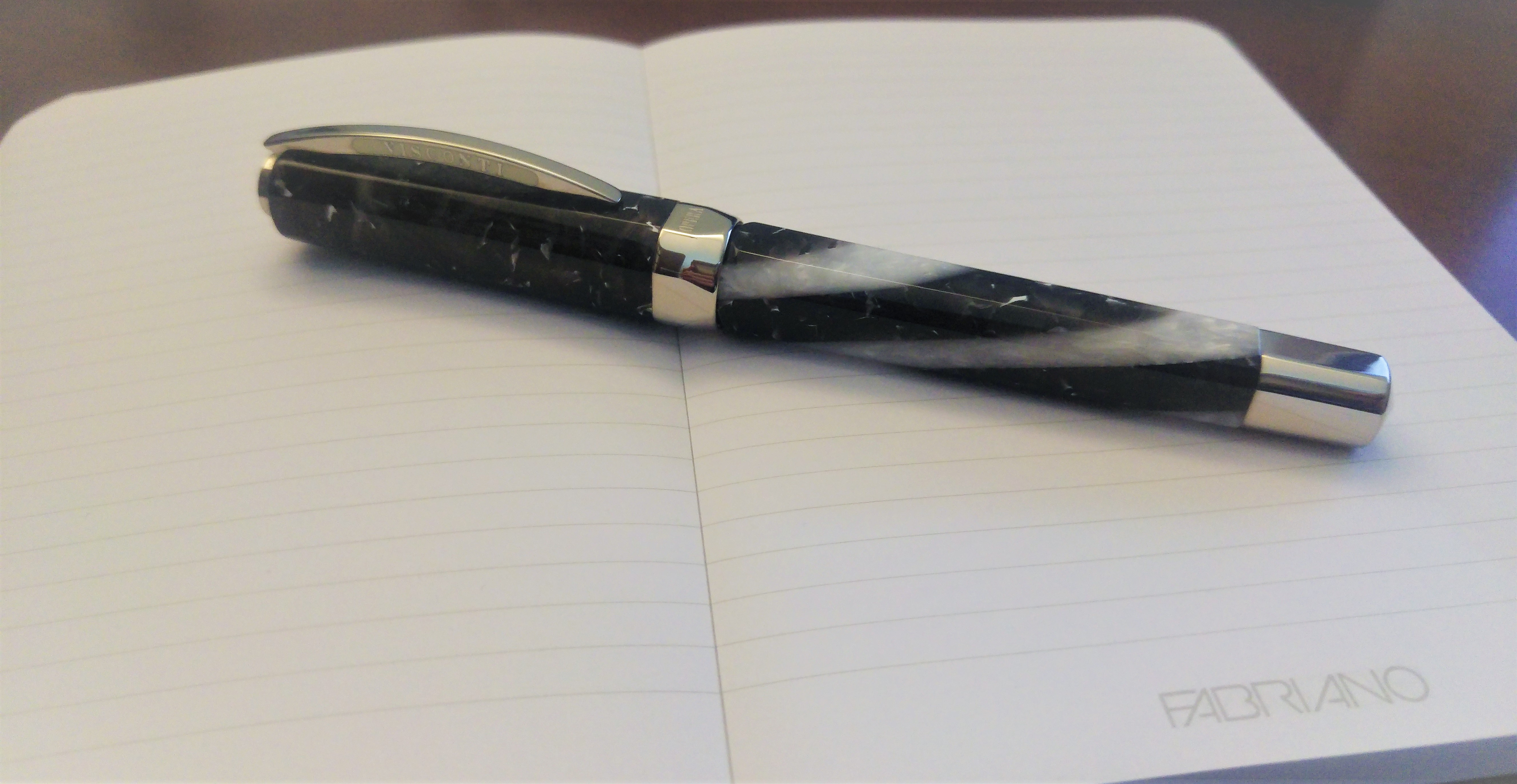 Trovo la penna oltre che bella e solida, il cappuccio usa il sistema a baionetta che consente di mantenere le facce tra cappuccio e fusto sempre allineato, la clip è caricata a molla e sul cappuccio ha il sistema Visconti My Pen su cui ho messo le mie iniziali. Il sistema di caricamento è a cartuccia/converter con montaggio a vite, semplice economico e funzionale. La sezione metallica è a mio parere il solo neo di questa penna, non tanto per una questione estetica quanto funzionale, benché la penna sia molto comoda e ben bilanciata, diventa un po' scomoda in lunghe sessioni di scrittura per chi, come me, ha la tendenza a sudare sempre un po' le mani. Il pennino è un #6 14K di misura F nel mio esemplare; io lo trovo più piacevole del dreamtouch al palladio, è più scorrevole, è bello morbido, permette un po' di variazione del tratto (ma su questo il dreamtouch non è da meno), ha un flusso più controllato ed un tratto più “giusto”, l’F della Opera Elements è più sottile del EF del 23K al Palladio che ho sulla Divina.