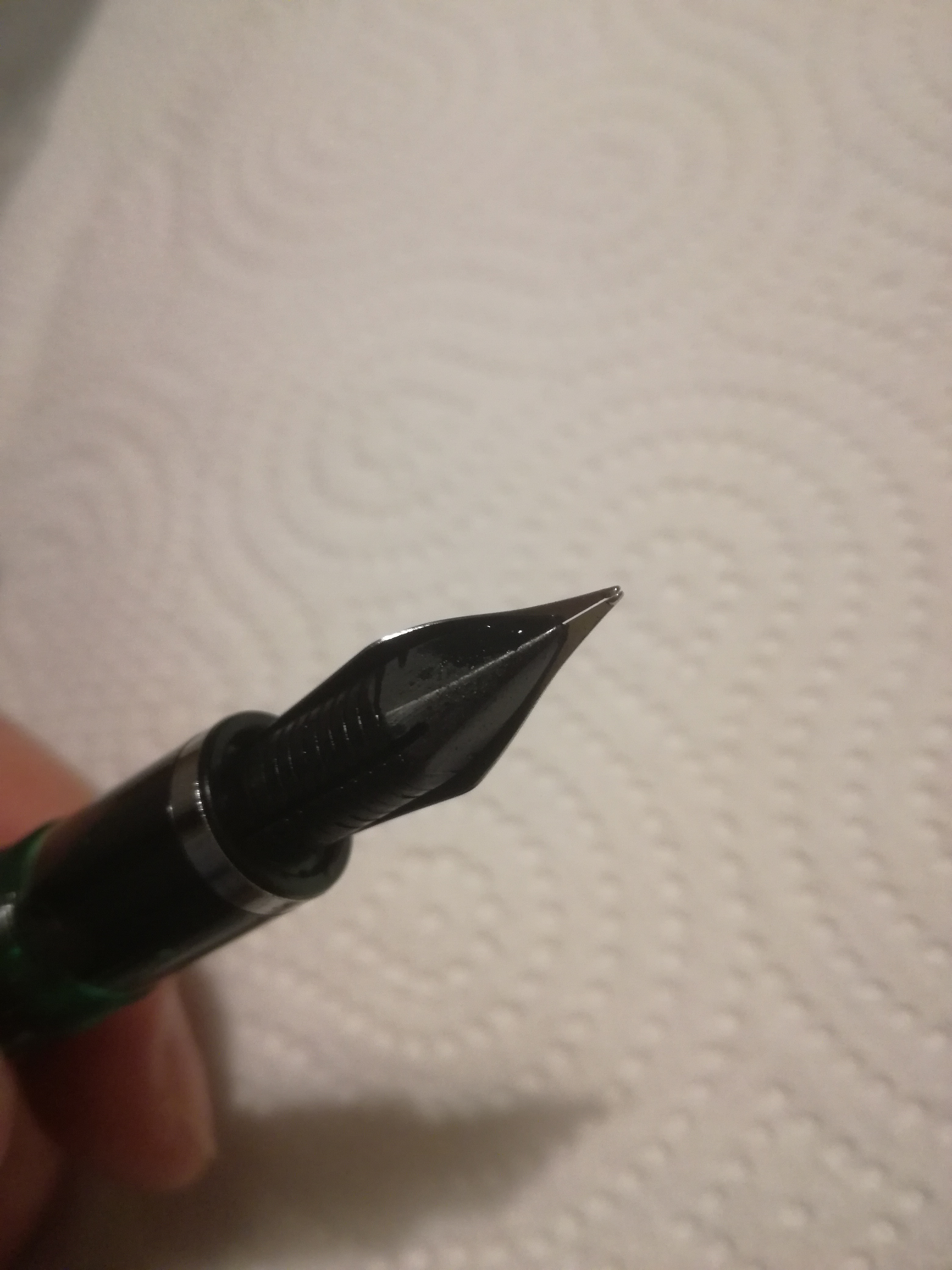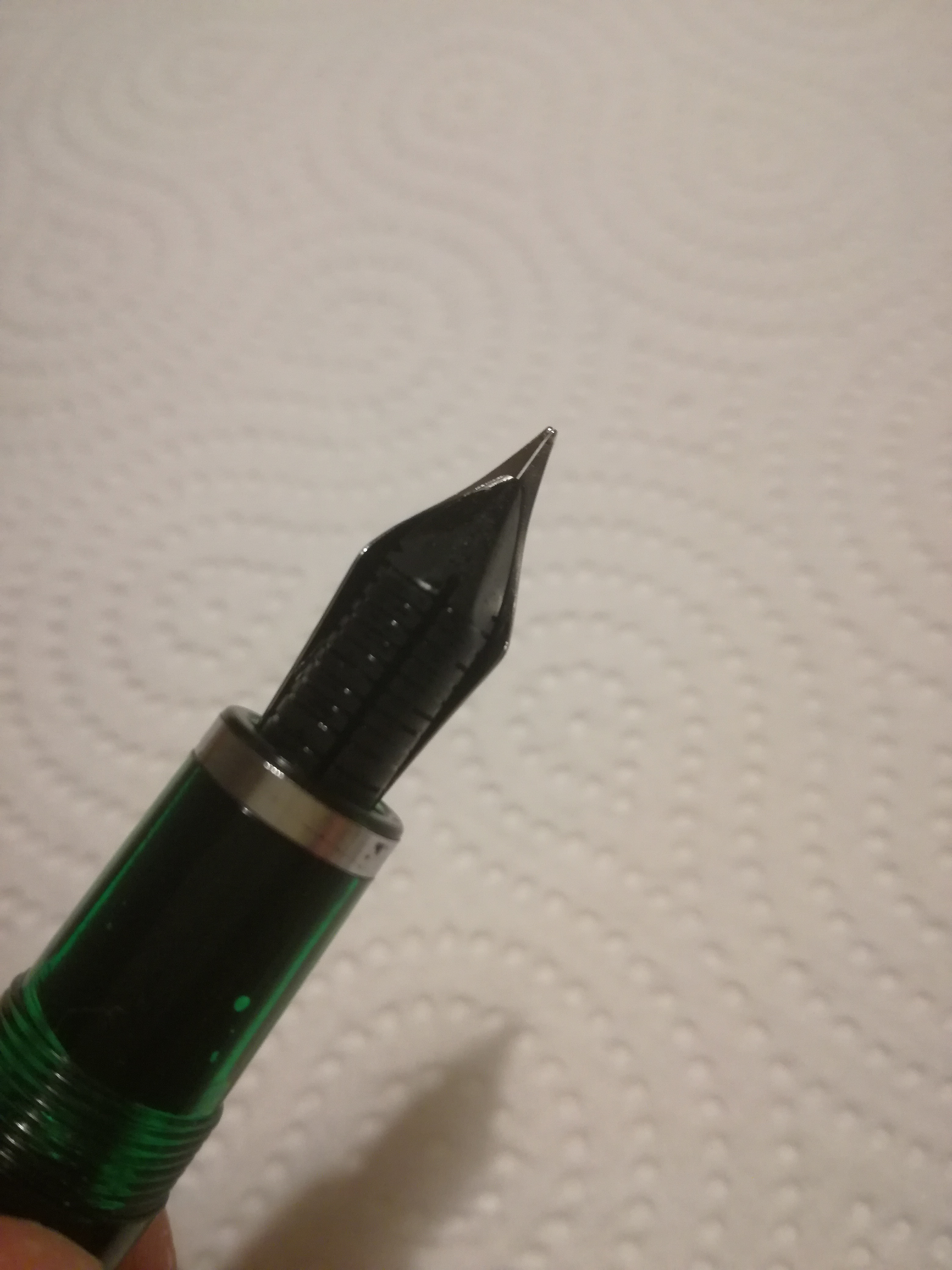 Attualmente, la penna è carica, ma scrive veramente per poco, circa mezza pagina, e poi si interrompe. In pratica, vedo l'alimentatore bagnato e quel poco di pennino che ne avanza totalmente asciutto: l'inchiostro non 'procede' oltre.