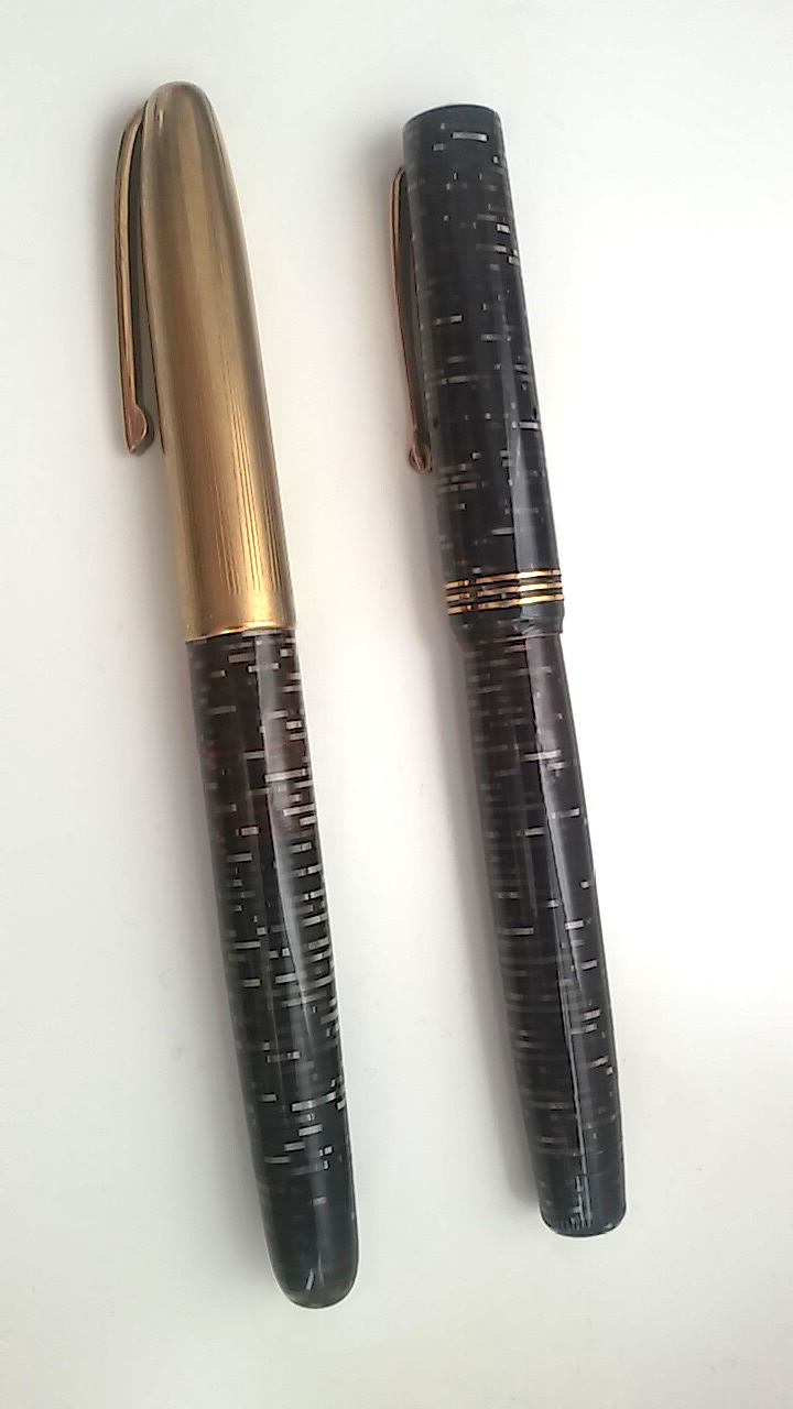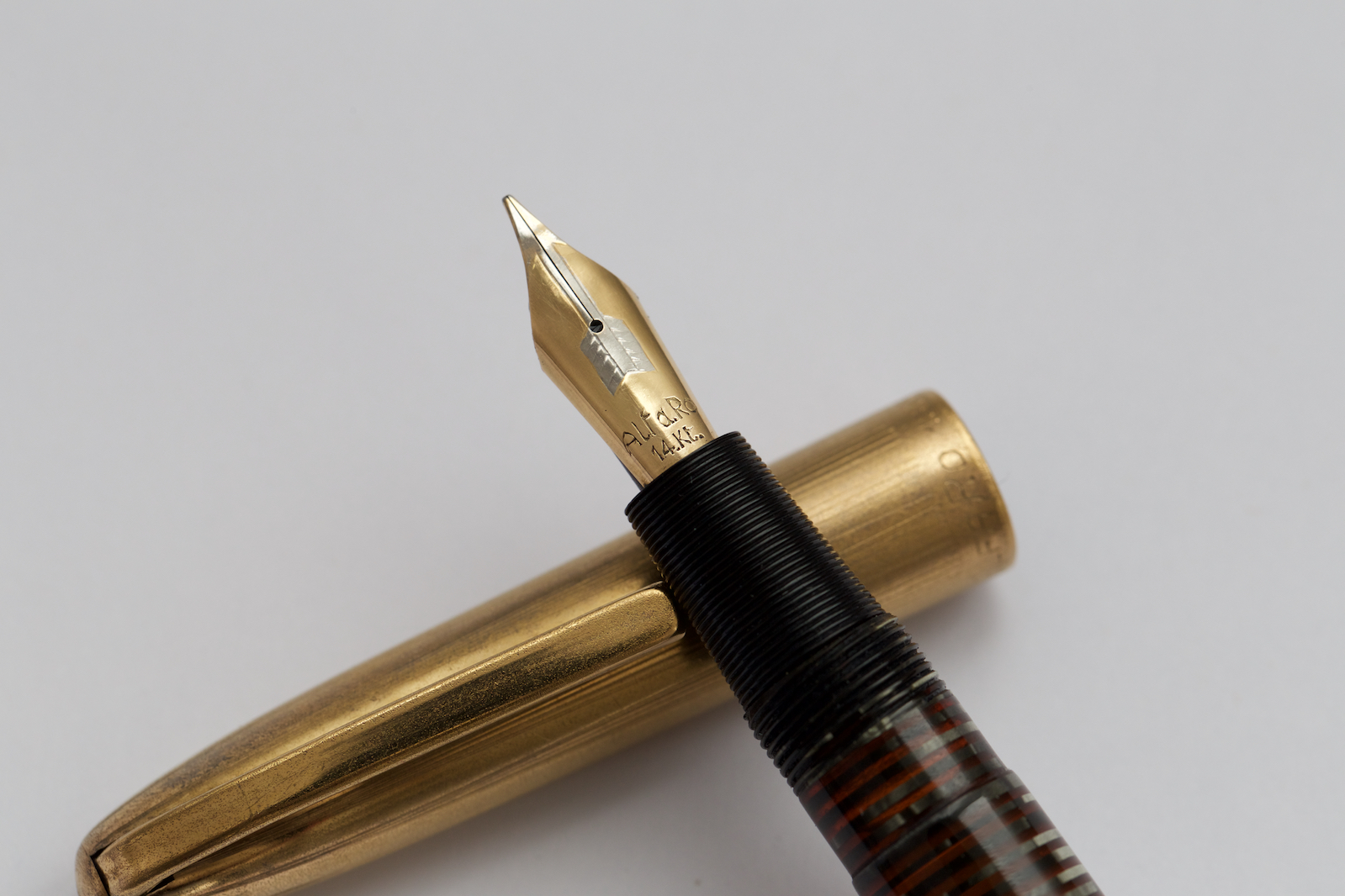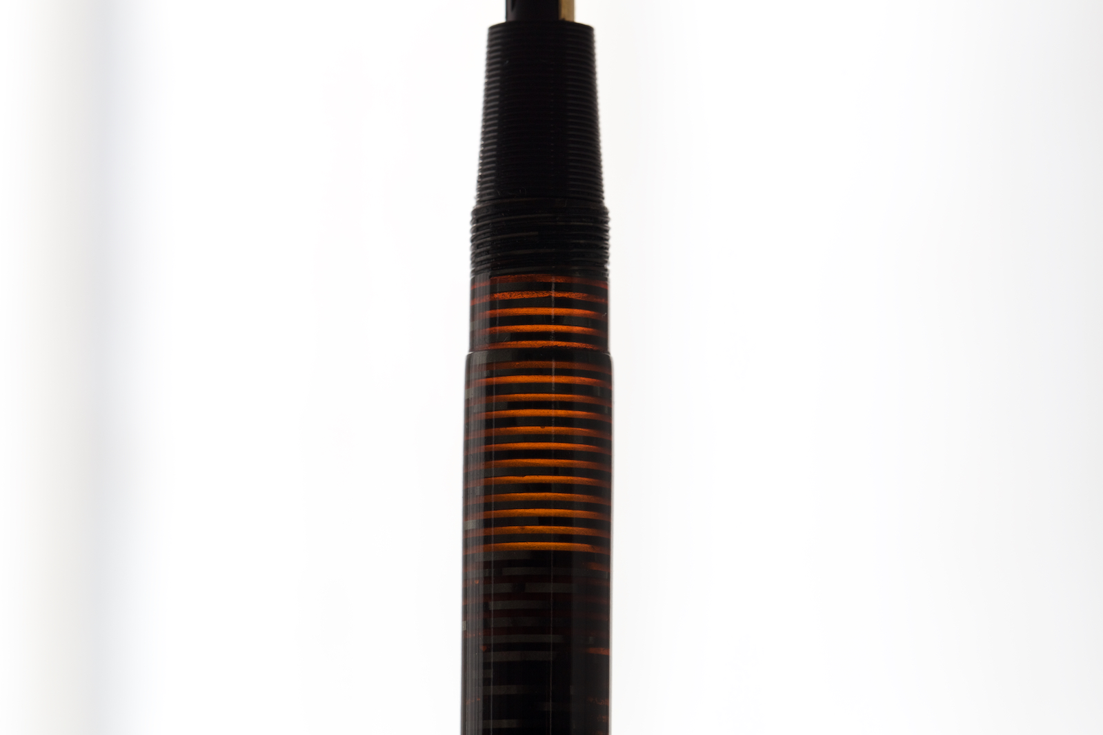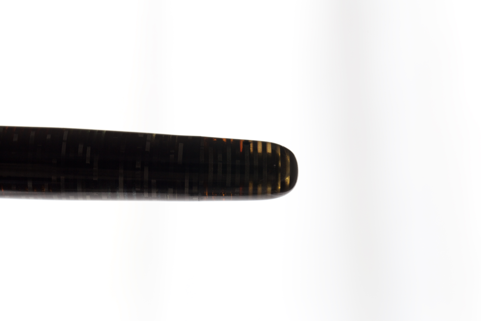 Una delle ultime arrivate è questa, a mio parere, bella penna Alfa Ro. Non ho trovato in rete molte immagini di penne di questa marca di Settimo Torinese, e effettivamente è la prima che mi capita tra le mani. Il cappuccio è bello solido, in metallo dorato e recante la marca della penna, la sezione è particolare, composta da una simil filettatura che comunque non infastidisce, il corpo è in una bellissima celluloide anellata che io trovo uguale a quella della mia Omas lucens anellata. Il sistema di carica è a stantuffo, ho rifatto la guarnizione in sughero ed ora è pronta per scrivere. Il pennino è in oro, scrive molto bene ed è molto flessibile. Trovo curioso l' alimentatore che ha delle lamelle/incavi che non si congiungono al resto dell' alimentatore, sembrano quasi fatte per bellezza. La penna misura chiusa 13,5 cm, il fondello nelle operazioni di carica e scarico gira senza allungarsi.