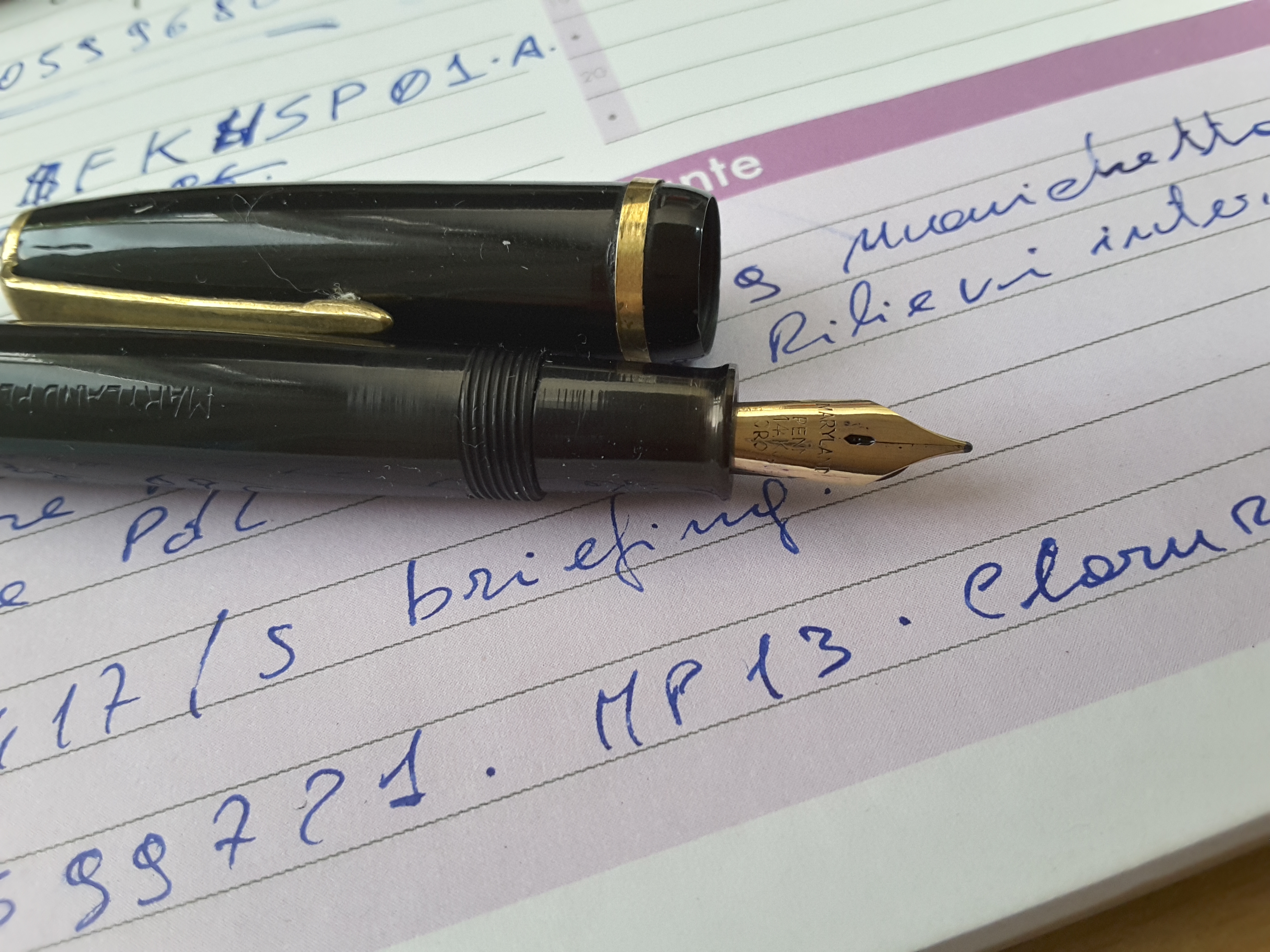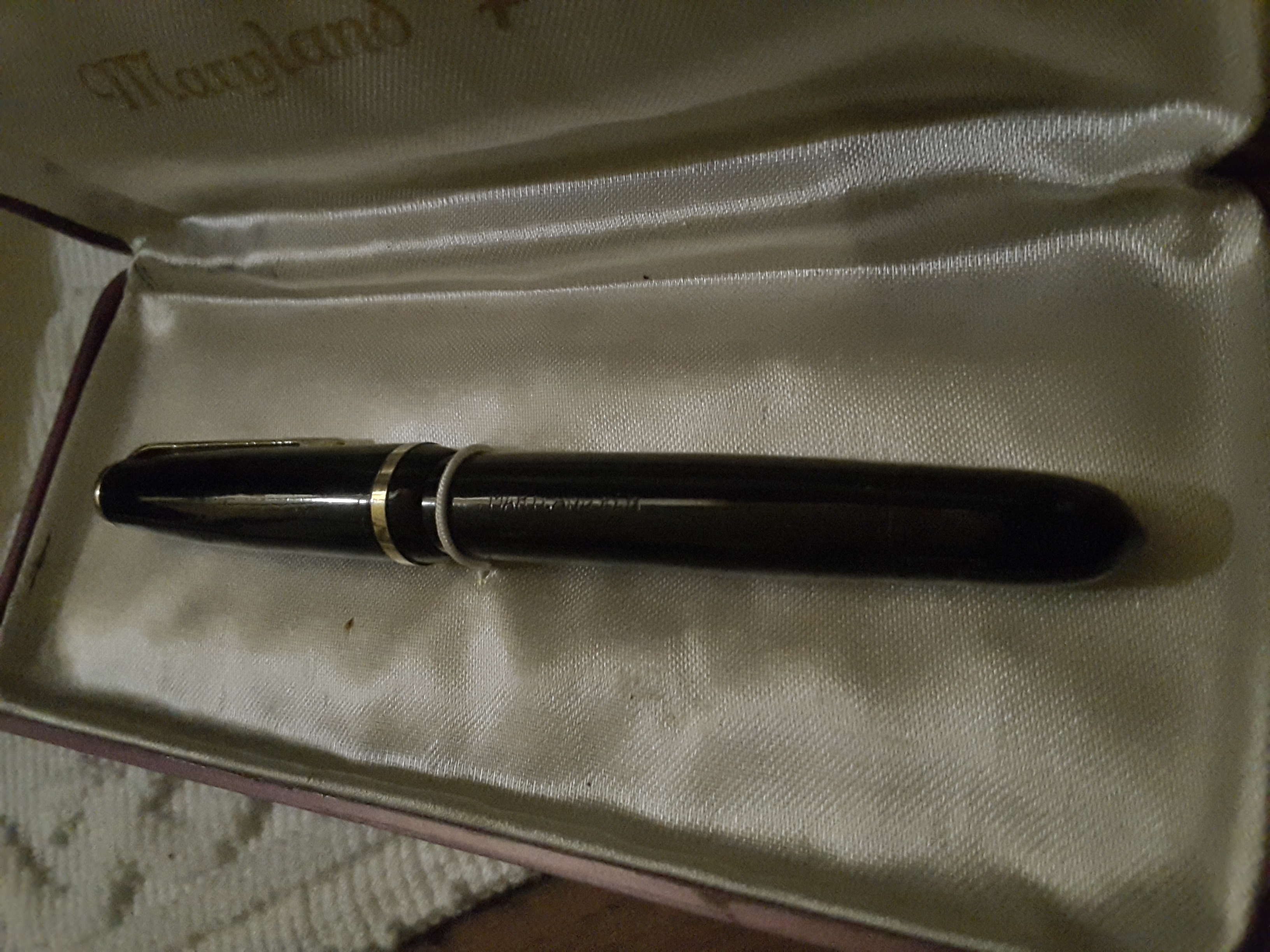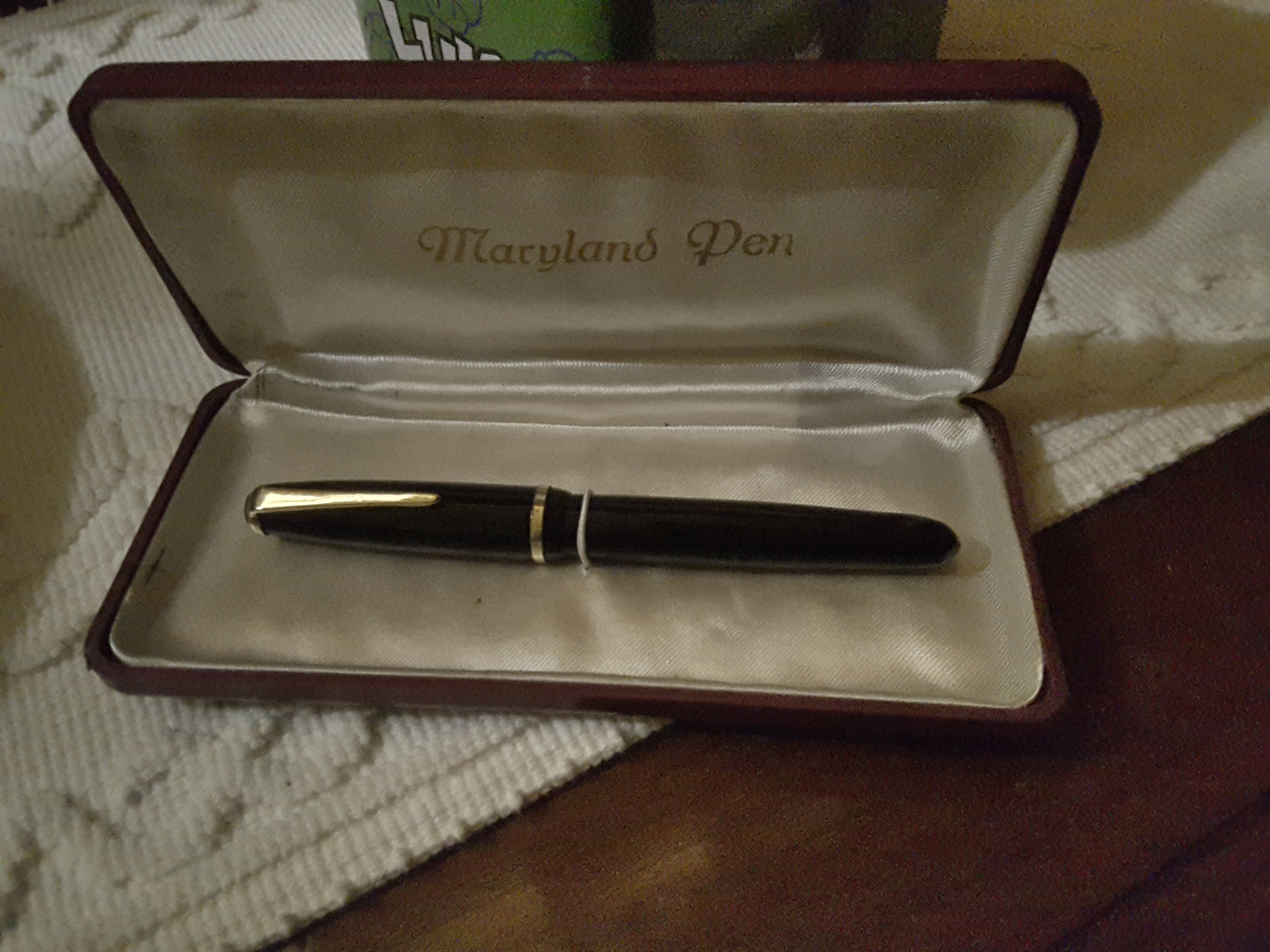 Da poco ho acquistato una Maryland che ho restaurato, penso sia degli anni 50, con pennino in oro (o placcato) e caricamento a bottone.
