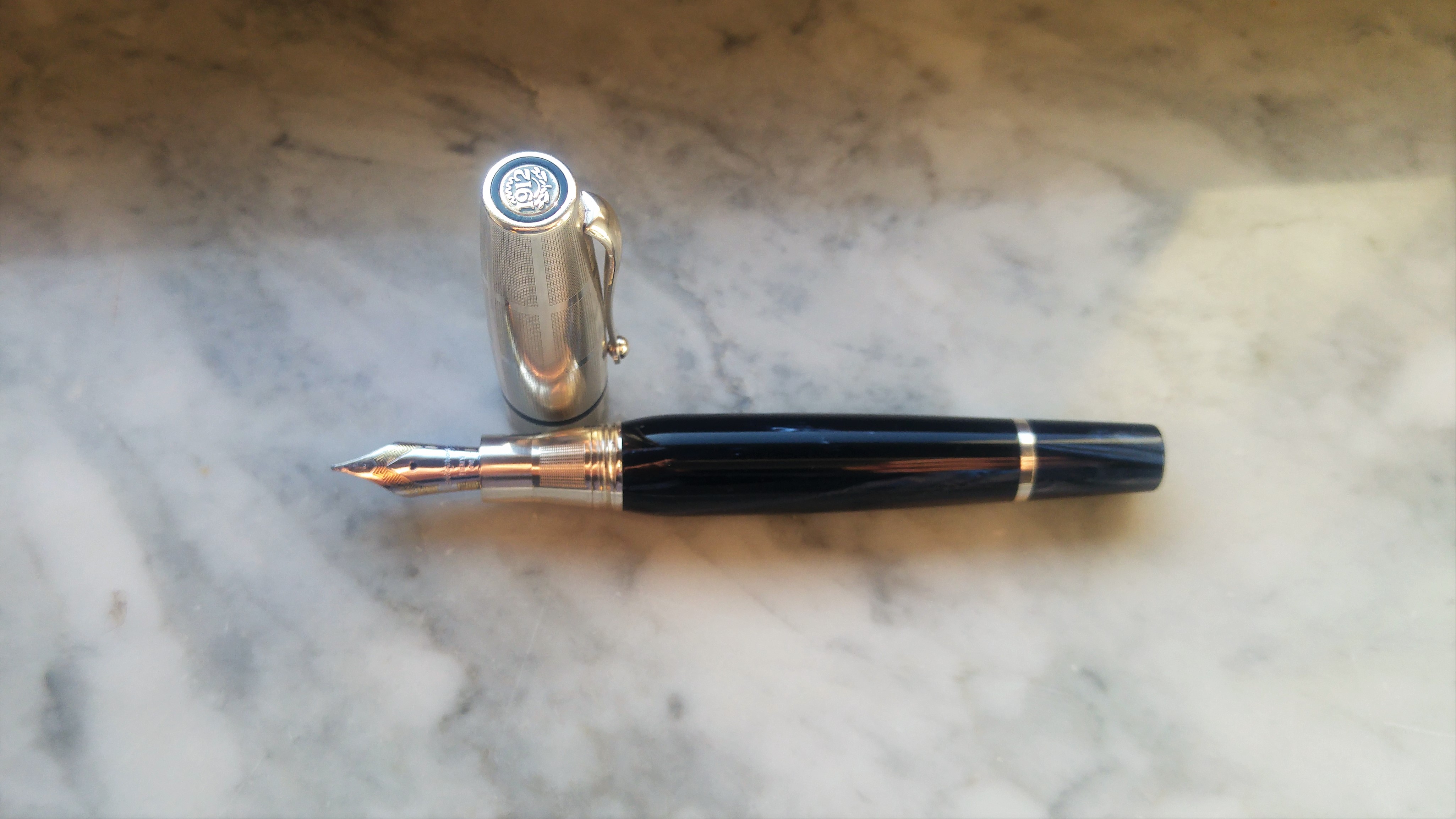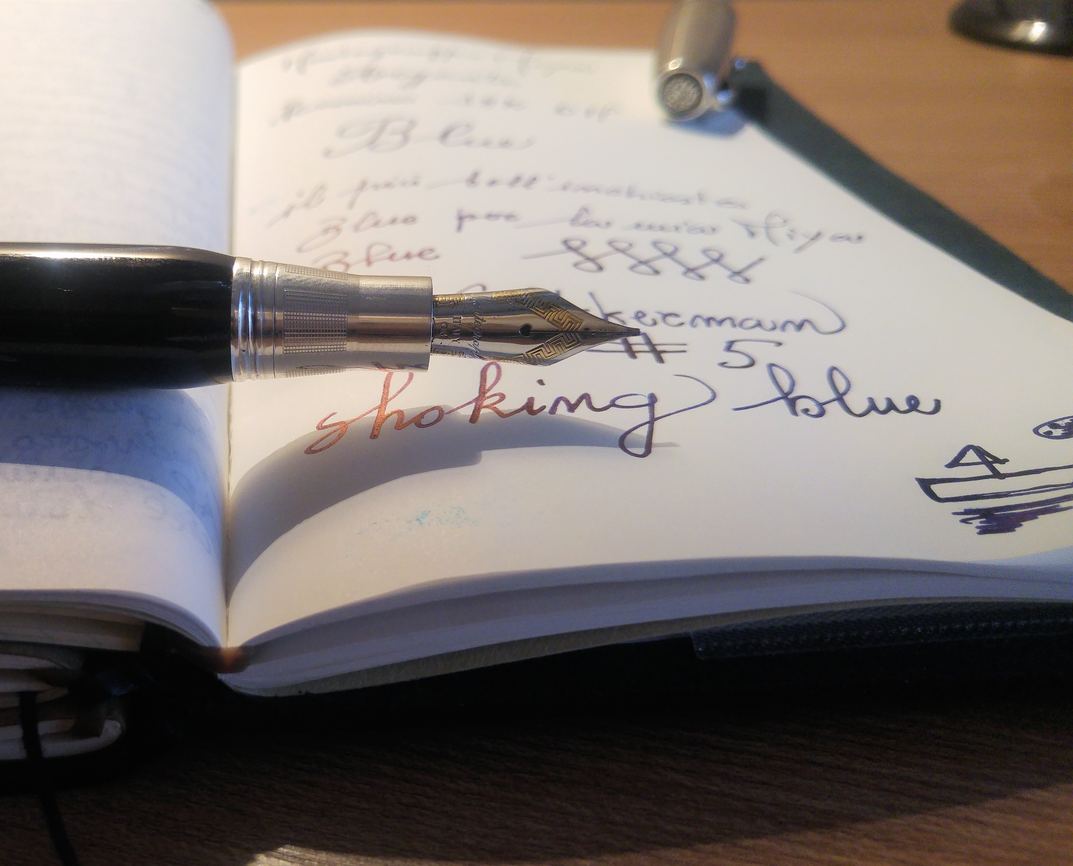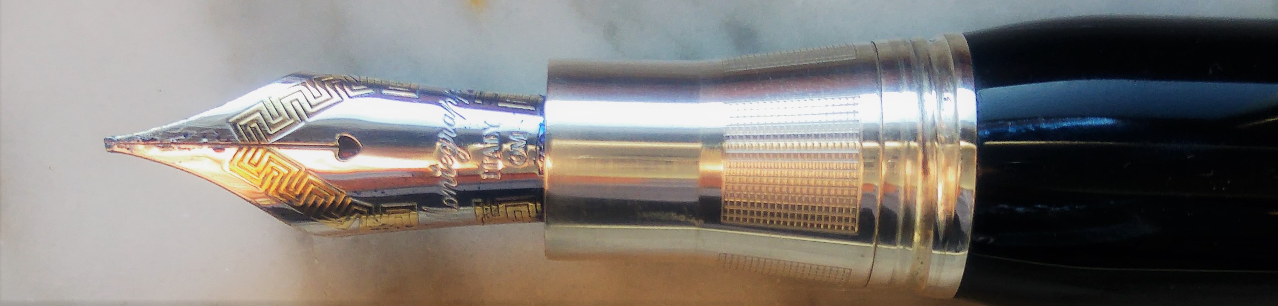 Il pennino è in oro 18K e sul mio esemplare è un OM; non era una penna nuova (ma in condizioni pari al nuovo) ed appena inchiostrata ha iniziato a scorrere sulla carta che è un piacere, direi che scrive come ci si aspetta da una Montegrappa, bel tratto medio e flusso ben regolato. A differenza di altri OM che ho avuto, ha il cosiddetto “sweet spot” poco accentuato, per quel che mi riguarda mi sembra cucita addosso avendo la tendenza a scrivere con la penna un po' ruotata, ma non ha caratteristiche stub come tutti i pennini obliqui che ho provato. Tuttavia come 18K ha una morbidità eccezionale che consente di avere anche una discreta variabilità di tratto.