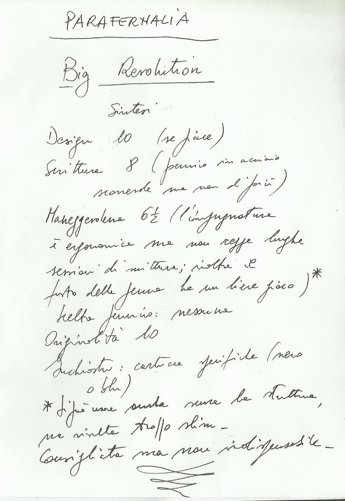 PARAFERNALIA richiedeva una penna invendibile, un immagine corragiosa. Iniziai a lavorare con quello che era HI-TECH ai quei tempi, cioé mostrare le parti tecniche, il meccanismo, le budella dello strumento (come Renzo Piano con il centro Pompidou – Beaubourg di quegli anni) e disegnai la forma della struttura intorno (come Pininfarina disegnava le forma di una Ferrari intorno ai suoi potenti propulsori in modo da trarre la migliore efficienza di performance). Una penna innovativa, interamente fatta a manocon 31 minuscoli componenti metallici e un meccanismo a spinta come le piu complesse auto da corsa."