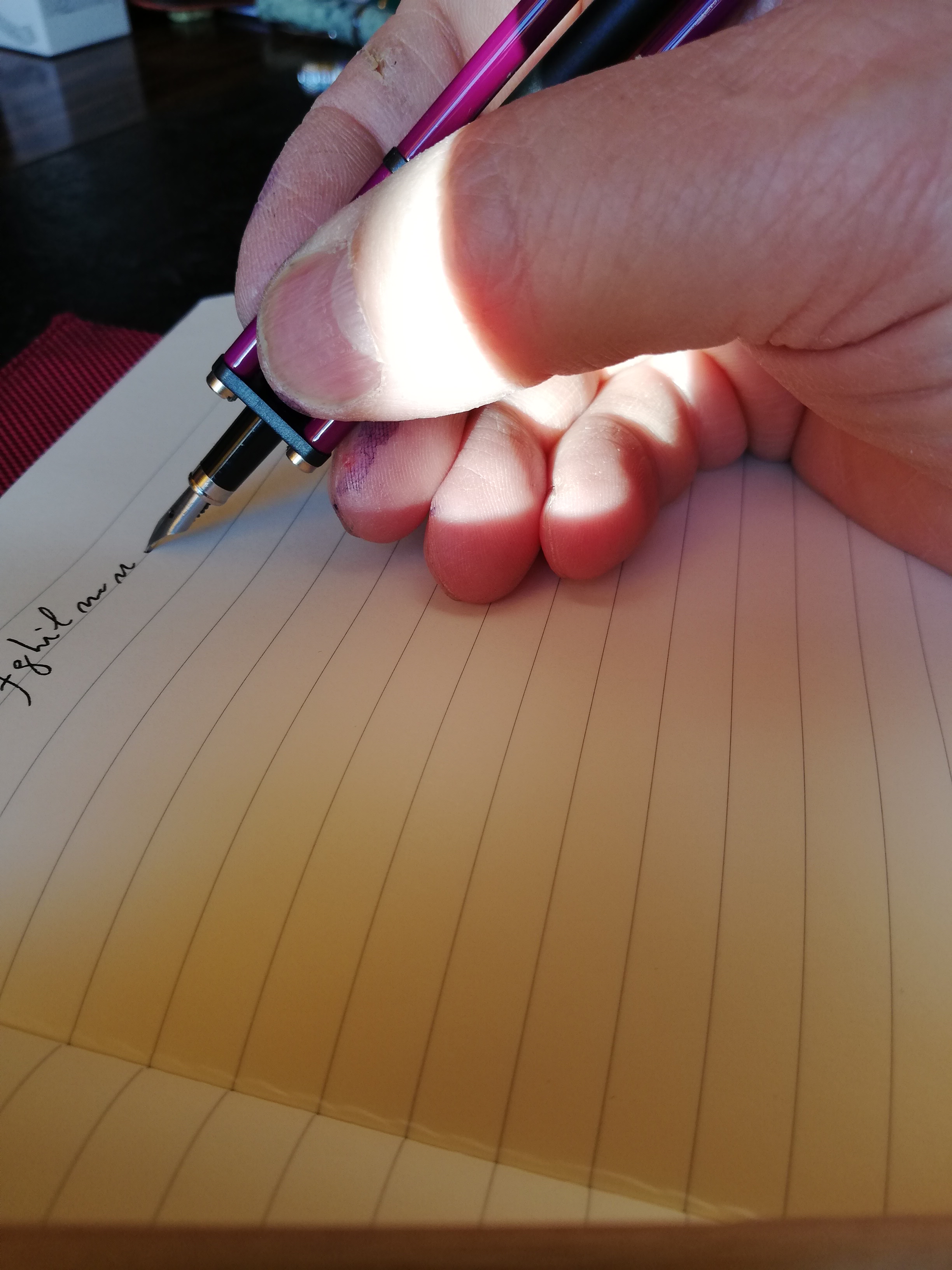 Come scrive? Ho allegato alcune impressioni nel foglio allegato. Il pennino è in acciaio, con la scritta "Dura flex", ed è piuttosto fine. Non c'è possibilità di scelta della misura.