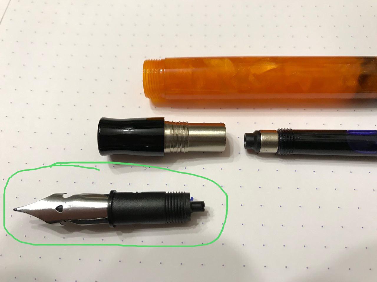 La domanda é: posso cambiare pennino e alimentatore sostituendo l'insieme evidenziato in verde nella foto precedente? come faccio a sapere che misura di gruppo scrittura acquistare? ci sono delle misure standard per questi "ricambi"? si può essere certi o bisogna andare a tentativi? In un altra discussione ho letto di un utente che ha montato il pennino di una Twsbi vac700 in una Duragraph. Io possiedo una Twsbi Eco, il gruppo scrittura é uguale?
