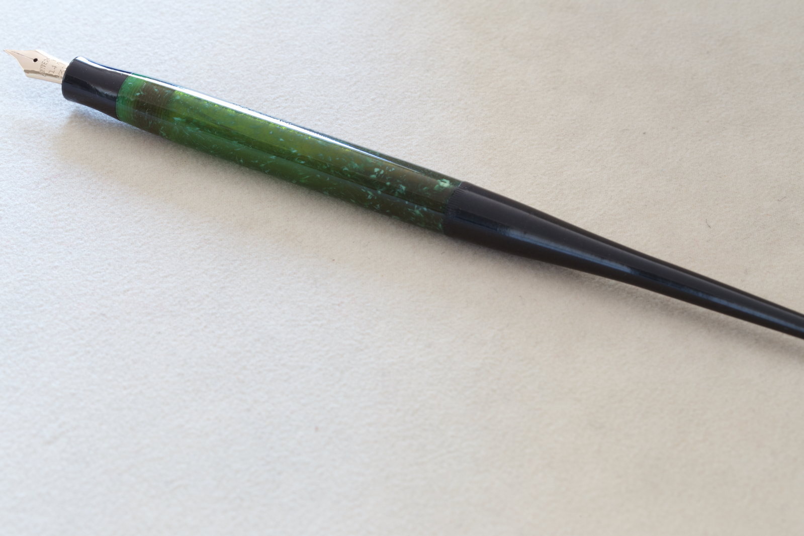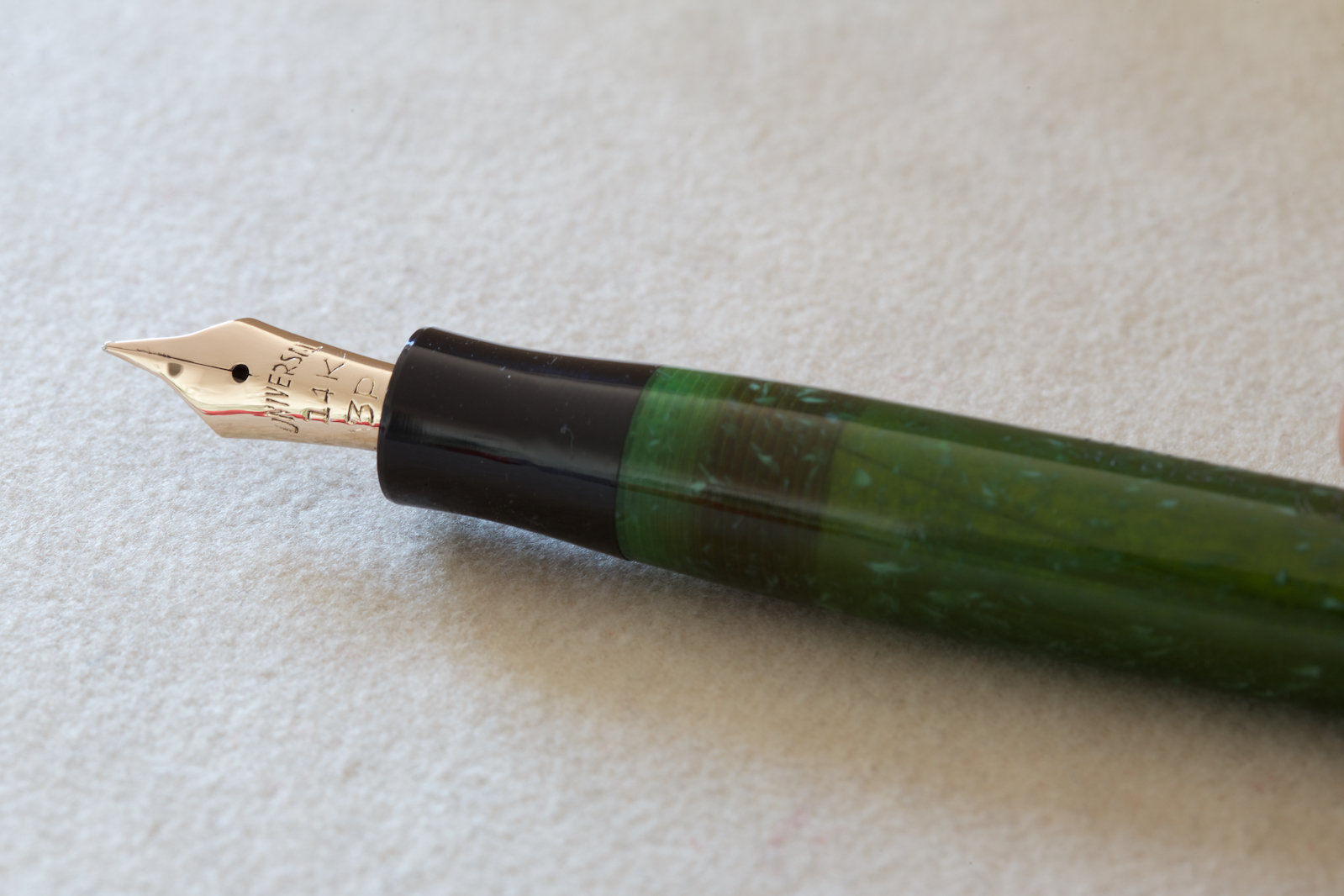Non avevo mai avuto alcuna penna di questa marca, ho letto un po' di informazioni sul Wiki. La presenza del ferro di cavallo nell' iscrizione sul fusto dovrebbe fare risalire lo stiloforo agli anni 30/40. Carica a bottone di fondo, pennino in oro molto flessibile, una trasparenza ancora molto evidente.