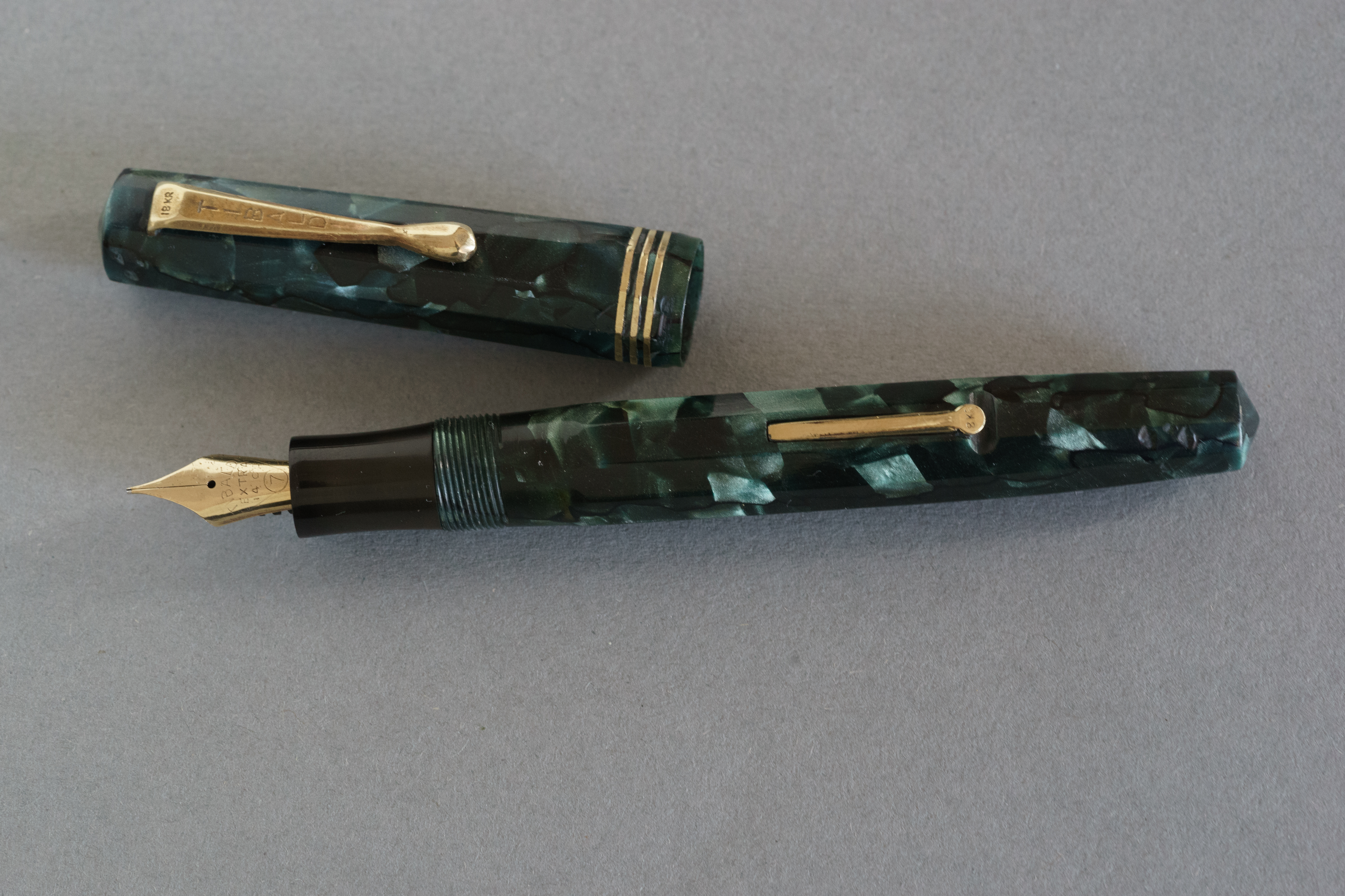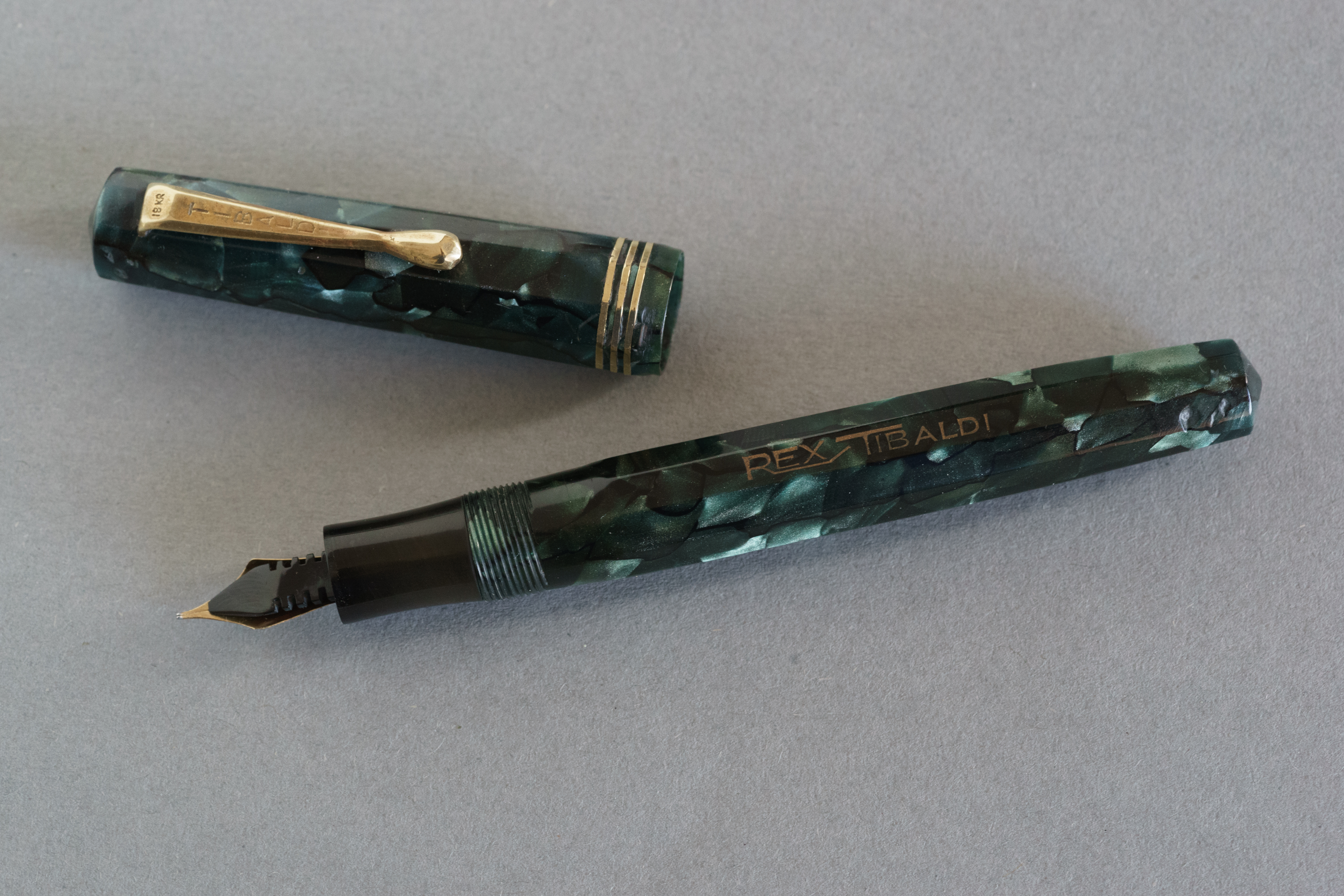 Sfaccettata, marmorizzata blu, e questa volta con caricamento a leva, con la clip a goccia anzichè a cravatta.