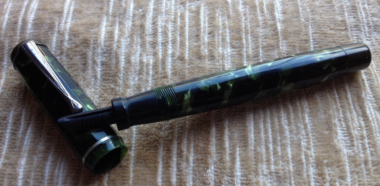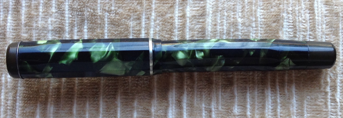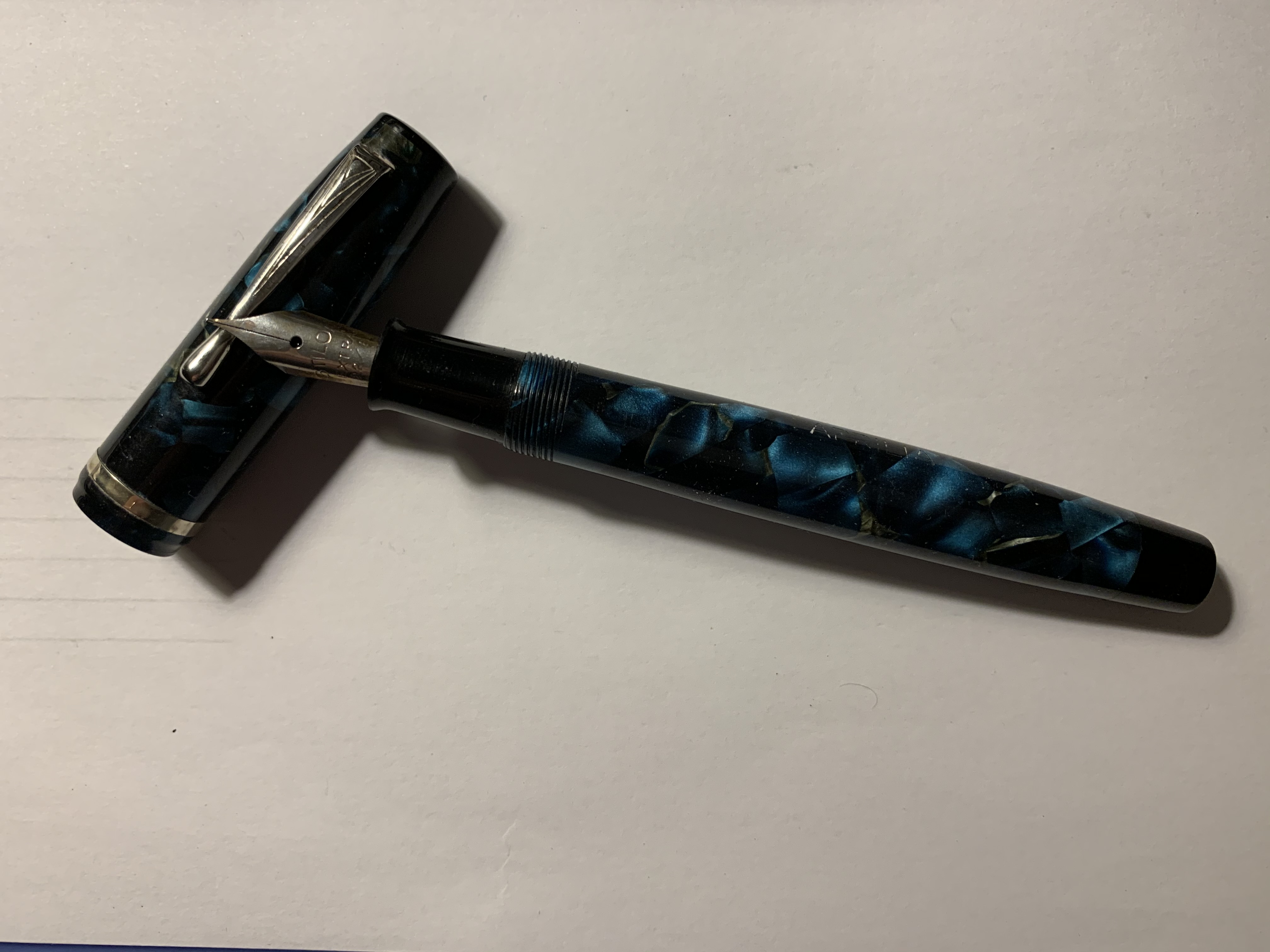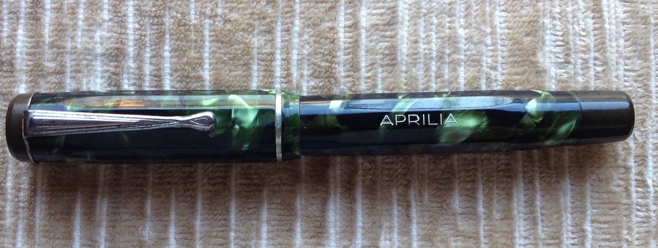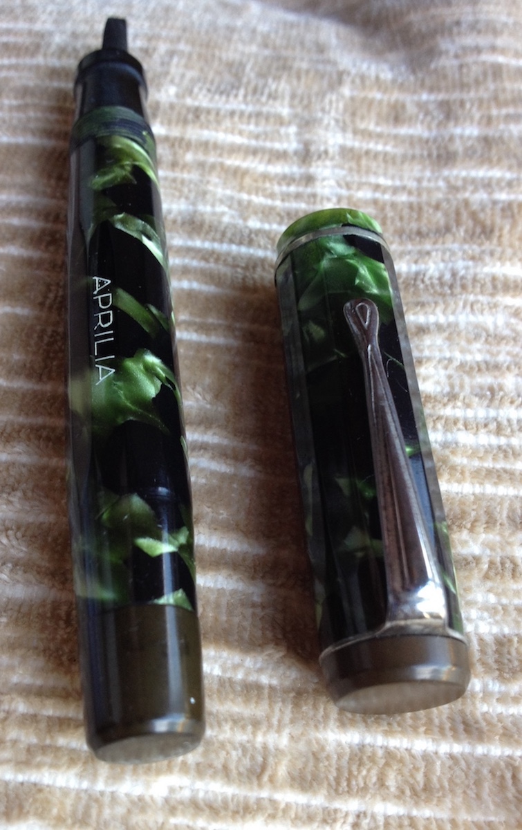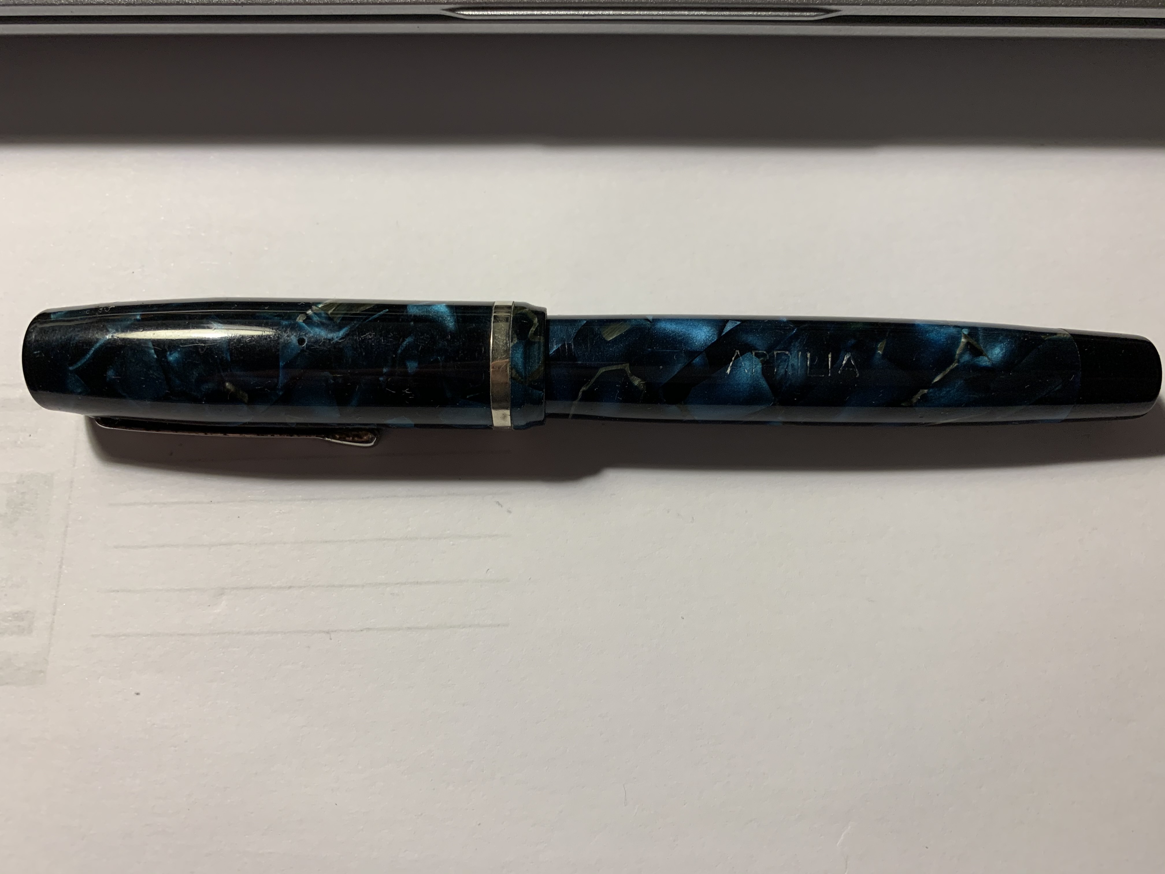 Pescata tempo fa nella baia degli Yankees, è stato un ritrovamento veramente strano oltre che super economico. La fattura è sicuramente torinese, Aurora o SAFIS, il nome è tutto un programma: è la marca? E' il modello? Celebra la Lancia Aprilia? Omaggia la città dell'agro pontino? Mistero! Misura 12,5 cm, fusto da 13 mm, pesa 16 grammi di nuda celluloide, caricamento a pulsante, tappini in ebanite, pennino non pervenuto. A me non piacciono le sezioni prismatiche, il colore è bello però è stravisto, mi incuriosiva solo il nome.