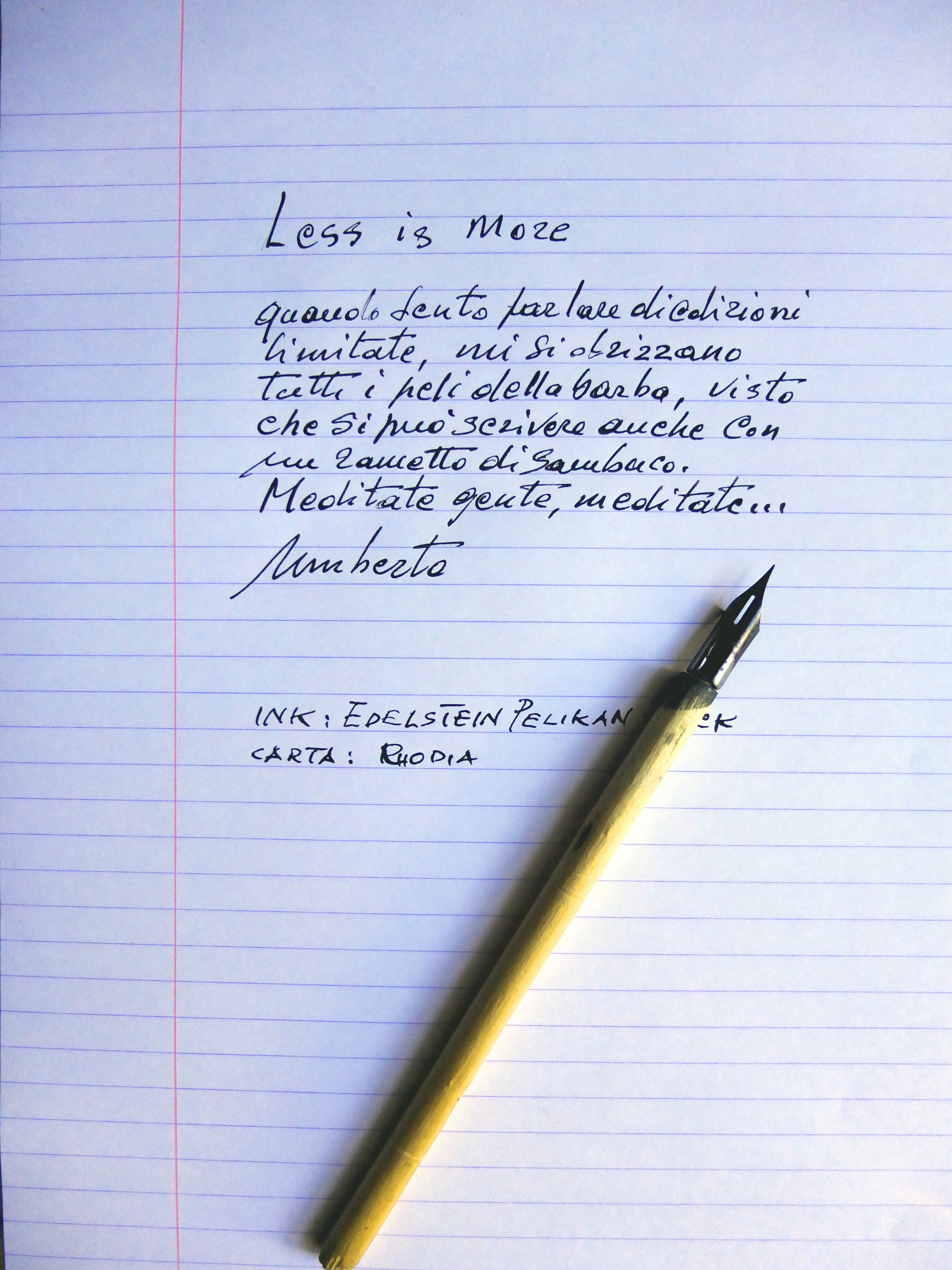 Riguardo allo scrivere con un rametto di sambuco, invece, non è un po' barare, visto che il pennino è di metallo?