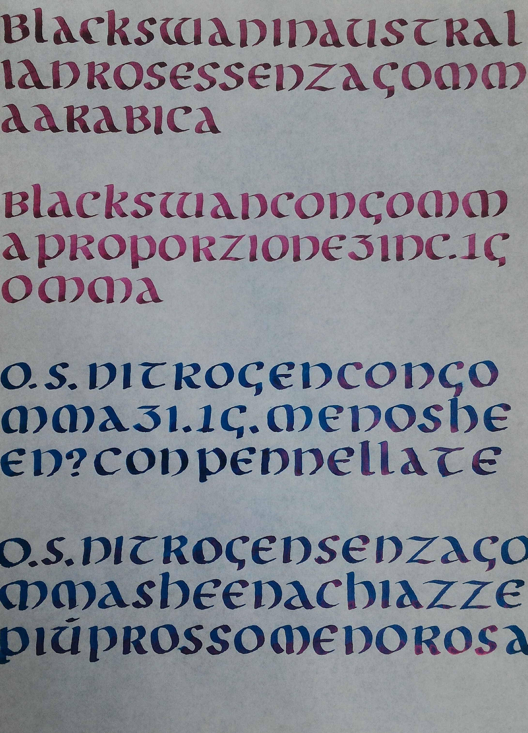 La schizza&strappa è una carta dignitosissima, e specialmente in fatto di attraversamento si comporta molto meglio di tante inkjet di maggior grammatura. L'aggiunta di gomma migliora il comportamento di entrambi gli inchiostri, ma non in modo così sensibile come avrei sperato.