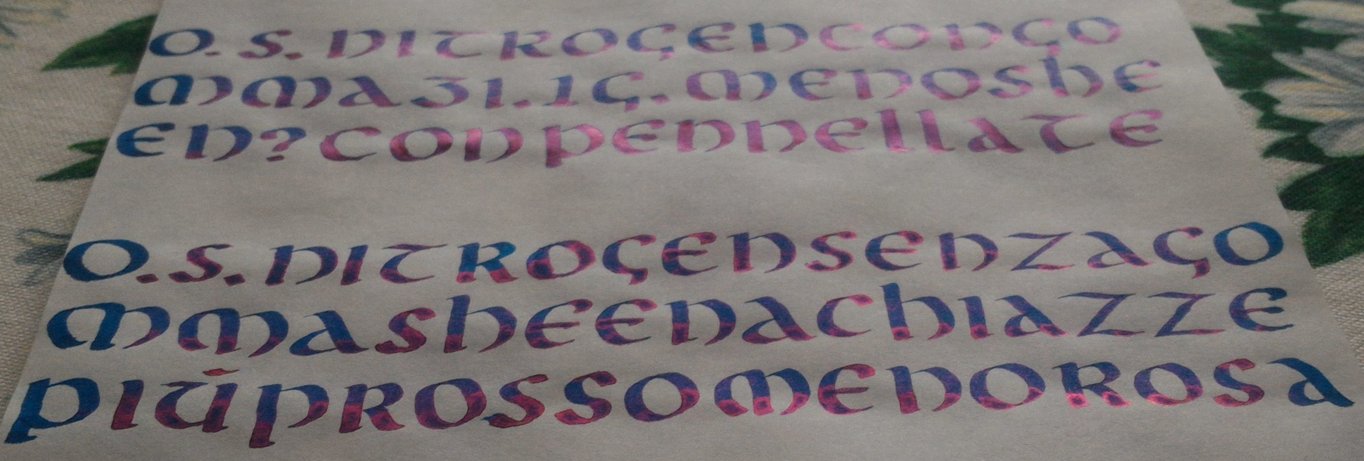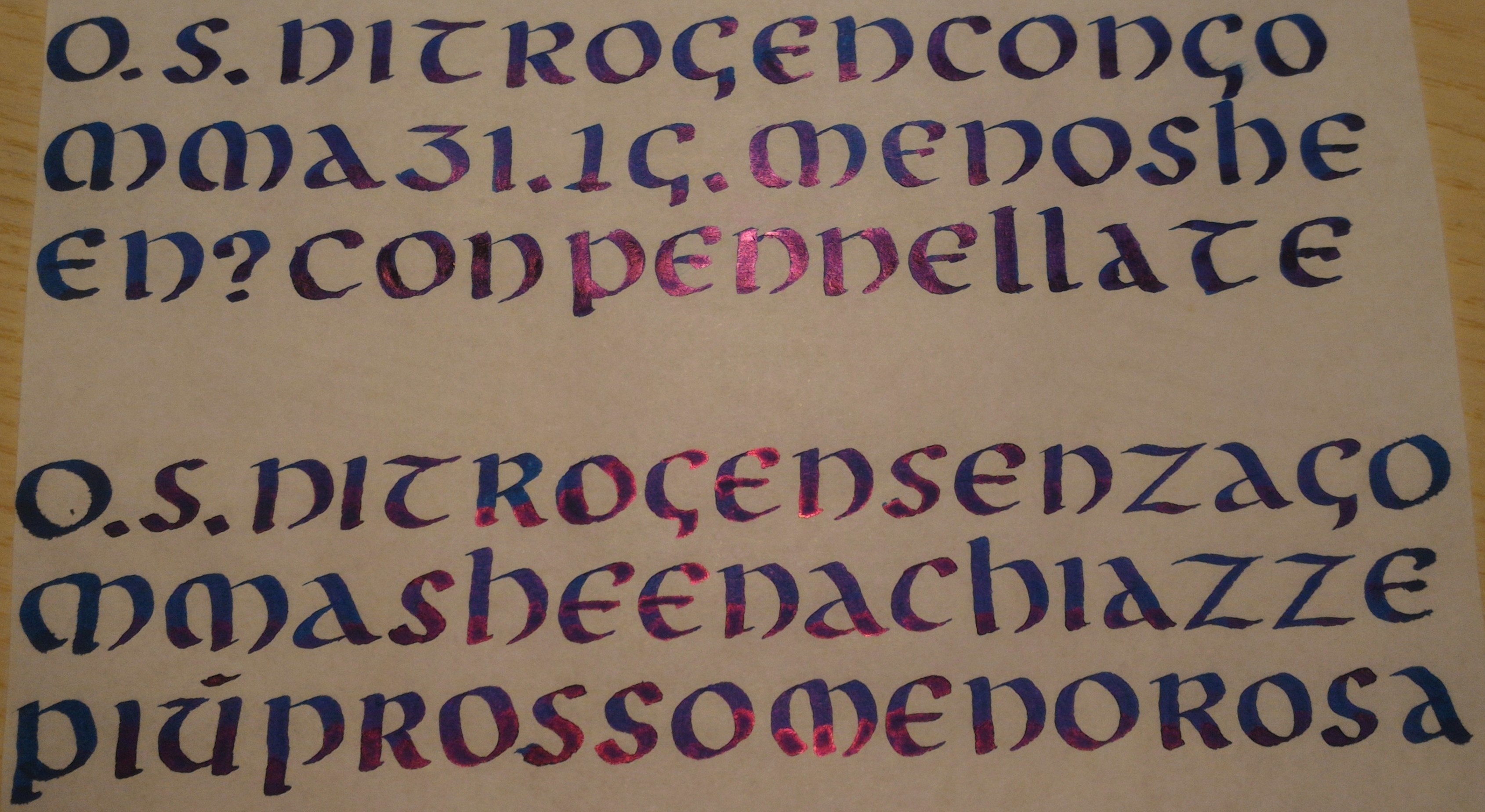 Passiamo al Nitrogen. Da puro è già abbastanza viscoso e denso, e infatti la mia principale curiosità era di vedere come la gomma interferisse con la formazione di sheen. Le righe in alto sono state scritte con inchiostro miscelato, le righe in basso con inchiostro puro. Le parole "con pennellate" sono state ripassate con un pennello per creare uno strato sheenoso uniforme. Trovo molto interessante come la gomma cambi la formazione di sheen, e un po' anche il suo colore. Il testo in alto presenza uno sheen molto più uniforme e di colore fucshia, mentre la parte scritta con inchiostro puro presenta sheen un po' a chiazze e dal colore un poco più rossiccio. Il colore di base è invece un po' più scuro nella parte gommata, al contrario di quanto accadeva col BSIAR. Da notare che il Nitrogen, sia gommato sia puro, è molto ostico nella scrittura, addirittura troppo denso e di una viscosità tale da impedire di fare linee decentemente sottili sul traverso del pennino, e ovviamente queste caratteristiche sono esaltate dall'aggiunta della gomma. Anche qua tempi di asciugatura più lunghi con la gomma. Contrariamente a quanto mi sarei aspettato, l'aggiunta di gomma non ha reso lo scritto più resistente alle sbavature una volta asciutto.