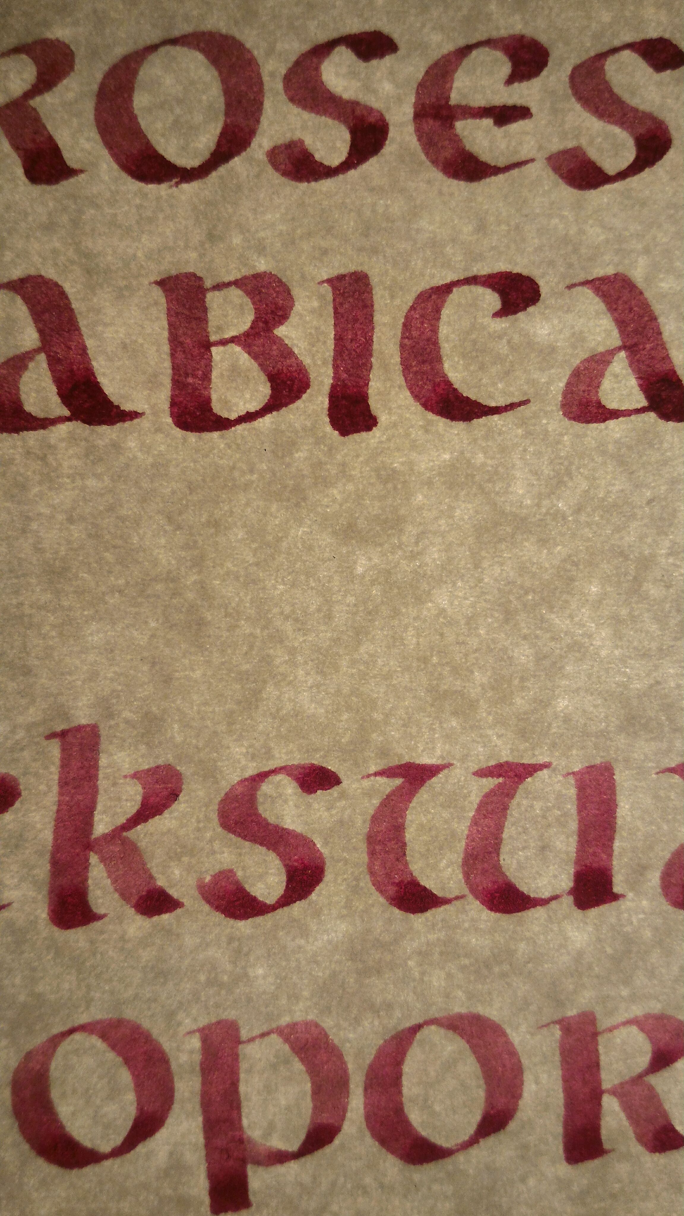 Cominciamo dal BSIAR. Da solo non è dei peggiori, ma l'aggiunta di gomma lo migliora di molto, specialmente nelle caratteristiche di flusso e feeling di scrittura che purtroppo non trapelano dalle immagini. Da "gommato" è molto più piacevole da stendere, i bordi sono più definiti, la penetrazione nella carta è minore e più lenta, l'asciugatura è molto, molto più lenta. Sono rimasto stupito dal cambio di colore che non mi aspettavo minimamente. Le caratteristiche di ombreggiatura vengono mantenute: nella parte scritta con inchiostro gommato le parti più scure sono più piccole proprio perché la maggior viscosità della miscela tende a mantenere ferme le "pozzanghere" di inchiostro. Questa foto è fatta all'interno con la lampada a led della ma scrivania. In alto inchiostro puro, in basso con gomma.