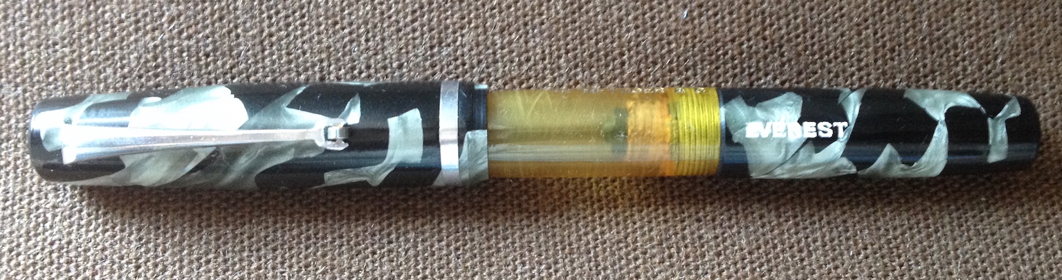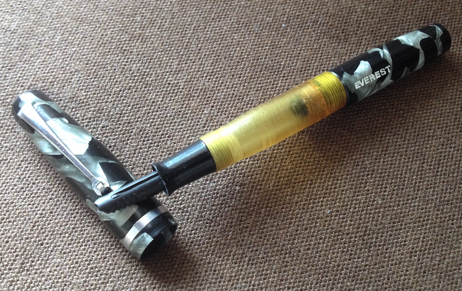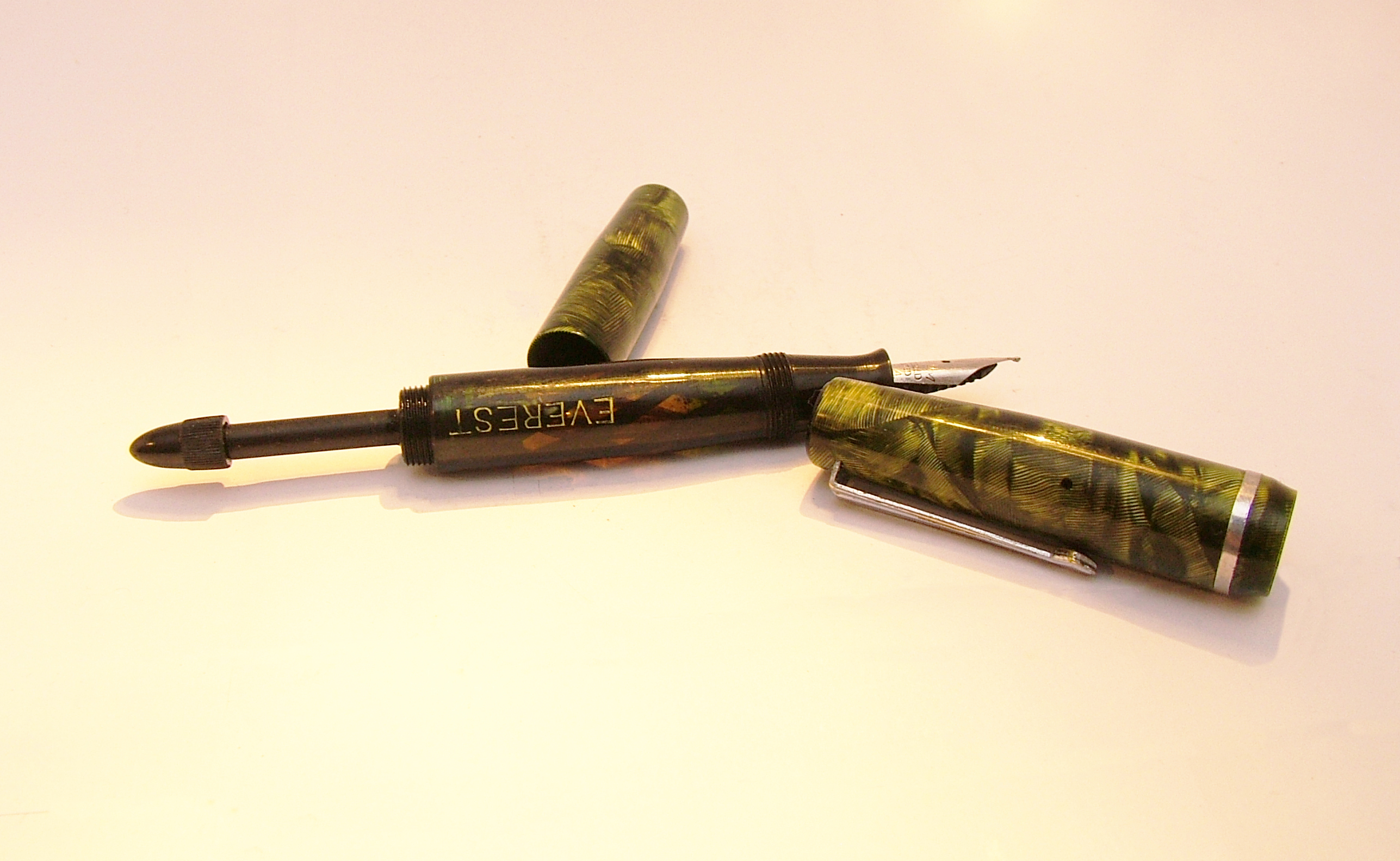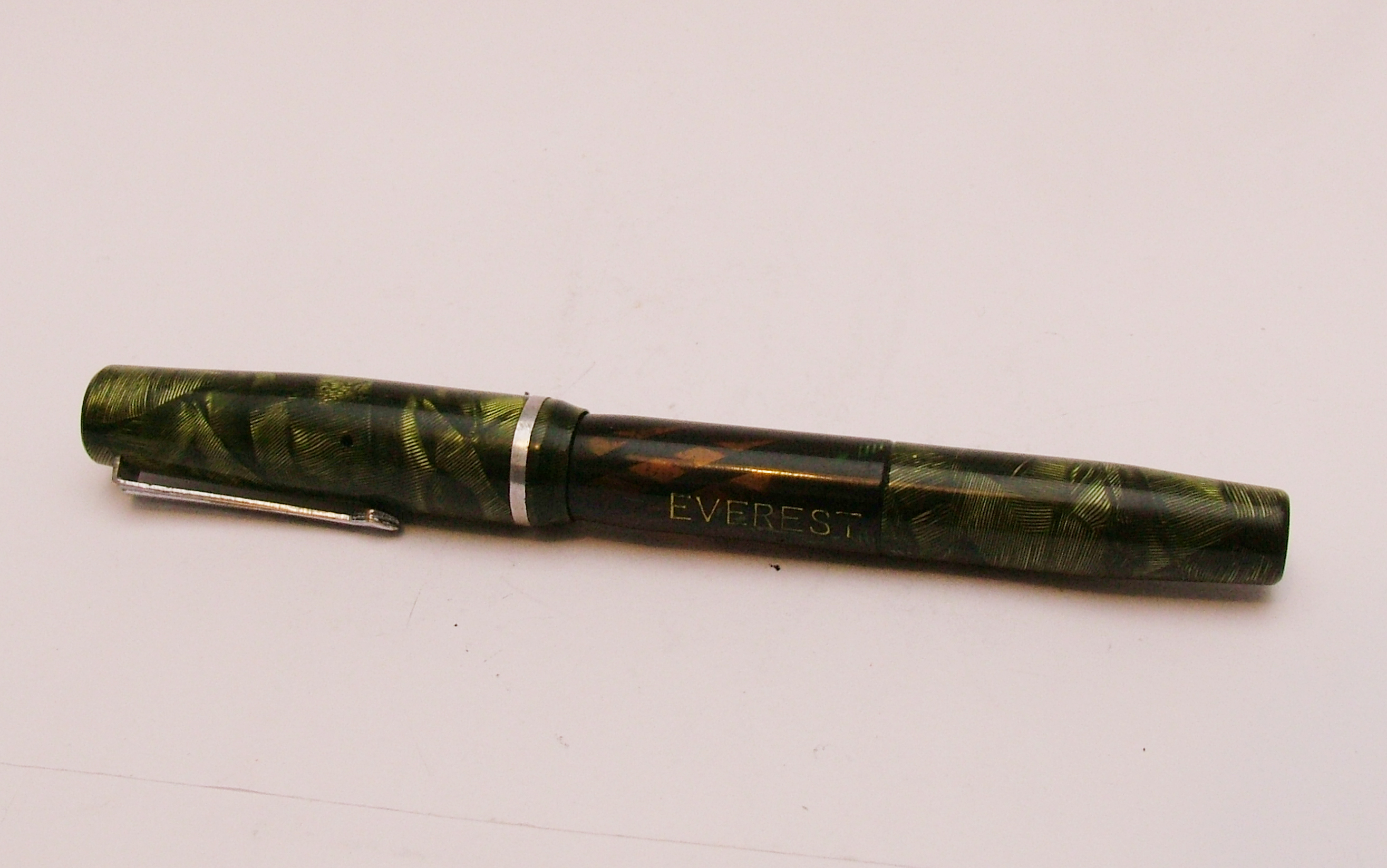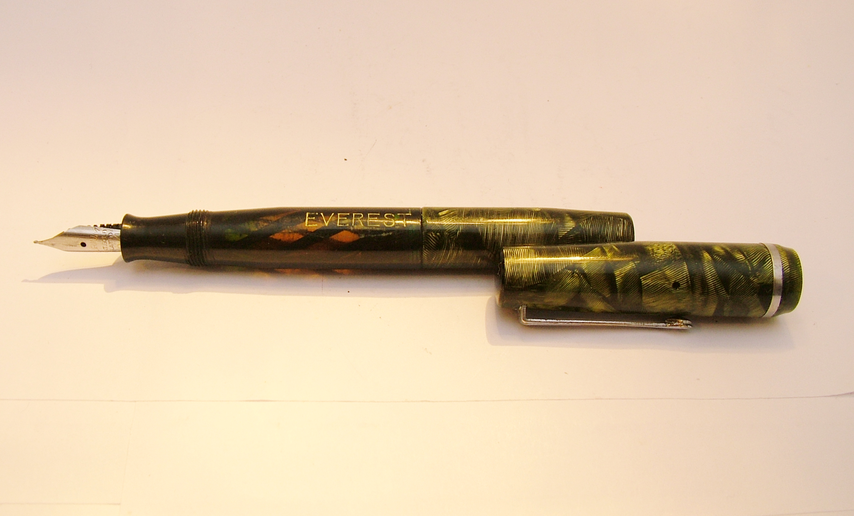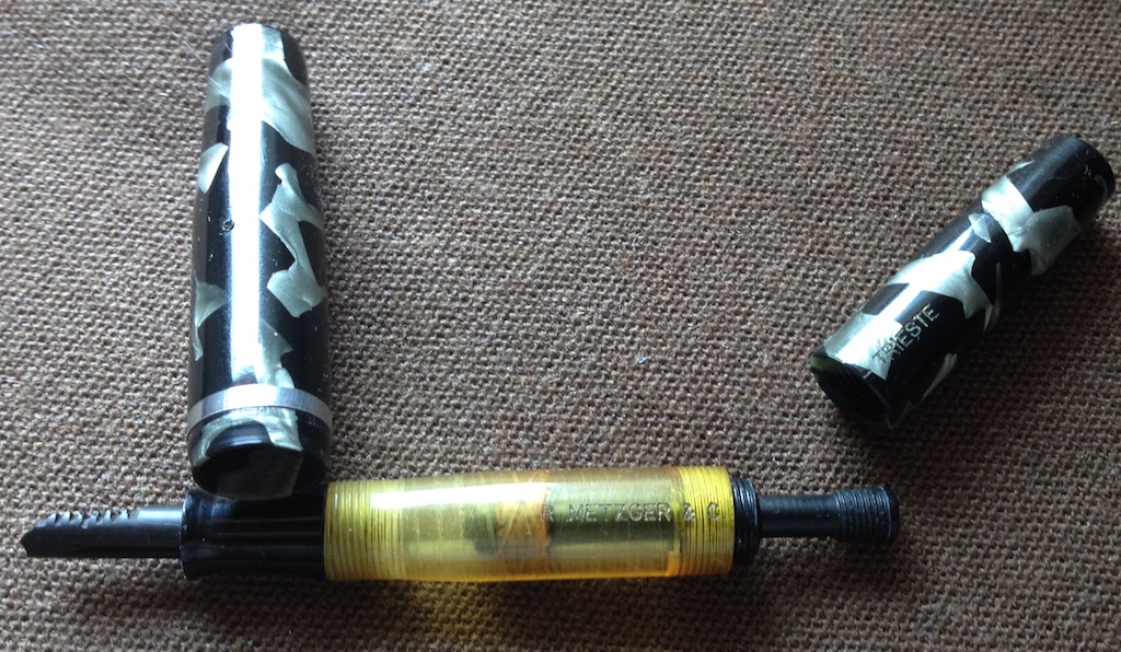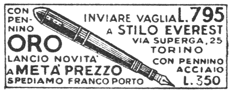 è veramente fuori dal comune. Ma la ditta si pregiava di produrre penne a inchiostro visibile. Reca sia la pubblicità del birrificio R. Metzger di Trieste, sia il marchio che sappiamo essere stato registrato nel 1947 a Torino. Sappiamo inoltre che la Stilo Everest era già attiva almeno fin dal 1943 e che spediva franco di porto previo pagamento con vaglia. Garantiva anche pennini nel metallo più nobile, ma questa ne era sprovvista purtroppo, corredata solo da una banale seconda punta in vile metallo che si è spezzata. Se qualcuno avesse un pennino Everest che gli avanza, mi avvisi in PM, grazie! La penna è lunga 13 cm, il fusto ha un diametro di 12 mm e pesa 16 gr. senza inchiostro. Il caricamento è a siringa, anch'esso inusuale per una penna torinese.