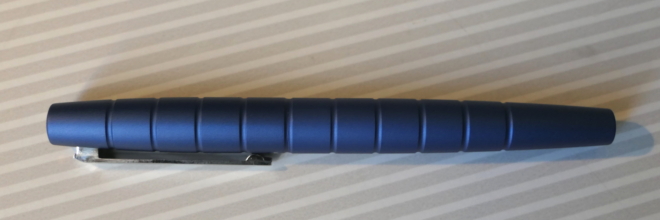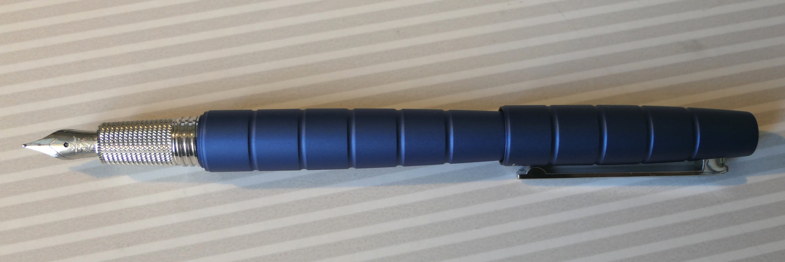 La penna è in alluminio con pennino in acciaio. Chiusa è lunga 13,7 cm. Non è facile postare il cappuccio, ma la penna è ben bilanciata e sostanziosa senza. In mano dà una sensazione di solidità, senza essere pesante. L'impugnatura zigrinata, che all'aspetto sembra quasi minaccioso, è gradevole e stabile: non ha nulla della scivolosità di alcune impugnature in metallo.