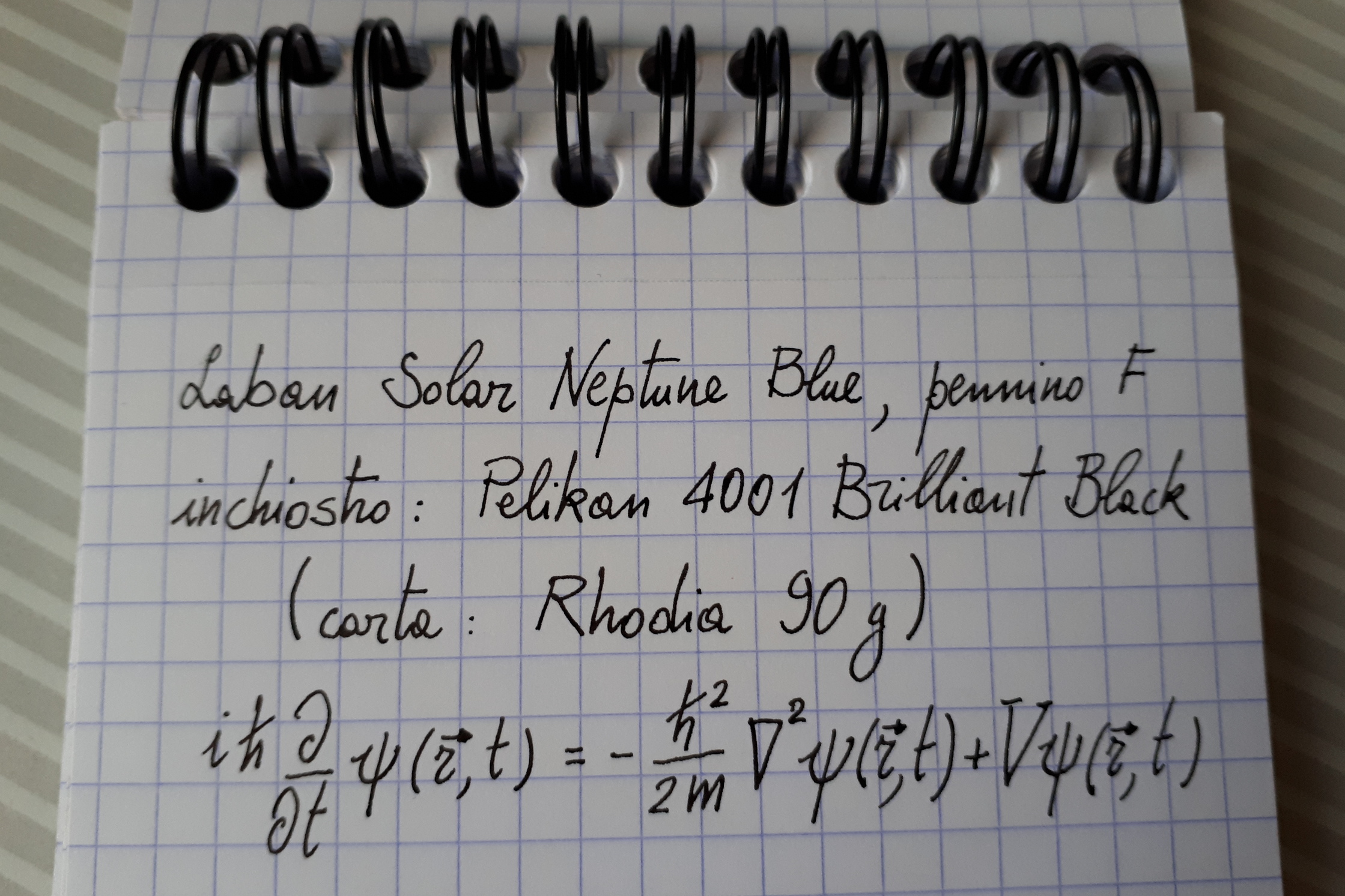 Anche se il pennino è davvero fine, il flusso di inchiostro è ricco. Inizialmente l'avevo caricata con Herbin Perle Noire, ma questo pennino con quell'inchiostro molto fluido dava dei problemi su una carta che uso quotidianamente, quella dei quaderni Leuchtturm1917: l'inchiostro si spandeva nella carta, con abbondante bleeding e feathering. Non avevo riscontrato un comportamento simile con nessun altra combinazione penna/inchiostro su questa carta. (Su carta Rhodia o Clairefontaine il problema non si presentava.) Così sono passato al più asciutto Pelikan 4001 Brilliant Black.