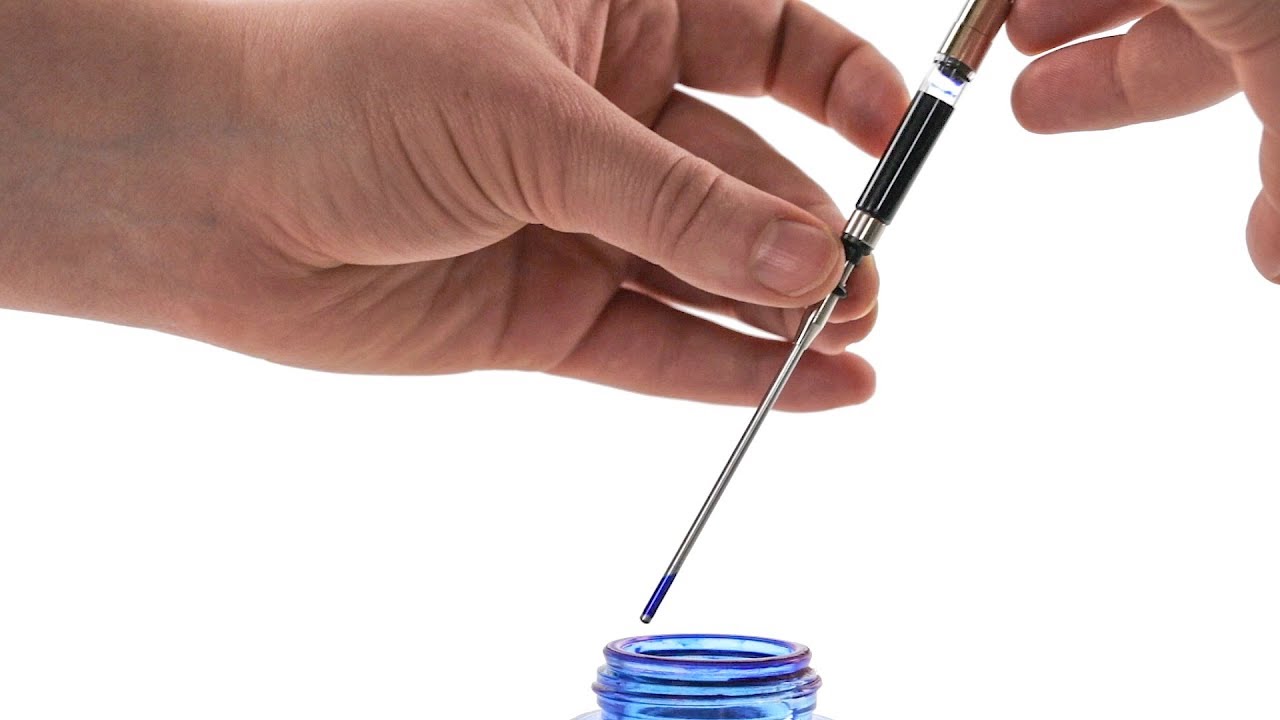 Per ricaricare, va estratto tutto il gruppo scrittura (l'equivalente del refill di una penna sfera) e immerso solo quello nell'inchiostro. Immerso in modo che il pennino sia ben sotto al livello dell'inchiostro. Stiamo parlando di una cosa simile a questa sotto, vero ? Non cambia di molto se invece di essere a rotazione è tipo aerometric, con la levetta da schiacciare