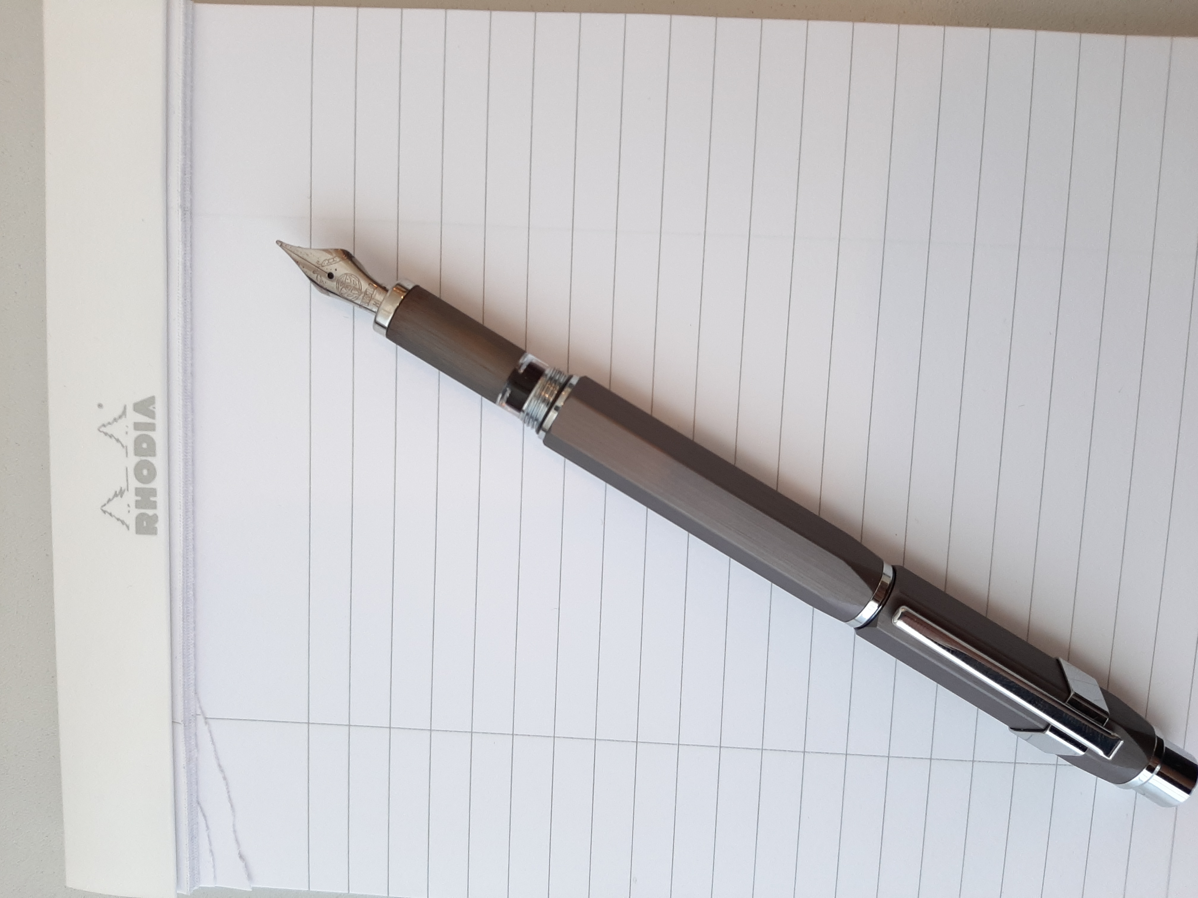Il pennino è un M in acciaio, molto buono, scorrevole , e la scrittura risulta precisa e confortevole anche grazie a un buon flusso. Si tratta di un M di tipo "giapponese", dunque non troppo abbondante, ma a me va benissimo, è una corretta via di mezzo tra un F e un M , quindi adatto a ogni carta e che dovrebbe soddisfare quasi tutti.