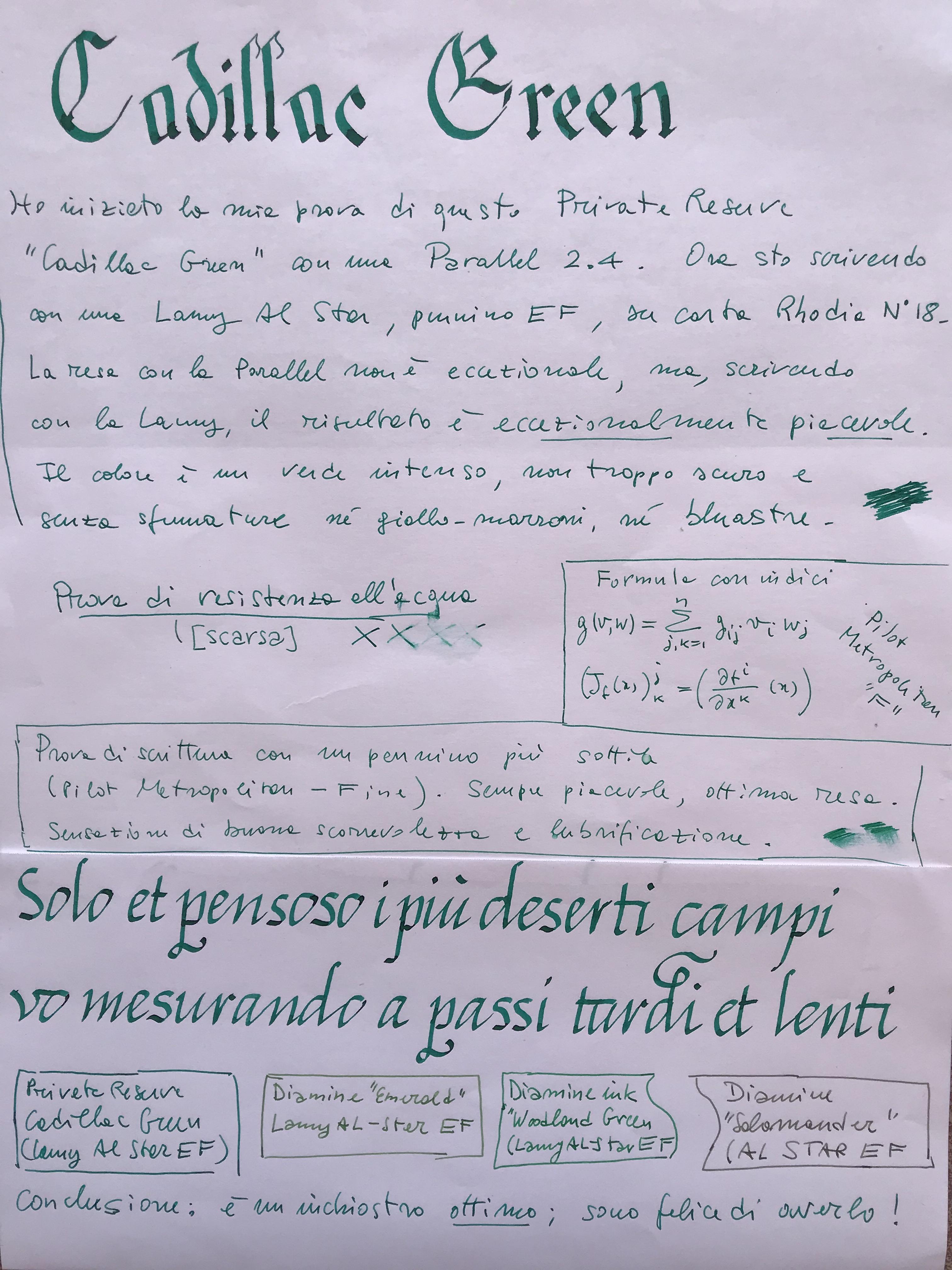 vi sottopongo la mia piccola foto-recensione del Private Reserve "Cadillac Green". Si tratta di un inchiostro verde, che negli scorsi mesi ho usato con soddisfazione. Unica pecca: poca o nulla resistenza all'acqua. La tonalità mi piace molto. È un verde autentico nel quale non vedo sfumature gialle o blu o di altri colori. Nella parte inferiore della foto c'è un confronto con gli altri miei verdi.