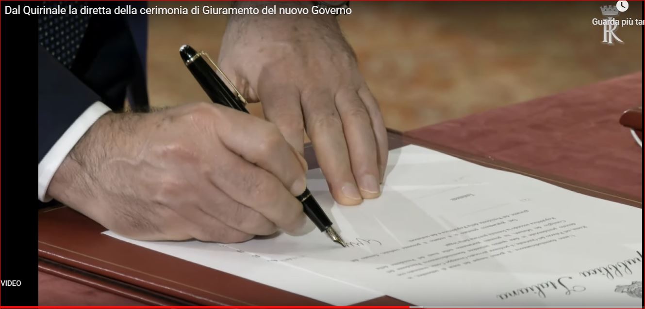 Ricordo che questo gioco lo avevamo fatto anche in occasione del primo giuramento, perchè anche allora Conte non usò la penna del Quirinale ma estrasse dal taschino la sua bella ed evidentemente amata Mont Blanc.