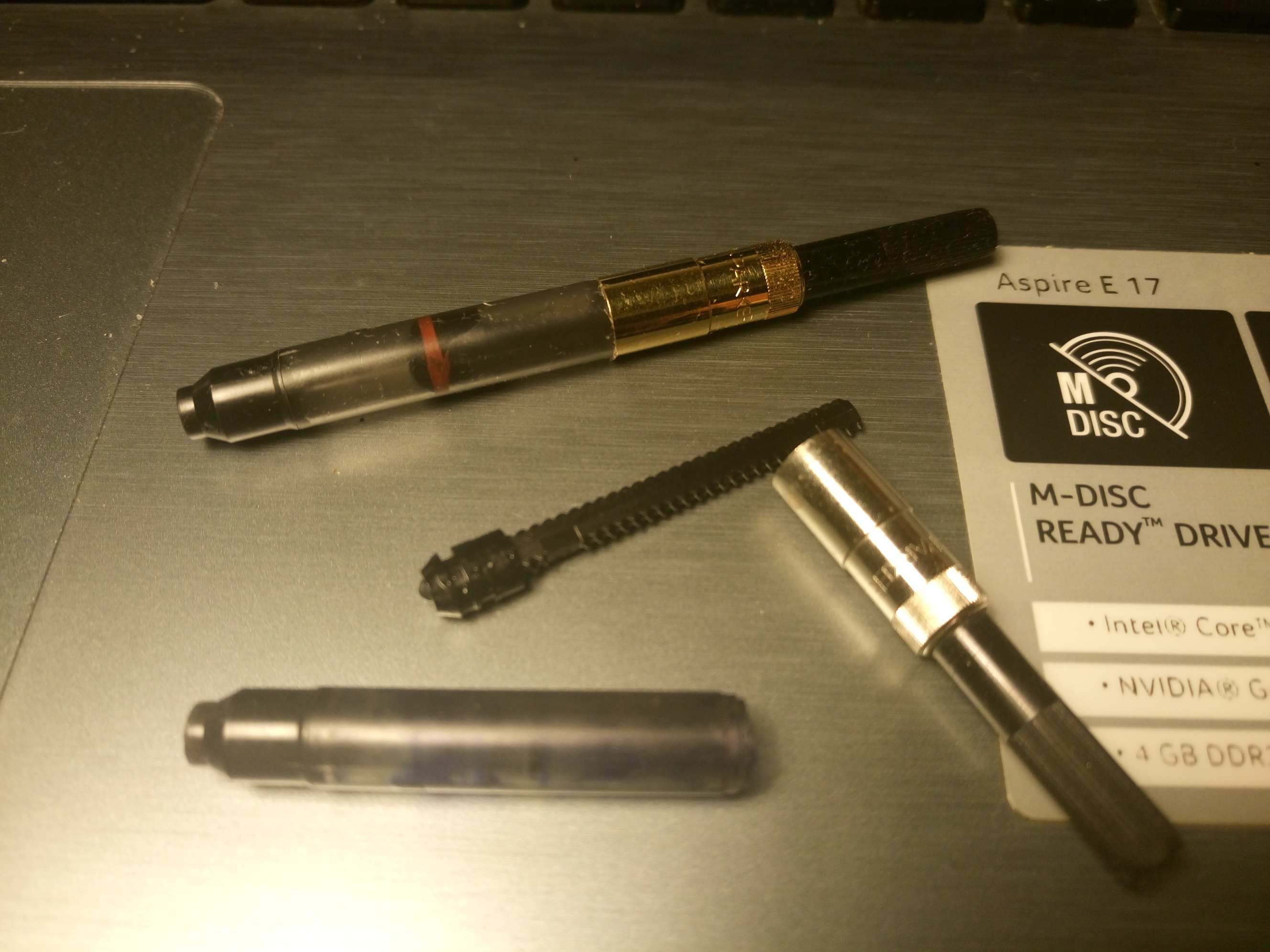 Forse, con tanta pazienza, si potrebbe provare a cambiare il sacchetto, ma ho idea che ci sia anche qualche lamella interna rotta, e allora sarebbe comunque inservibile. In fondo, siccome con le stilografiche non ci prendo più quadernate di lezioni a scuola, ma pochi appunti sul lavoro, la questione dell'autonomia è ora secondaria.