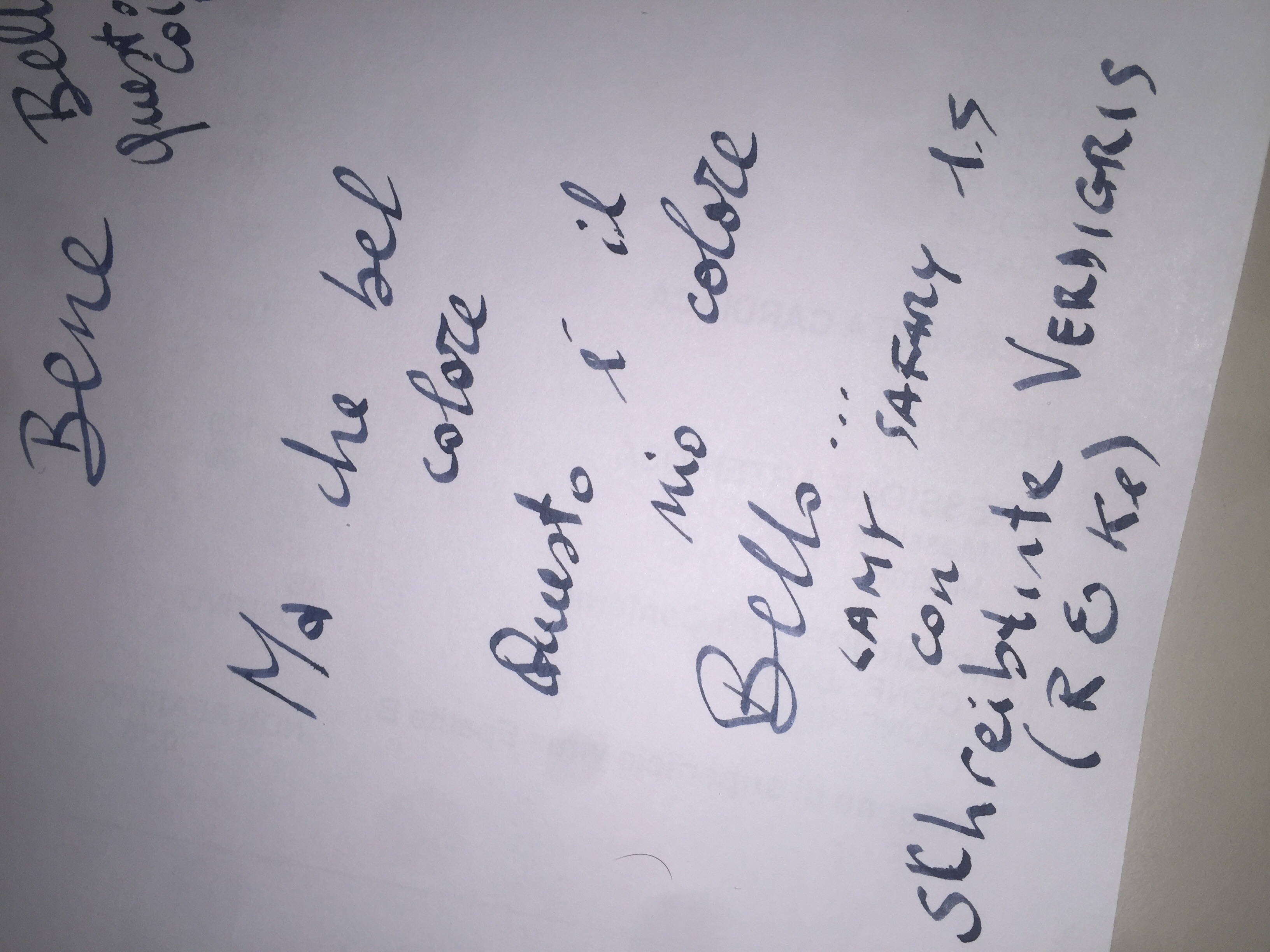 Il Verdigris è davvero bellissimo; oltretutto fa scrivere anche penne problematiche, grazie all'effetto lubrificante e alla elevata fluidità. Il dazio da pagare, per tutti questi pregi, è una certa tendenza a trapassare il foglio, superiore ad altri inchiostri. Con la carta giusta dà il massimo ed è molto fascinoso.