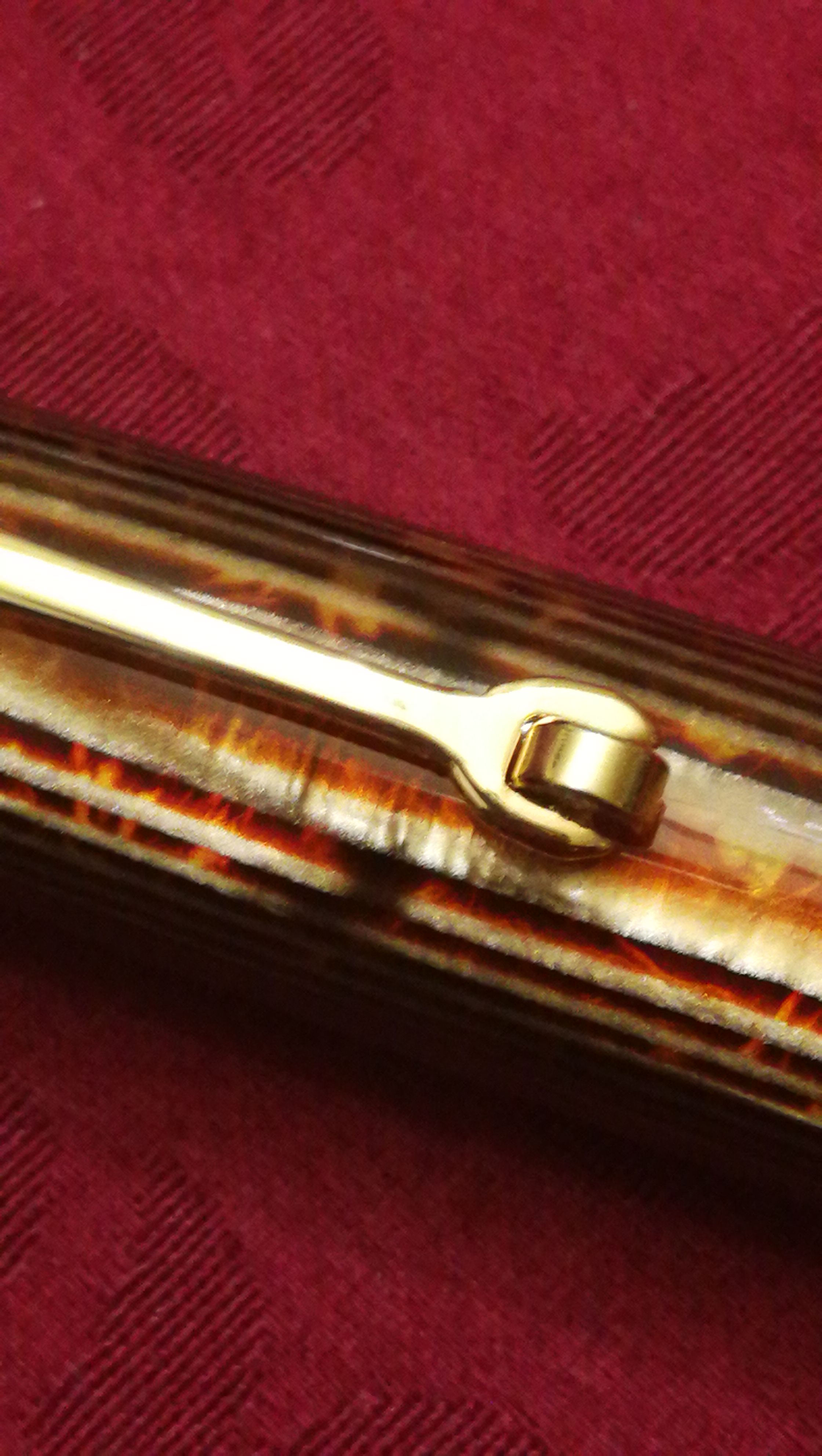 tempo fa ho avuto la fortunata occasione di acquistare la splendida ogiva Arco Brown. Normalmente la tengo in un bussolotto di plastica carica di Akkerman Sbrebrown, pronta a regalarmi gioia quando mi va di riprenderla e contemplarla. Ho notato da un po' di tempo a questa parte delle sottili linee perpendicolari alla clip. Mi chiedevo se si tratta di una semplice imperfezione o di vera e propria cristallizzazione. Ovviamente preferisco sapere per isolarla eventualmente dalle altre penne in celluloide anche quando scarica (praticamente mai).