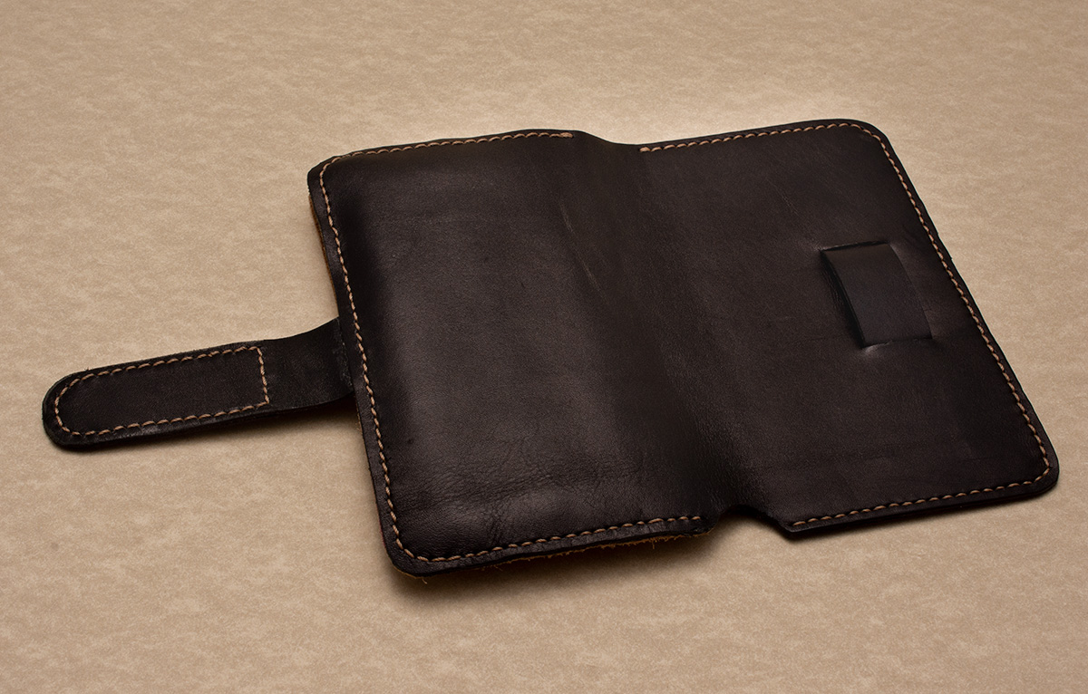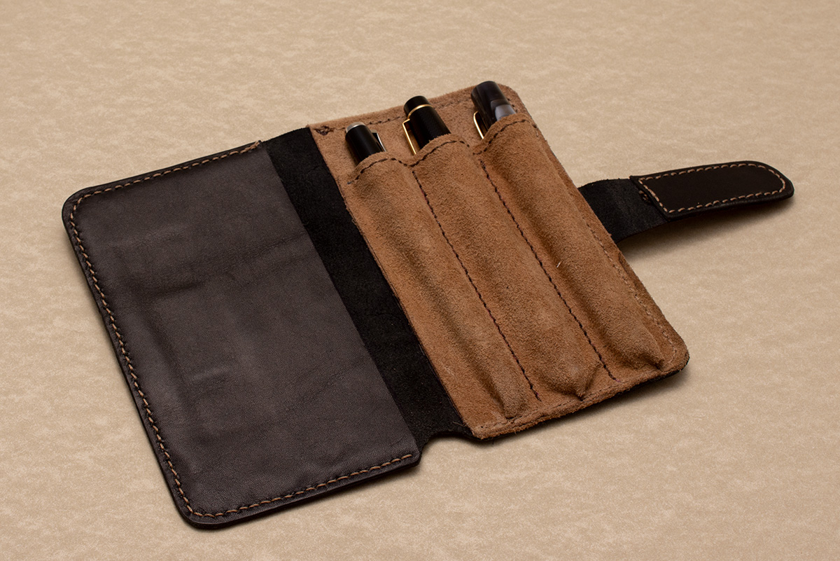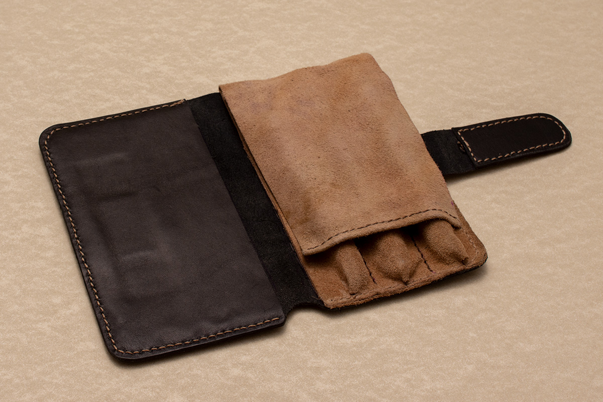 Come modello ho cercato di unire la praticità dell'apertura a libro con la morbida protezione dei portapenne a rotolo; le dimensioni da chiuso sono (16 cm x 9 cm), può contenere penne dalle dimensioni tipo Pelikan m800.