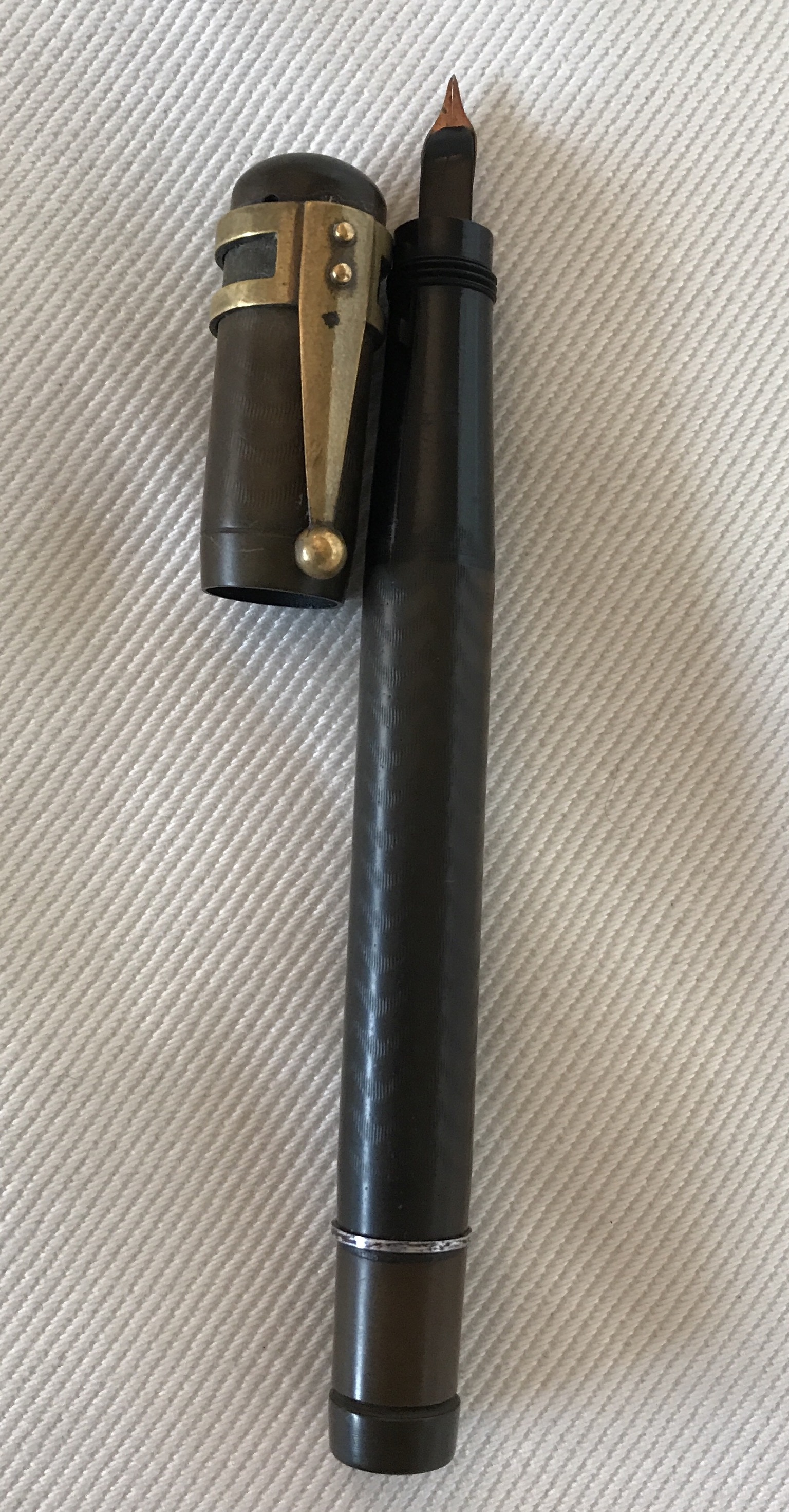 Ho scoperto che la fascia non era una riparazione ma un elemento costitutivo della penna, che serviva a congiungere sigillandole le due parti del corpo penna. Si tratta quindi di una safety in cui la manutenzione era praticamente impossibile (tipo sostituire la guarnizione di sughero), a patto di ricostruire (ma come?) la fascia di giunzione. Purtroppo ho constatato che l'albero a elica è spezzato in un punto, mentre l'albero completo col pennino fa resistenza ad uscire. Tenterò ancora.