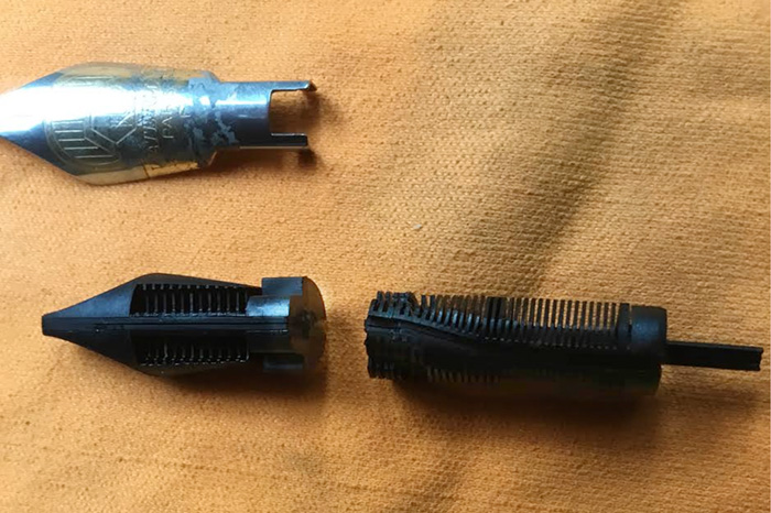 Forzando troppo. E' il motivo principale per cui, in una penna da smontare che è stata per troppo tempo ferma con residui di inchiostro, io evito di usare - se possibile - materiali per fare presa come la gomma; non è sbagliato come concetto, e può essere imprescindibile, ma personalmente mi impedisce di percepire quanta forza sto applicando, e quindi mi può capitare quella roba lì. Provo sempre prima con acqua e tempo, poi decido cosa fare con calma.
