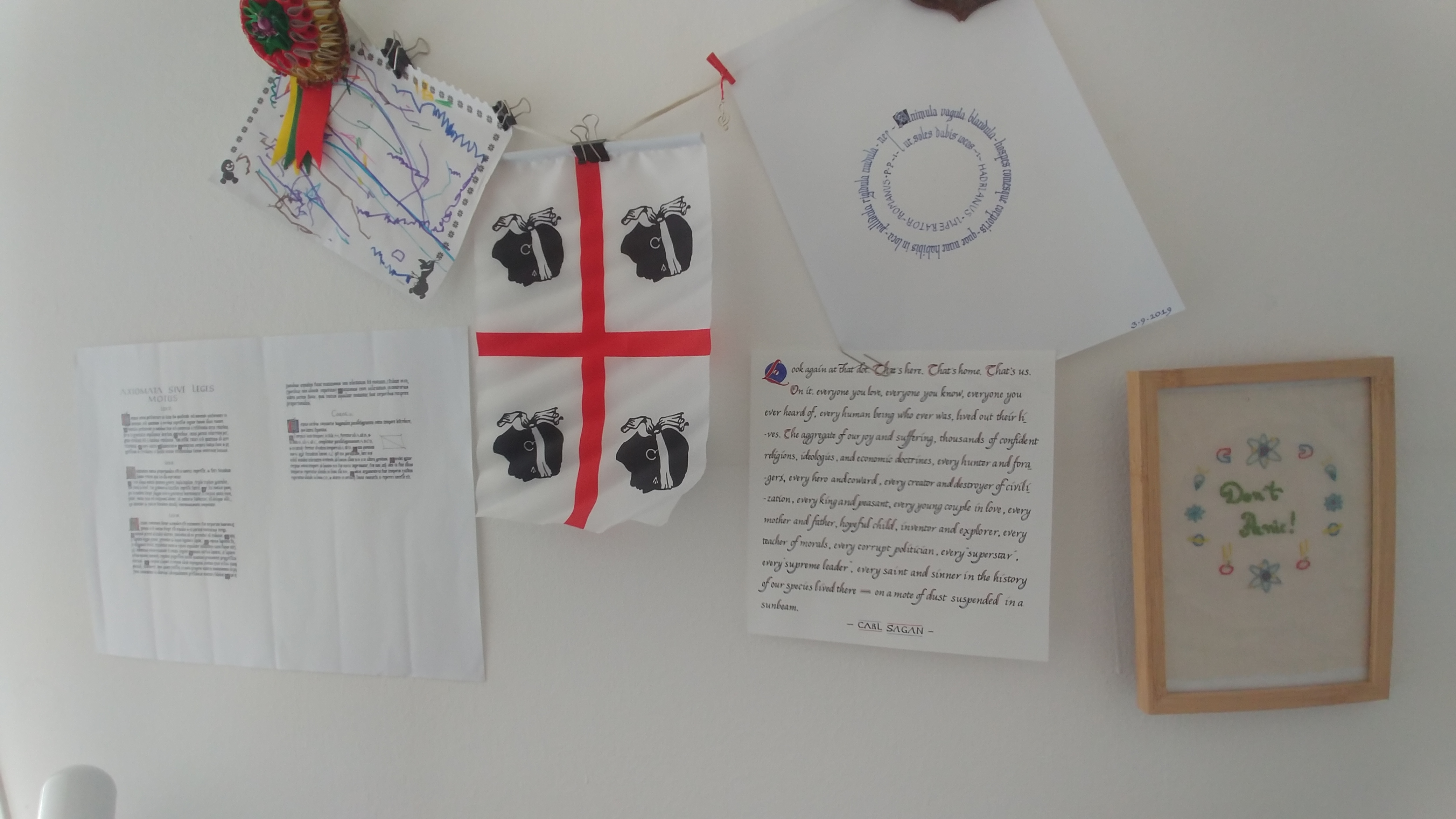 Con me, ho scelto di portare uno scampolo di casa: al di sopra della scrivania alla quale trascorro lunghe ore, campeggiano i ricordi di casa. Una rosetta, elemento della bardatura del cavallo nel carnevale della mia città (sa Sartiglia) e la bandiera quadripartita vegliano sui libri accademici.