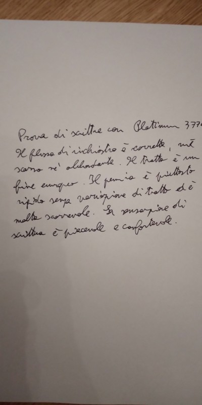 Comunque, una volta pulita, la penna ha preso a funzionare a poco a poco, finchè il flusso di inchiostro si è stabilizzato e ho potuto apprezzare una scrittura regolare con flusso di inchiostro costante nè abbondante nè scarso. Il pennino è assai rigido con assenza totale di variazione di tratto, cosa che personalmente gradisco poco. Pur essendo un medio scrive come un vero fine europeo. A diffferenza dei pennini Sailor che finora ho provato questo qui dà una sensazione più gradevole di scrittura, avendo una sorta di molleggio dell'intero pennino, pur mostrando, come ho scritto, assenza di variazione di tratto.