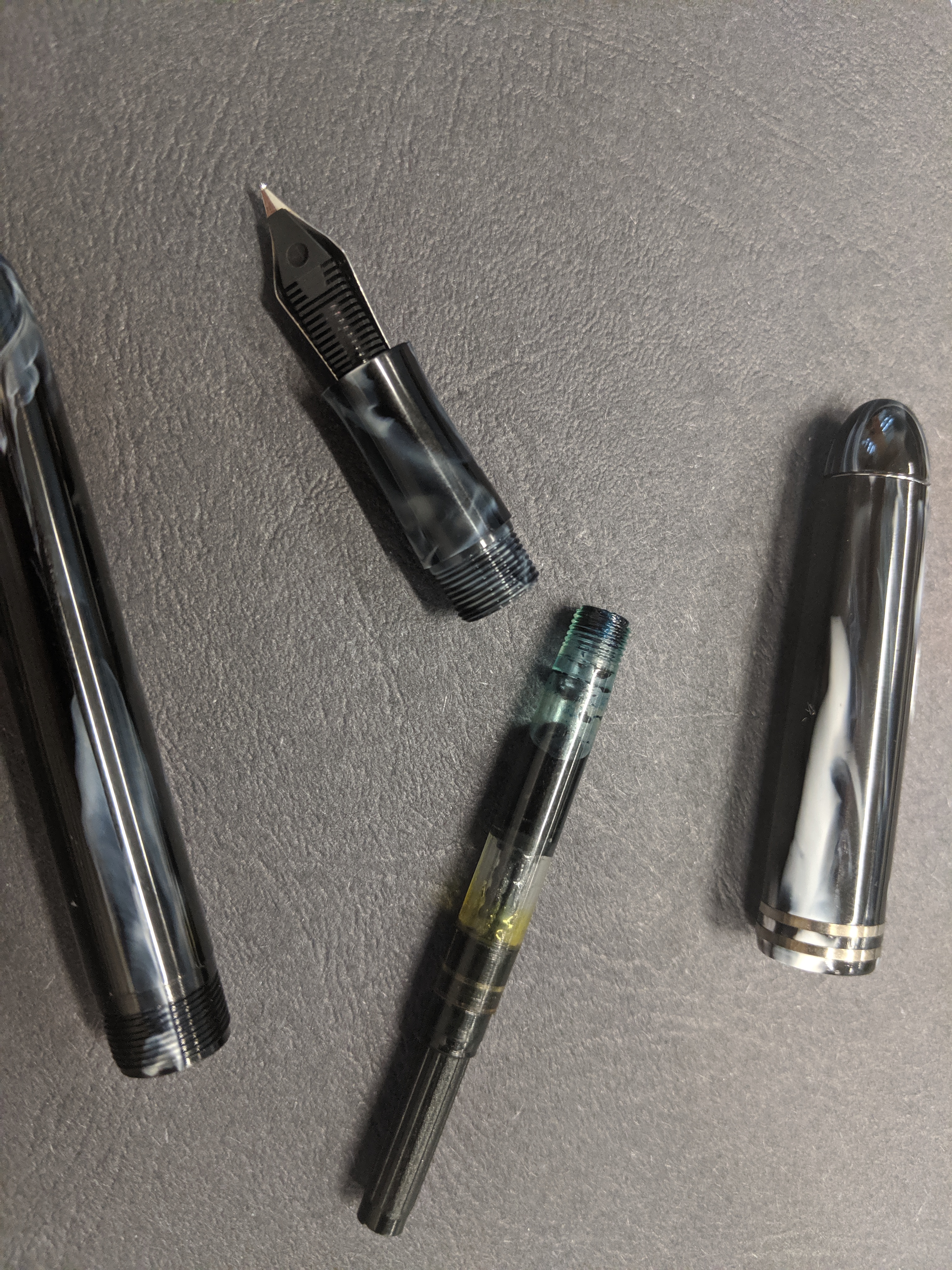 Avei voluto sostituirlo con qualcos'altro ma ho scoperto che ha uno spessore molto maggiore di qualsiasi altro pennino io abbia per le mani, per cui non riesco a fissare altri pennini, pennino e alimentatore si sfilano da soli dalla sezione...