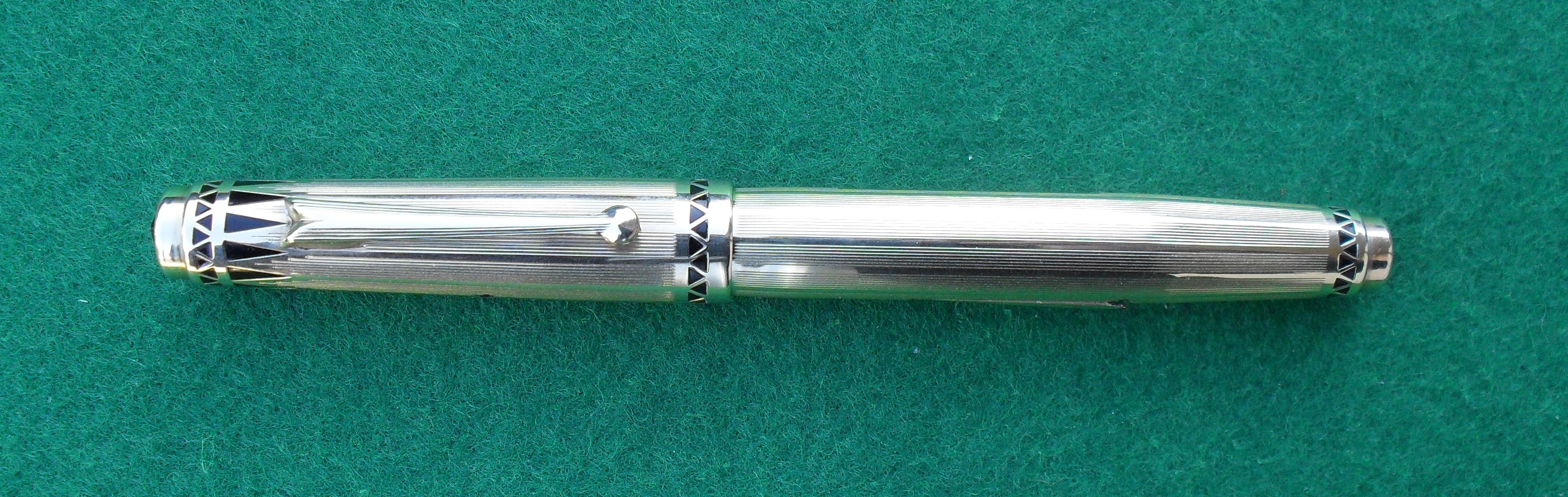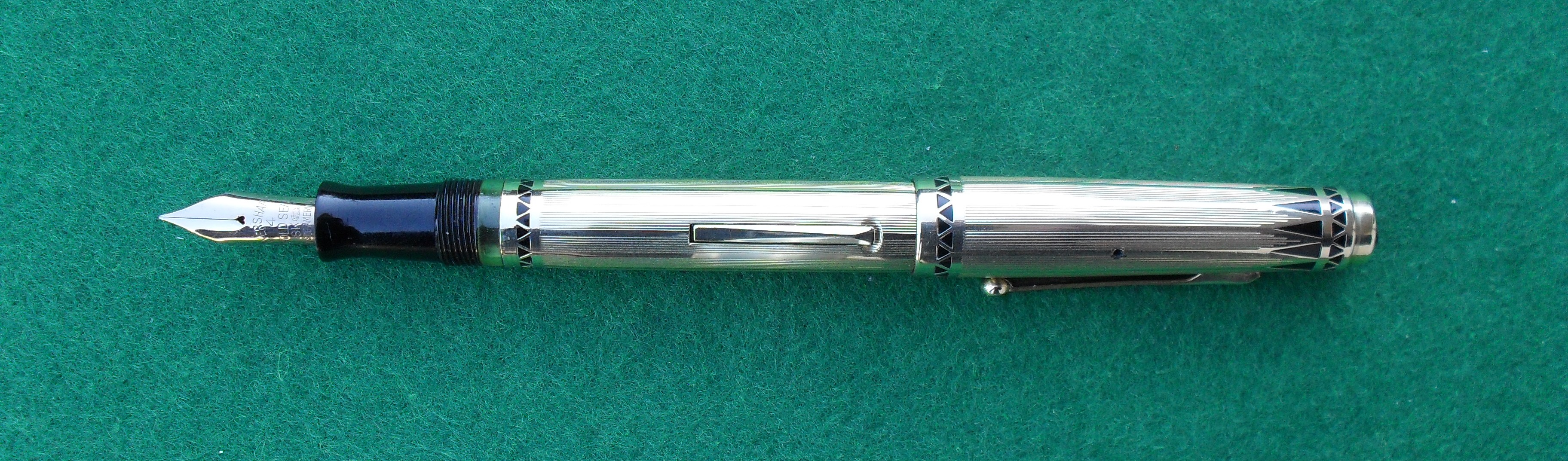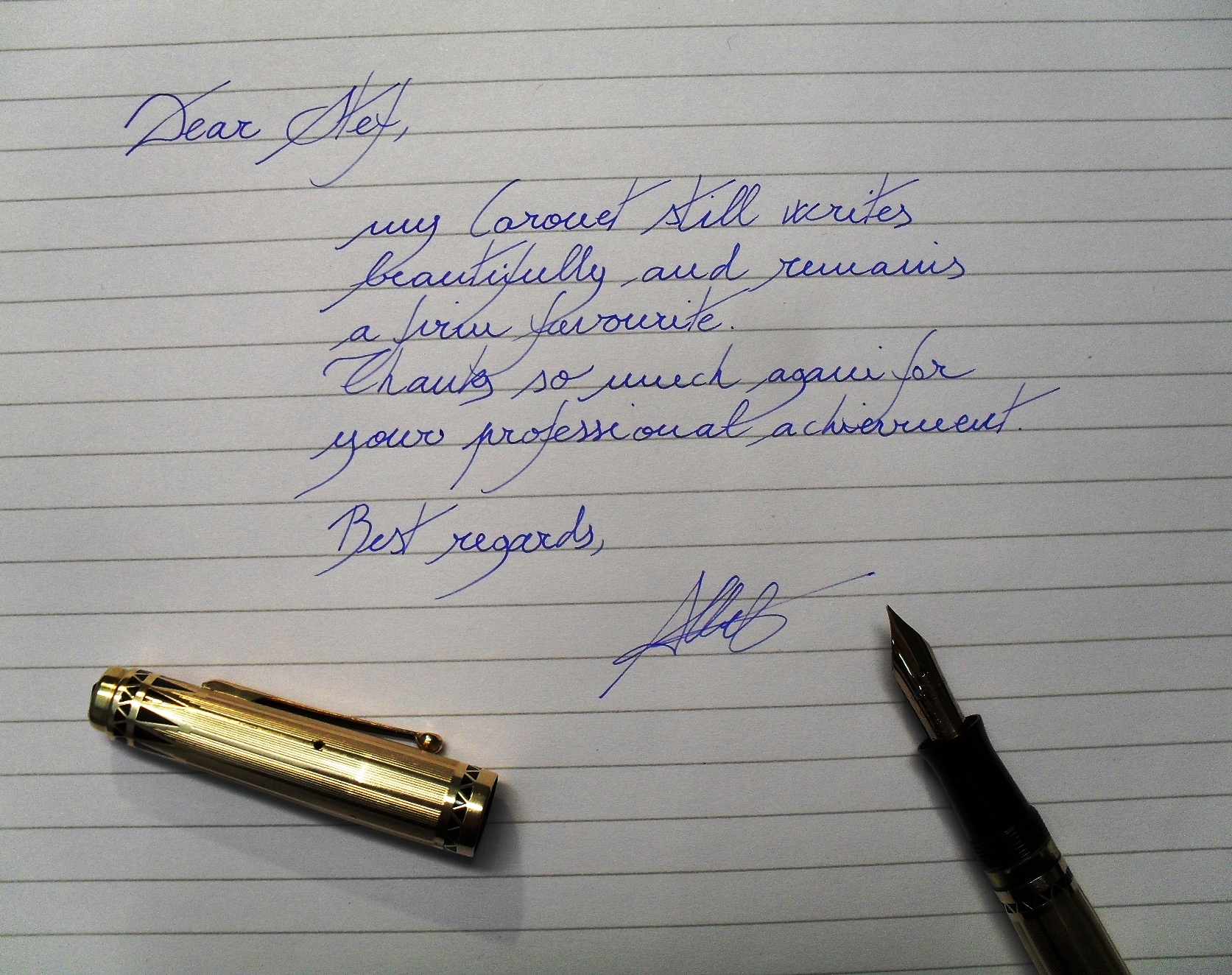 Il pennino a punta fine scorre molto bene ed il flusso è costante, deciso ma non abbondante. La penna scrive anche solo con il proprio peso. Si tratta naturalmente d’una stilografica che è in grado d’impressionare e che, per la sua appariscenza, deve piacere. Fra le “gold filled” rimane, a mio parere, una delle più eleganti ed affascinanti.